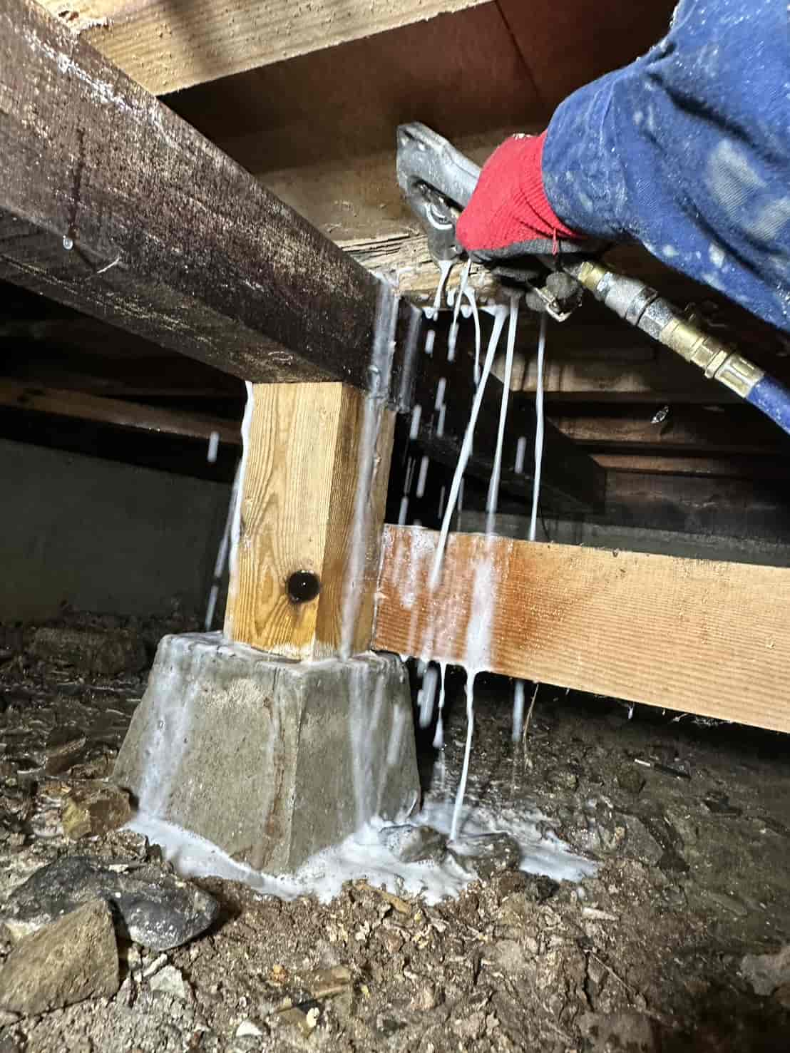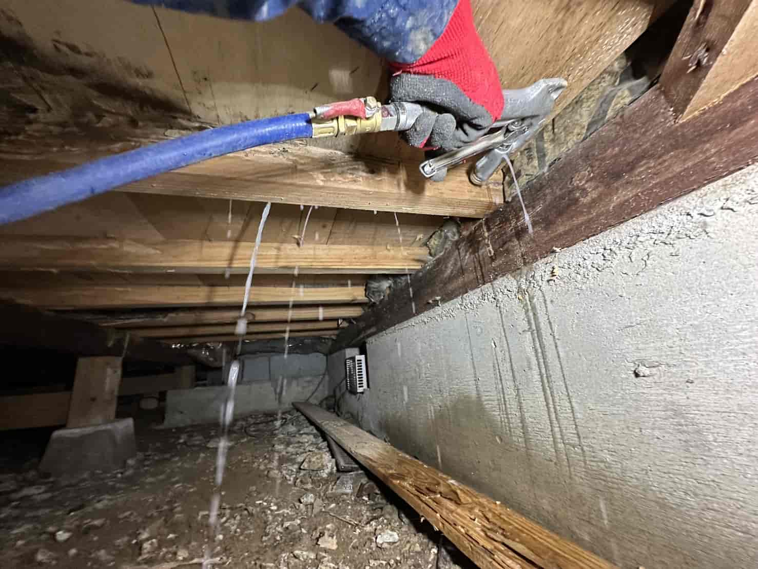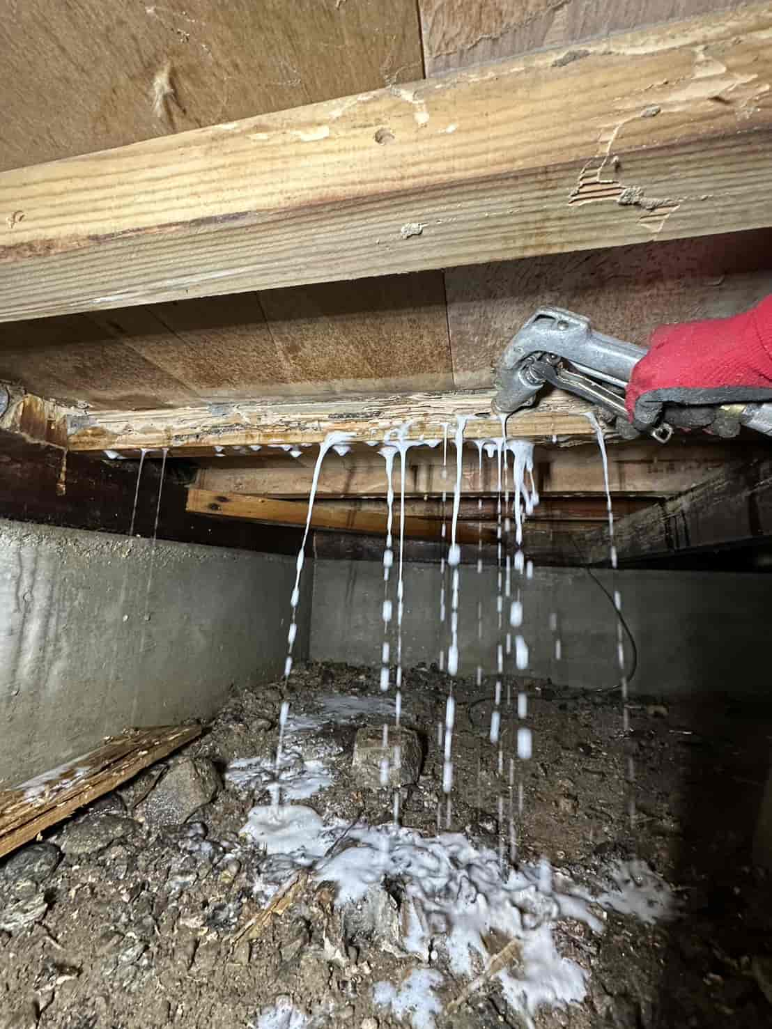 この蟻道がある場合、建物内部でシロアリが活動している可能性が非常に高い状態となります。さらに床下の調査を進めると、被害は収納部分だけでなく住宅の構造部分にも広がっていました。