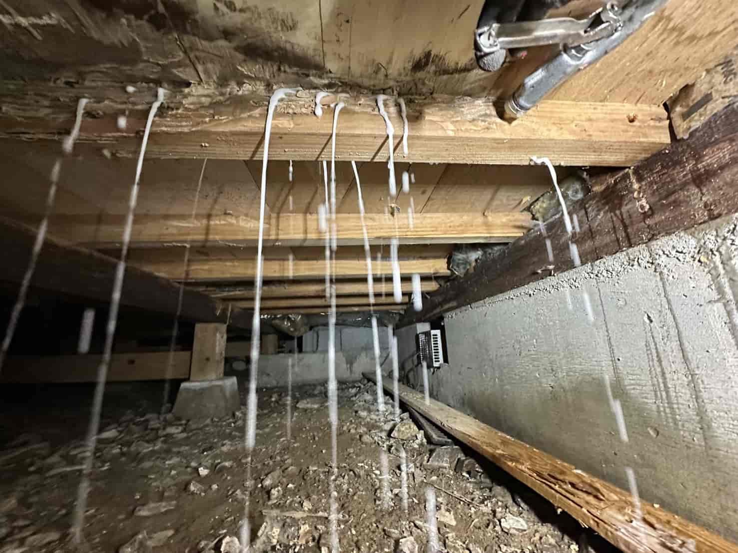 床下に入ると、基礎部分や木部にシロアリの蟻道(ぎどう)が多数確認されました。蟻道とは、シロアリが地中から建物内部へ侵入する際に作る土のトンネルです。