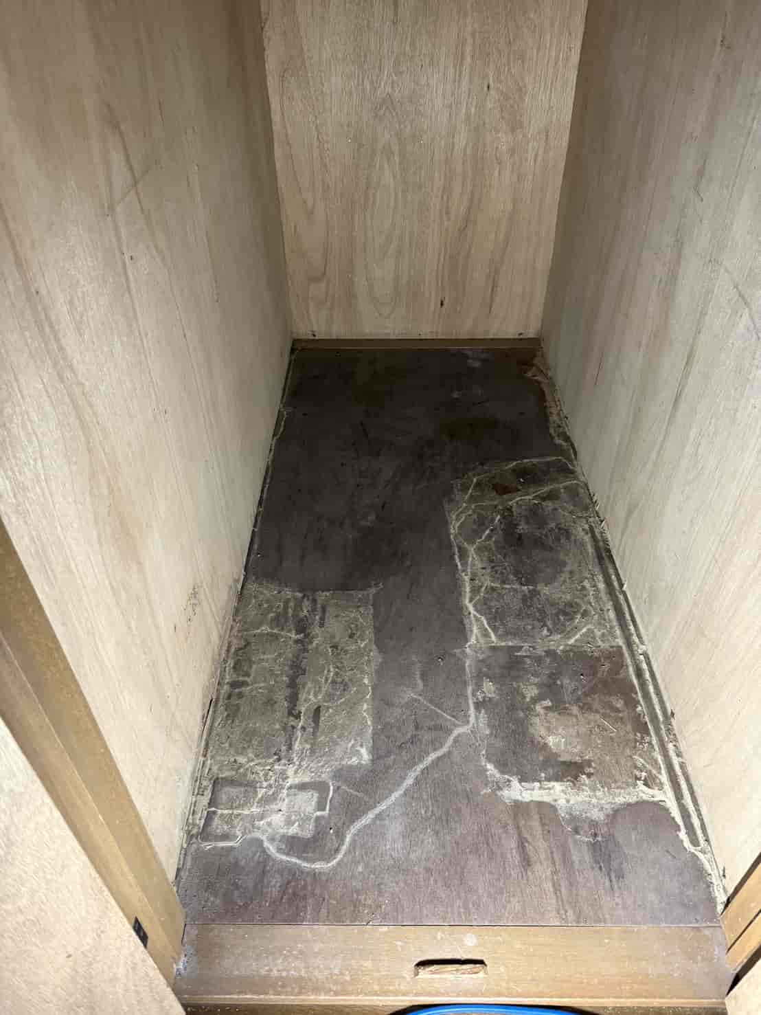 現地で階段下の収納を確認すると、床板の一部が柔らかくなっており、木材が劣化している状態でした。
