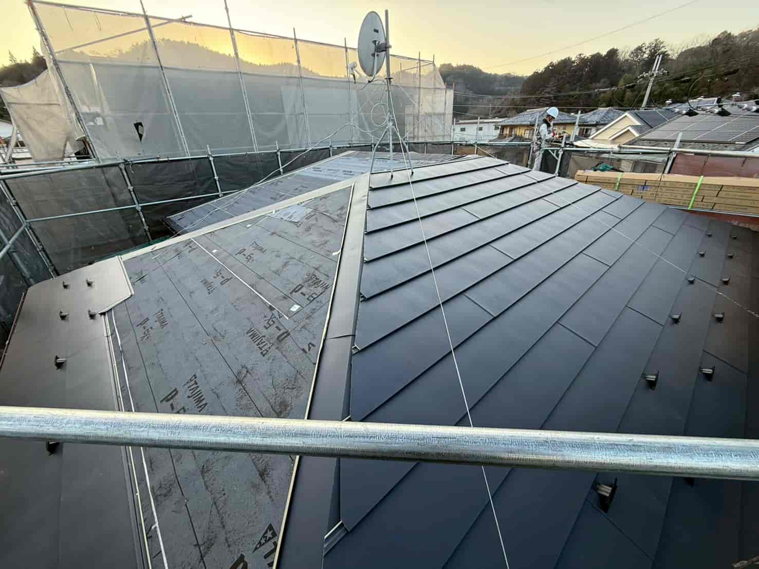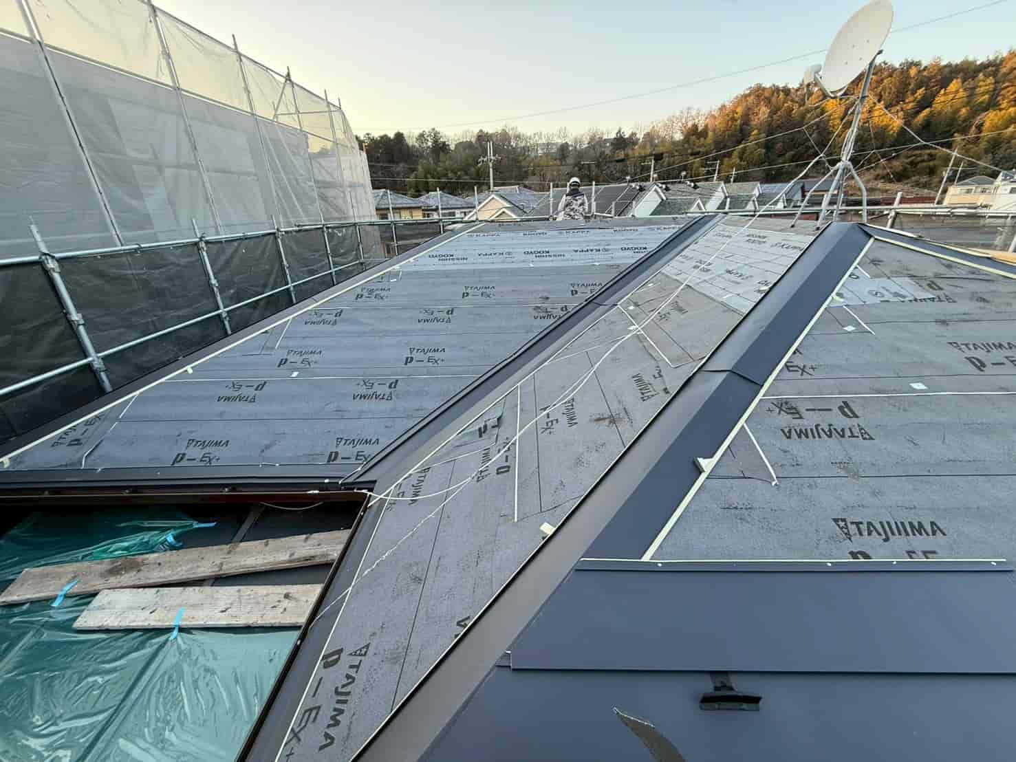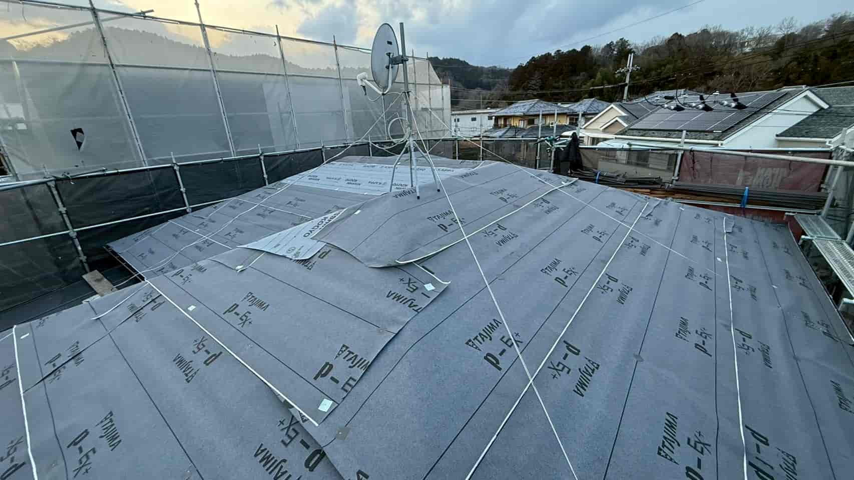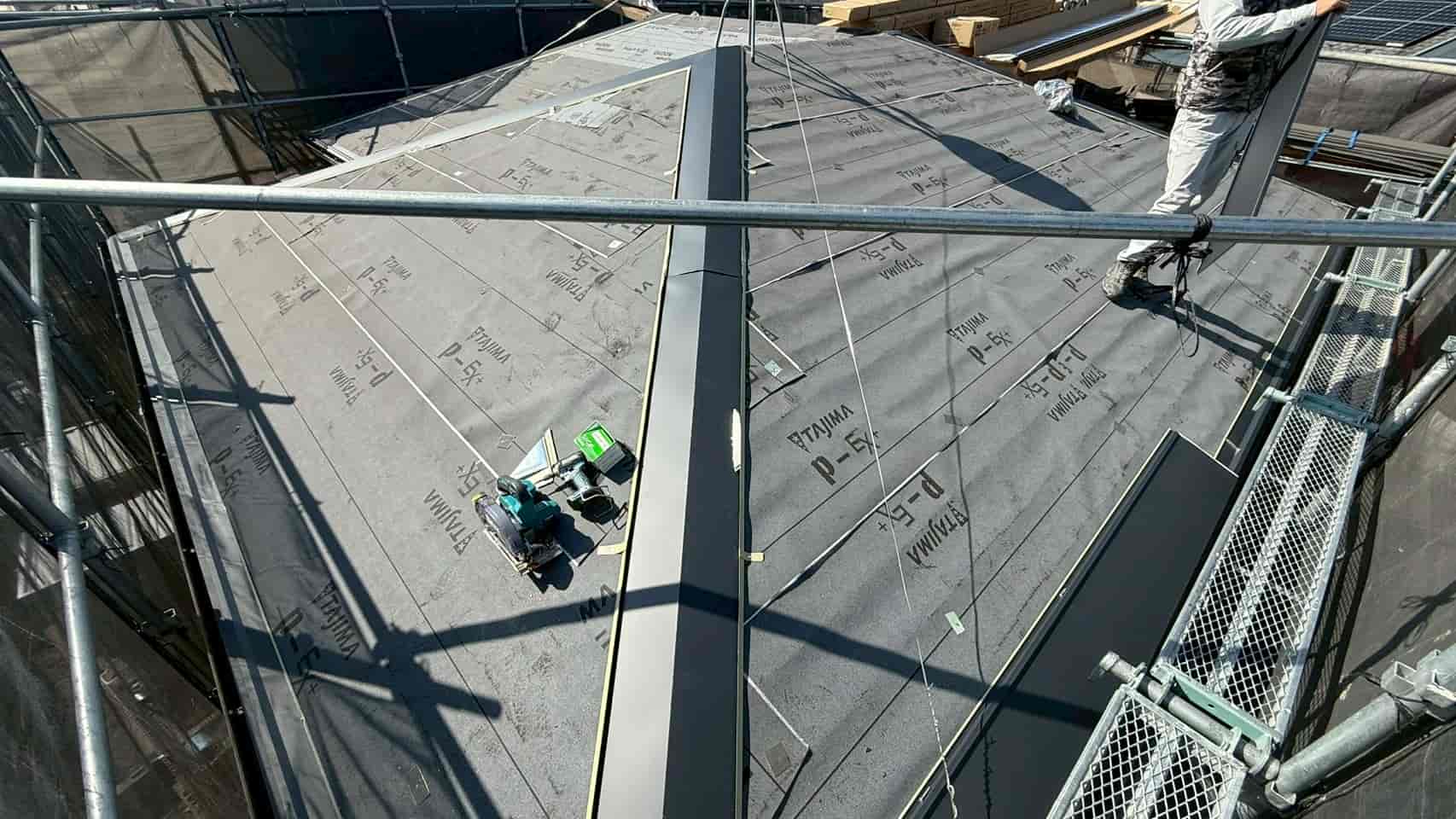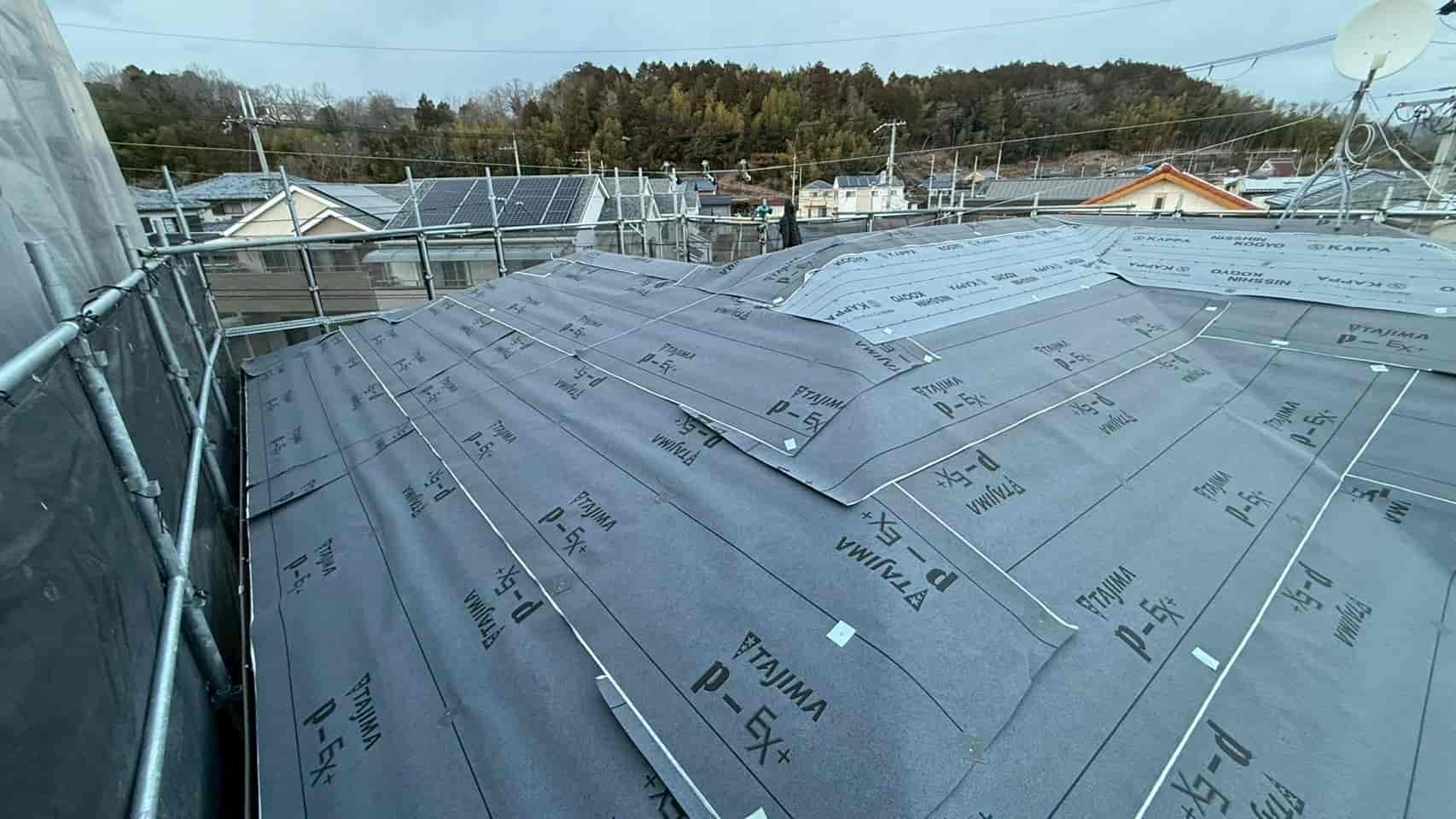 既存屋根の上から新たにルーフィングを施工しました。この防水層が雨水の侵入を防ぐ最も重要な部分となります。
