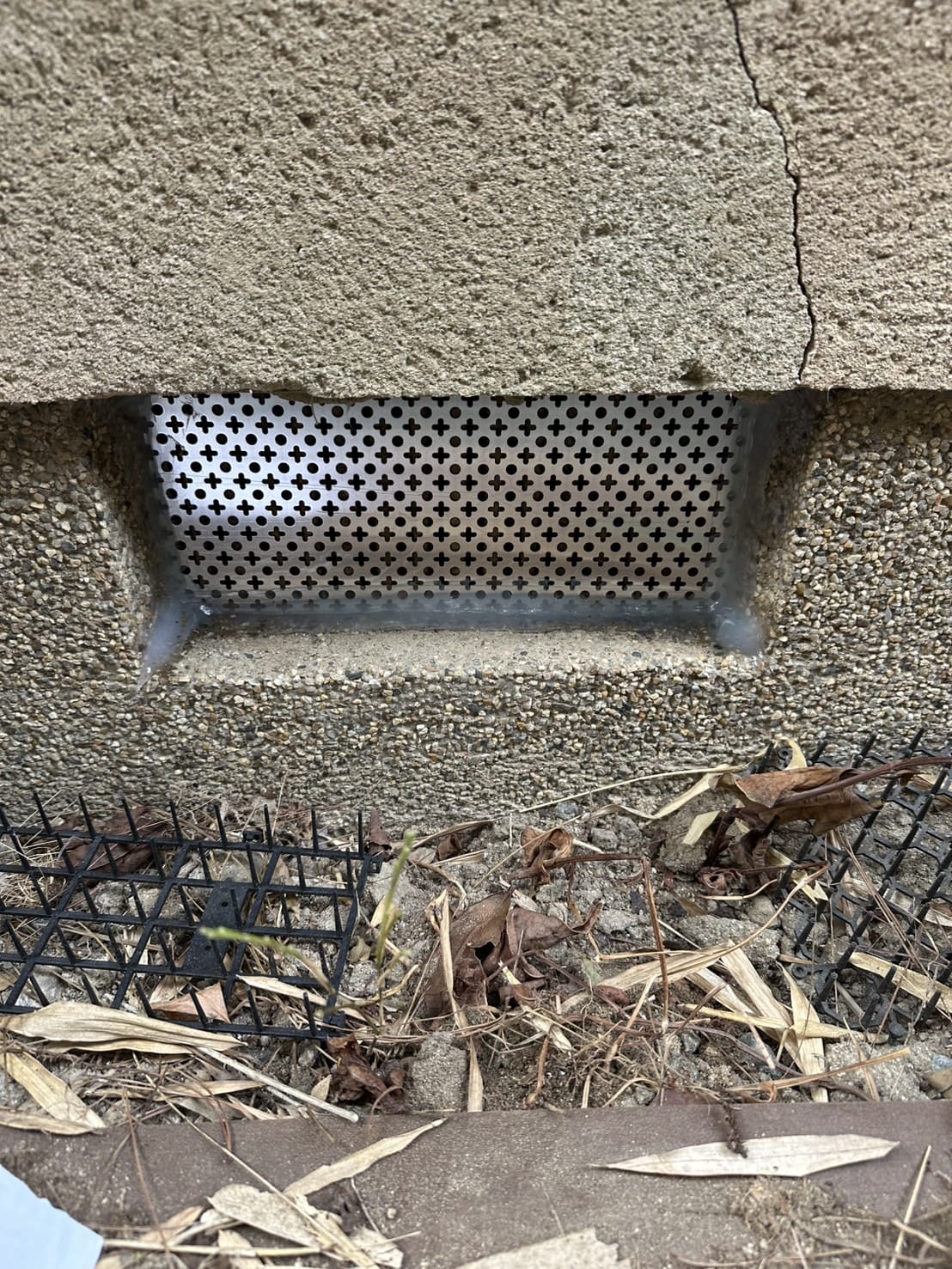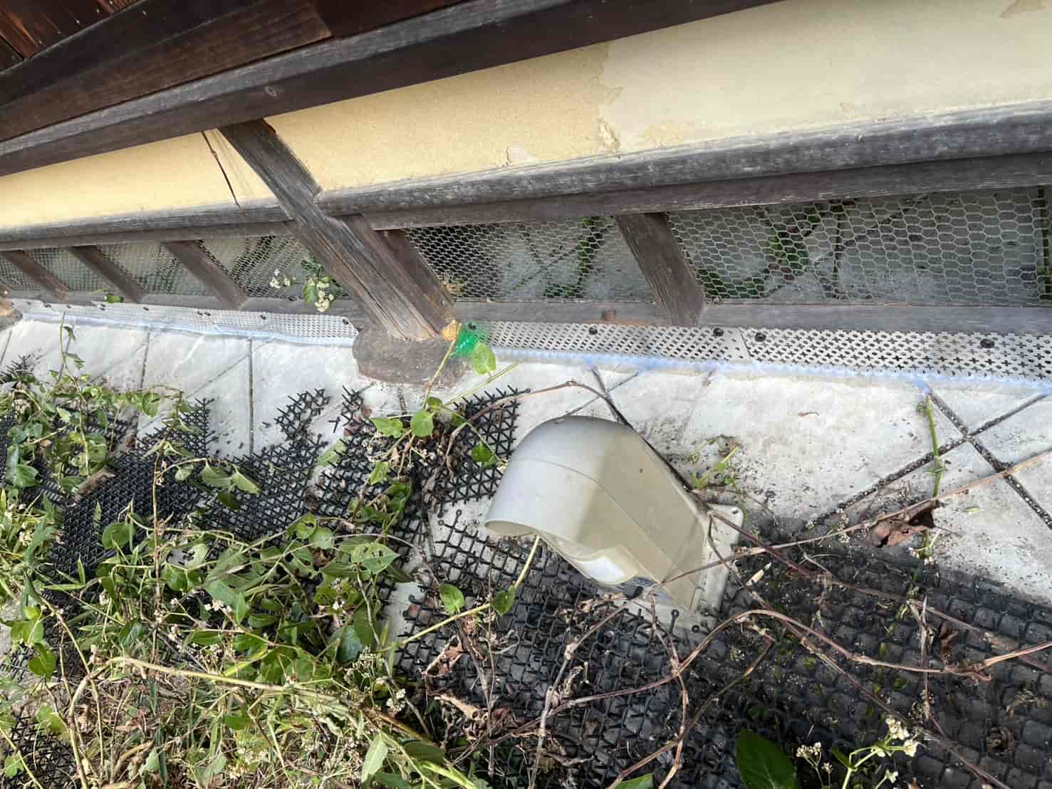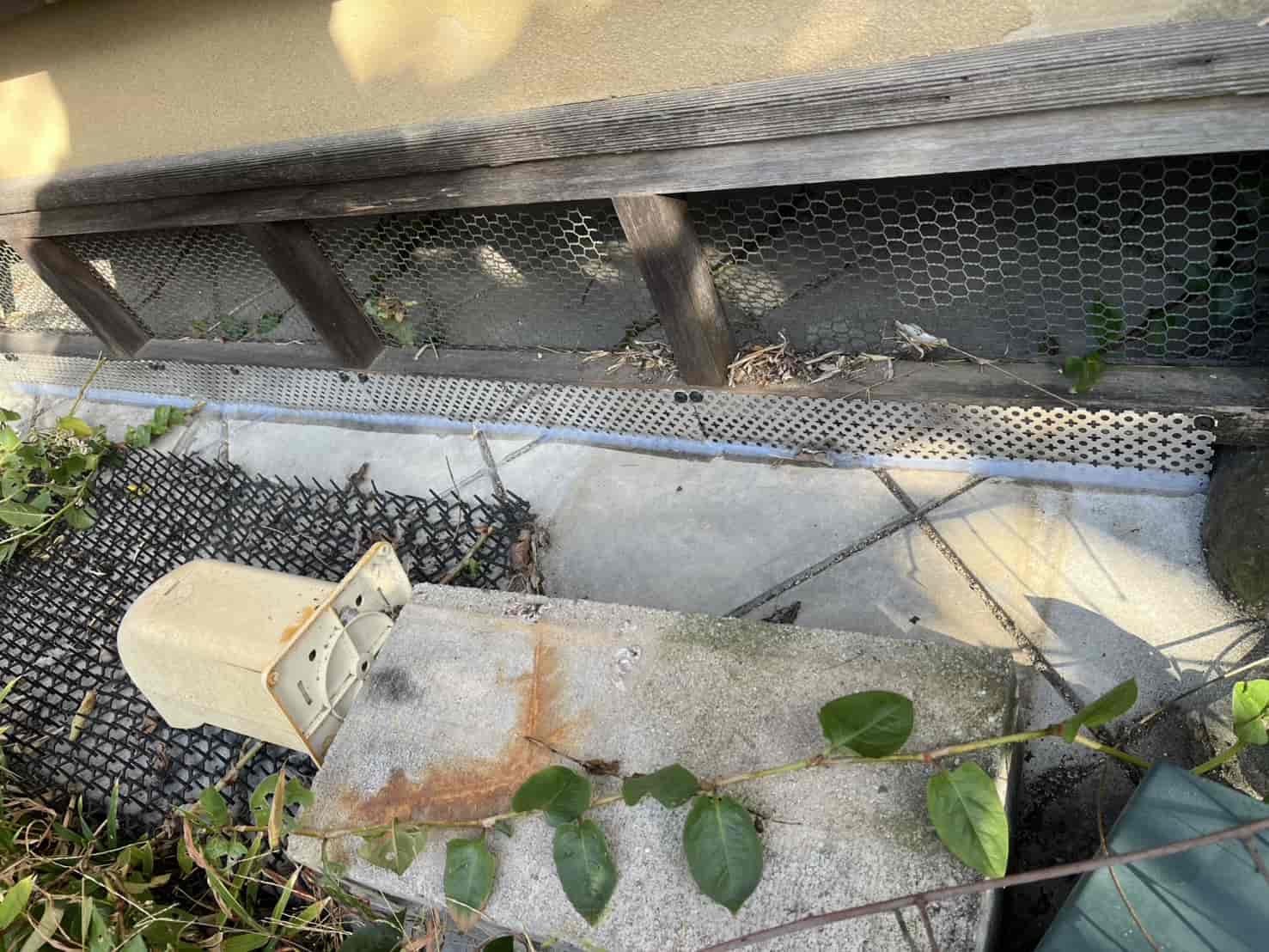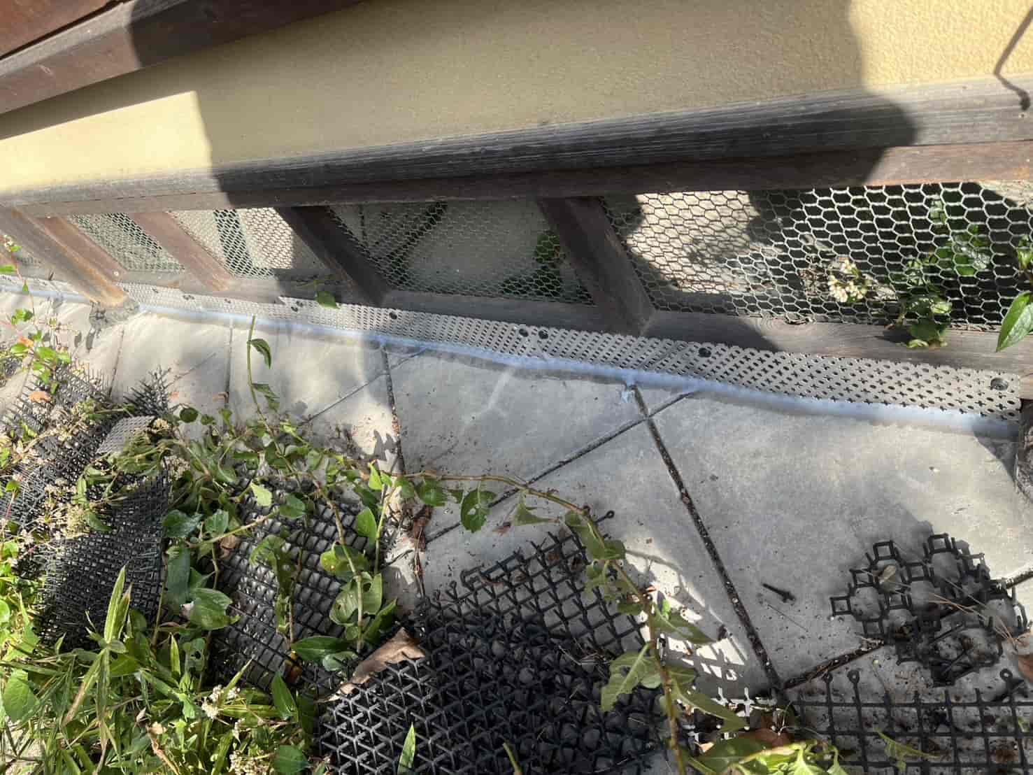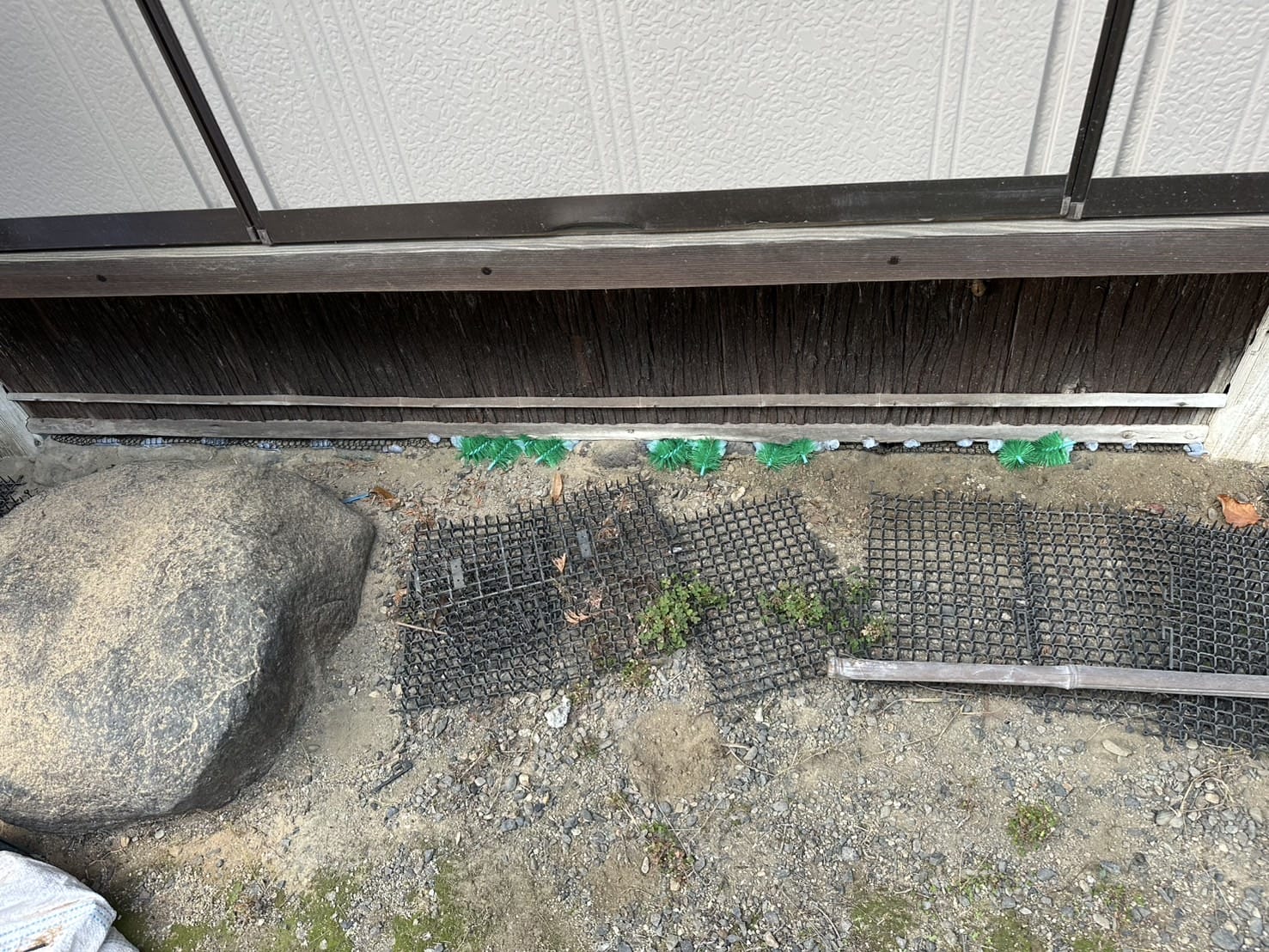ひとつひとつの隙間を丁寧にふさぎ、再侵入ができないよう入念に施工。建物が広いこともあり、外周だけでも相当な箇所数があり、延べ4日間かけて全ての侵入口を封鎖しました。穴塞ぎでは「塞ぎすぎて通気を妨げない」「排水や換気に必要な部分の機能を残す」など、細かい技術が求められます。アビリティでは建物の構造を理解した上で適切に処理を行っています。