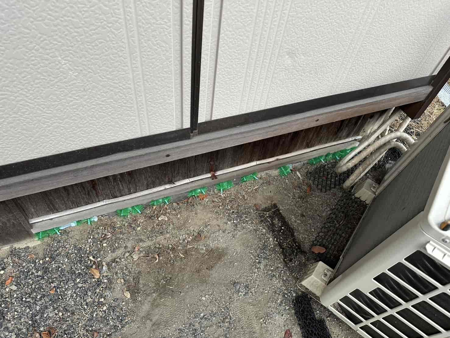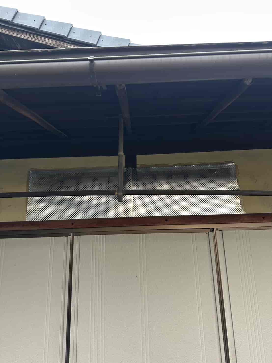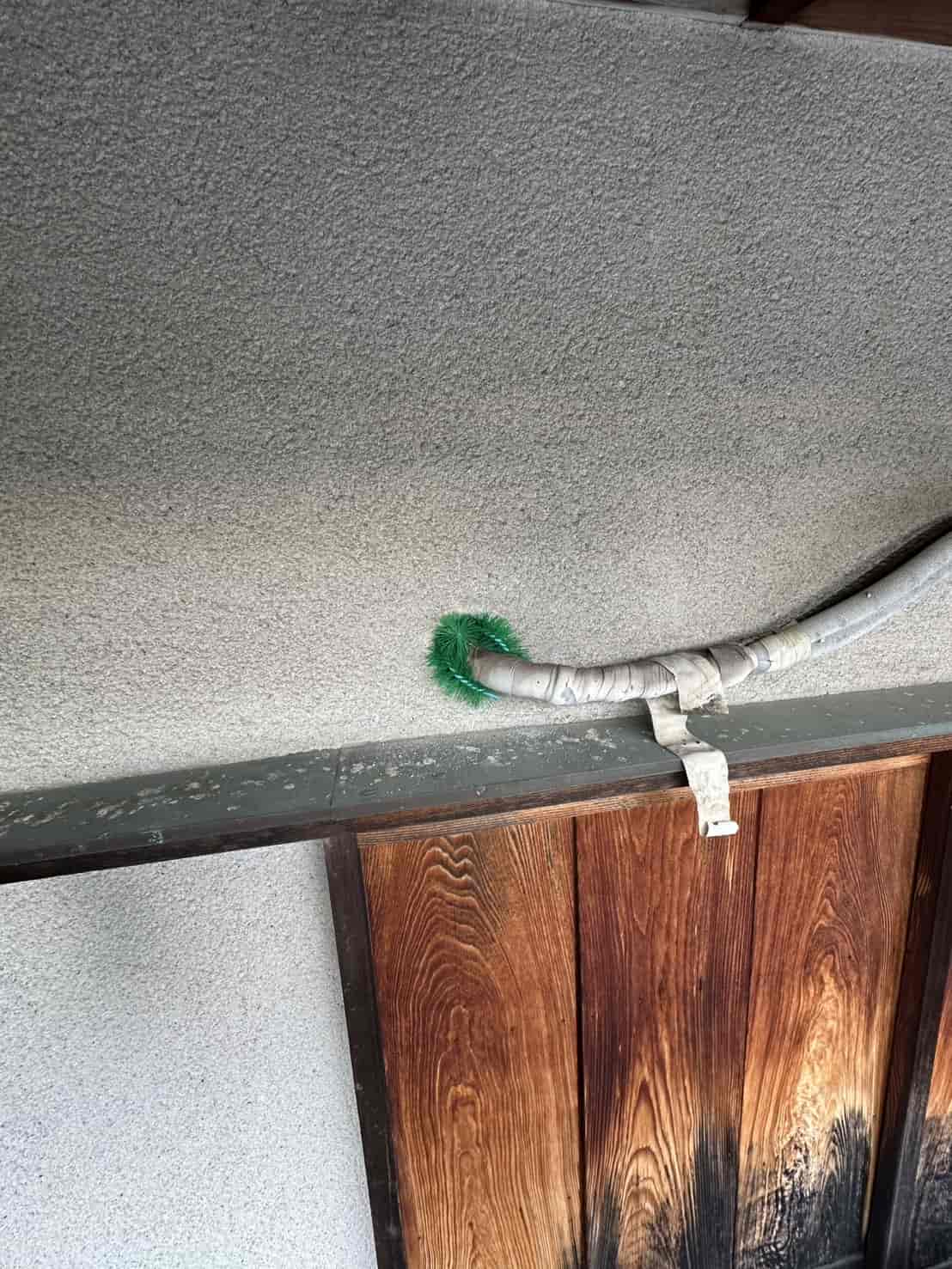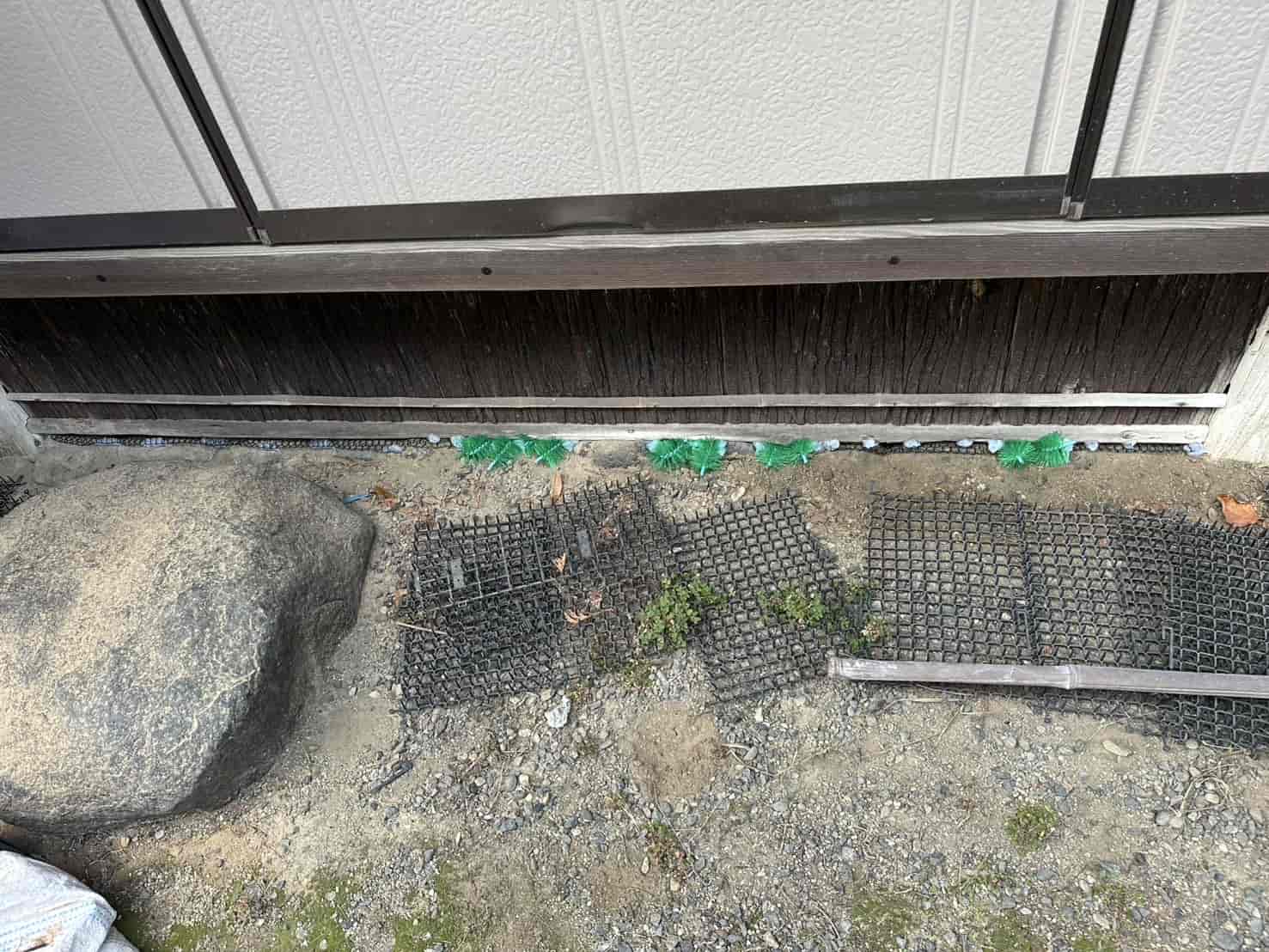今回の工事で最も重要であり、かつ時間を要したのが「穴塞ぎ作業」です。建物が大きく、屋根裏・床下・外周・換気部分・配管部など細かい隙間が多数存在していました。