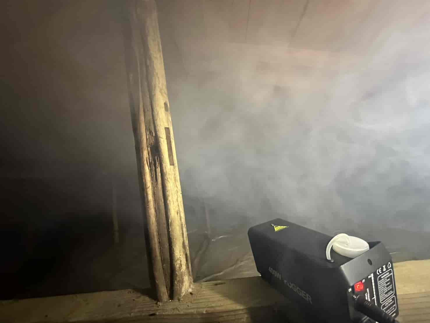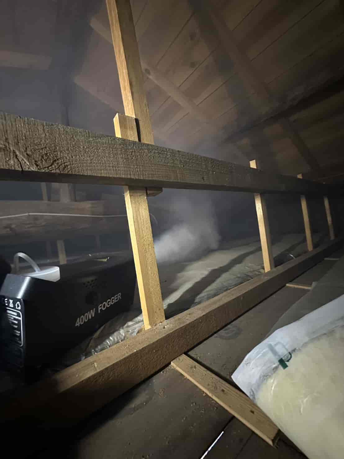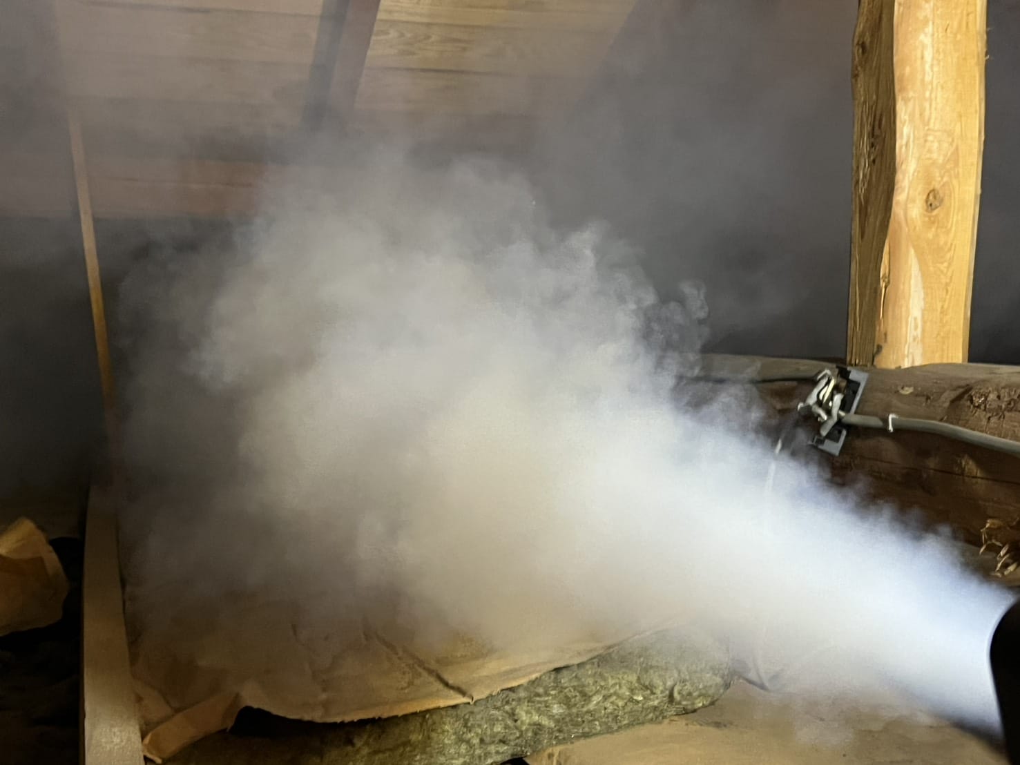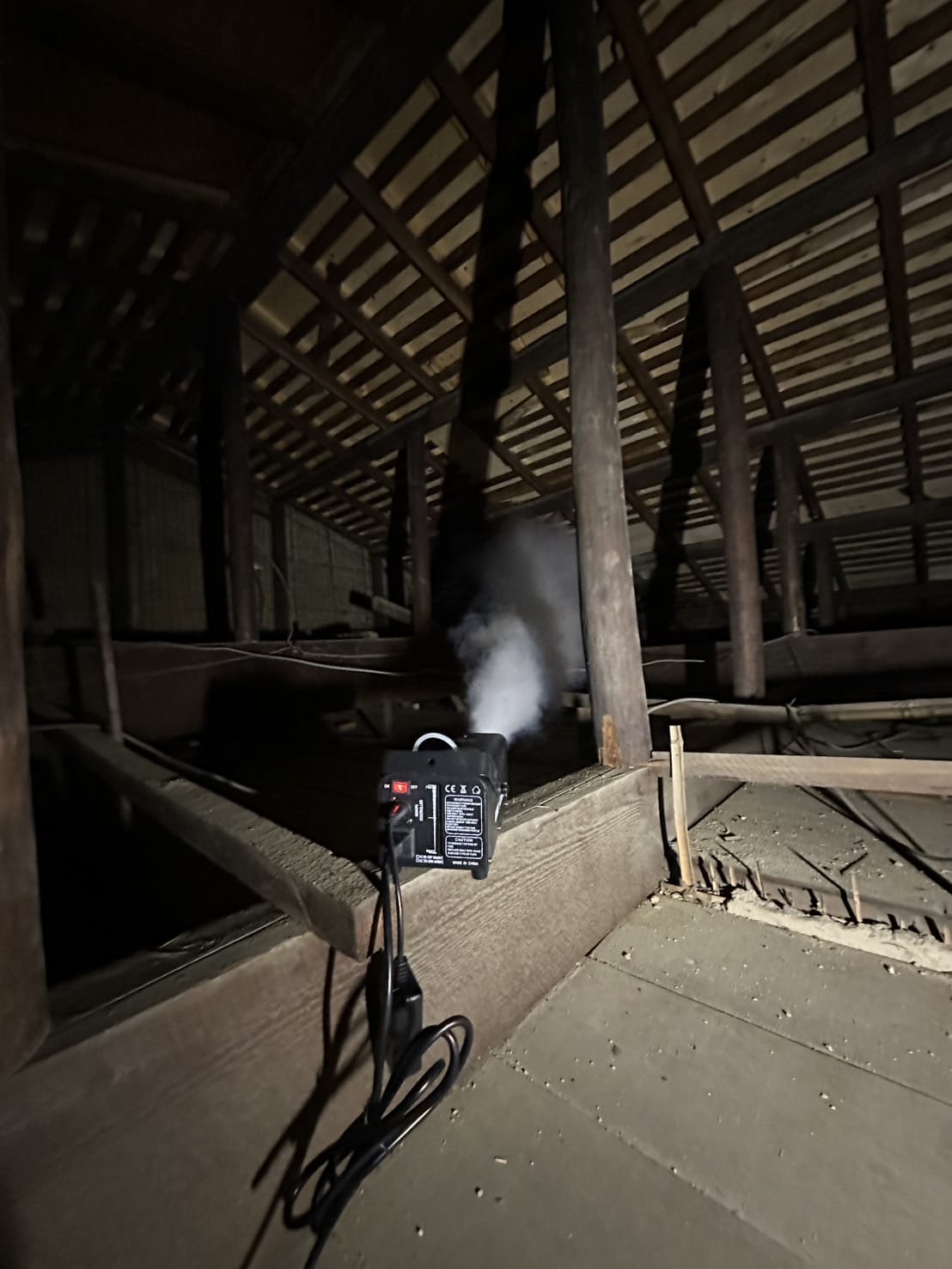 まず、家の中にいるねずみを外へ追い出すため、天井裏を中心に 燻煙剤 を使用して追い出しを行いました。燻煙処理は、においが残りにくく、人やペットが生活に支障をきたさないタイプを使用。追い出しを確実にした上で、次の穴塞ぎ工程へ進みました。