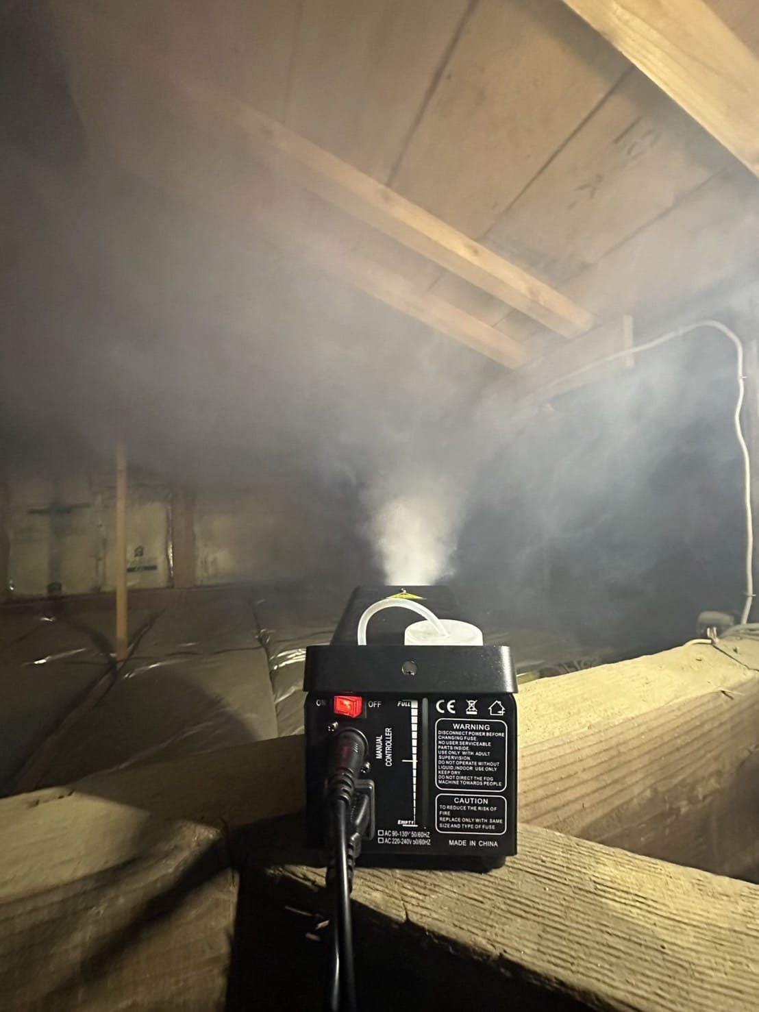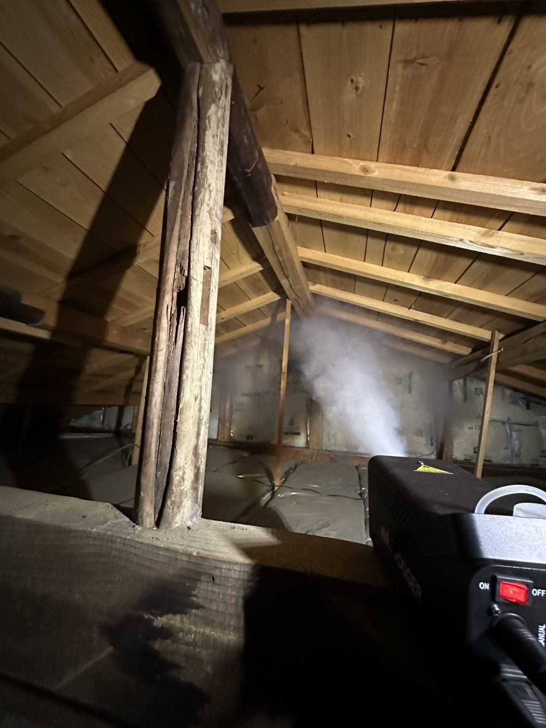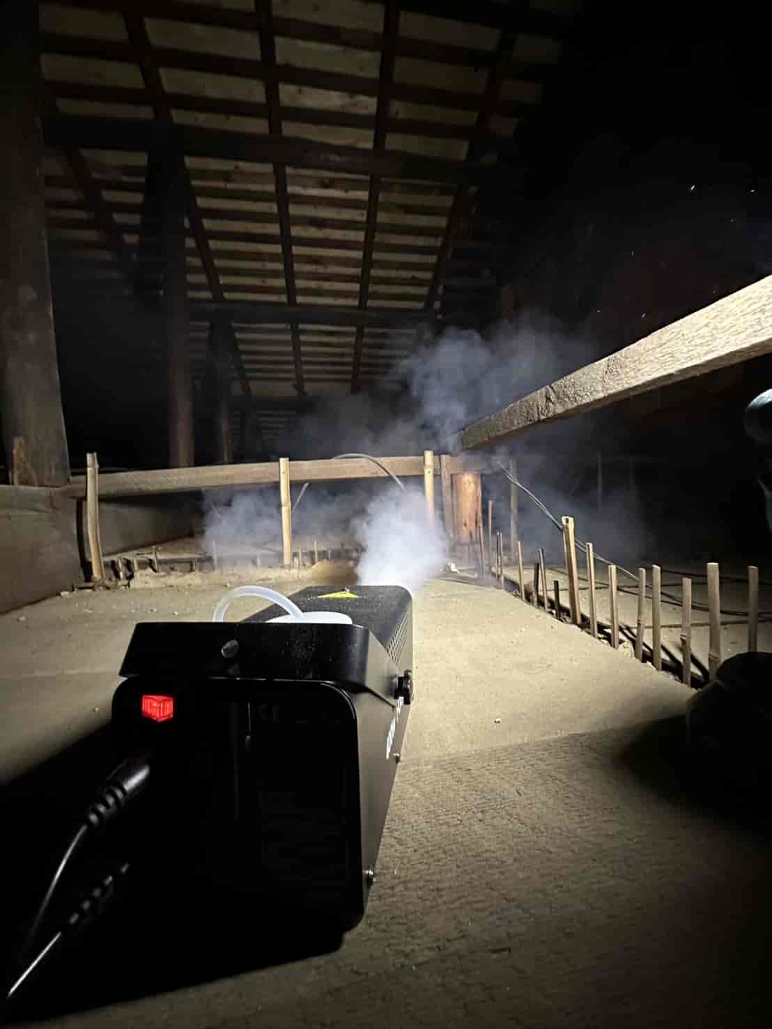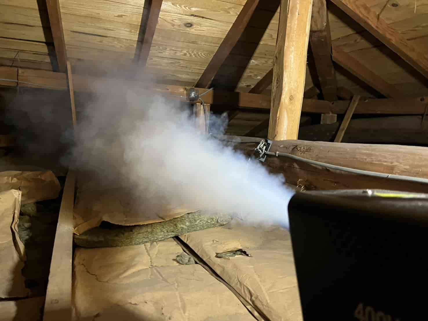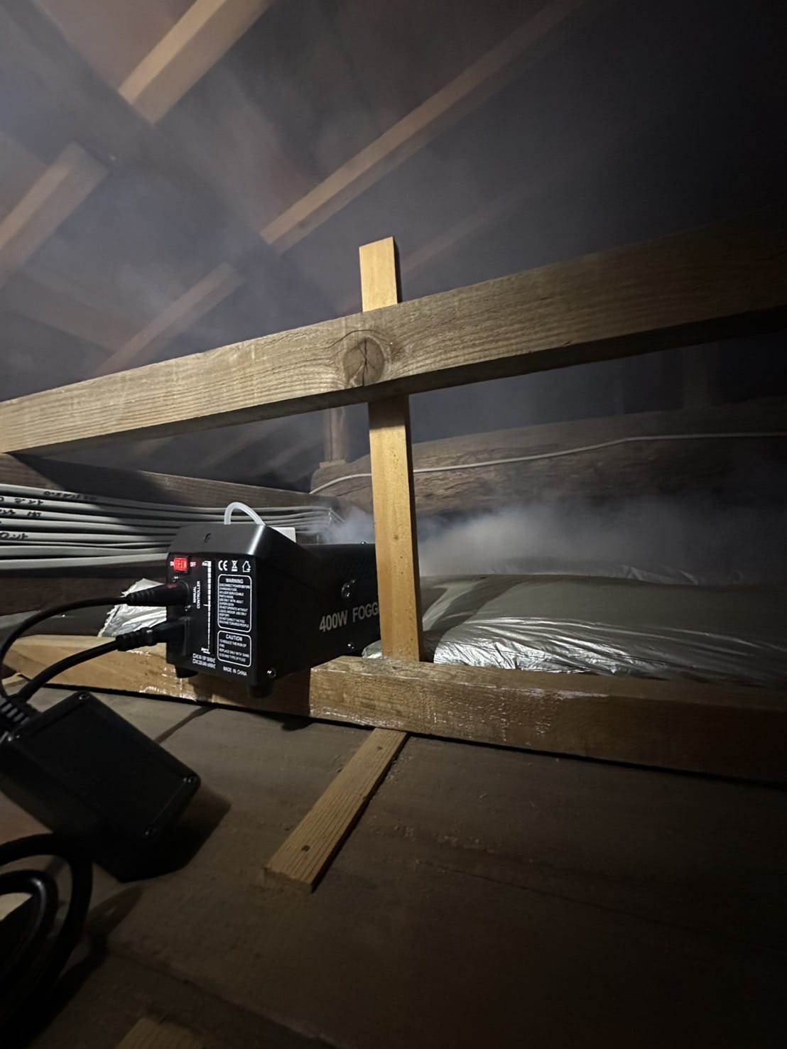 まず、家の中にいるねずみを外へ追い出すため、天井裏を中心に 燻煙剤 を使用して追い出しを行いました。燻煙処理は、においが残りにくく、人やペットが生活に支障をきたさないタイプを使用。追い出しを確実にした上で、次の穴塞ぎ工程へ進みました。