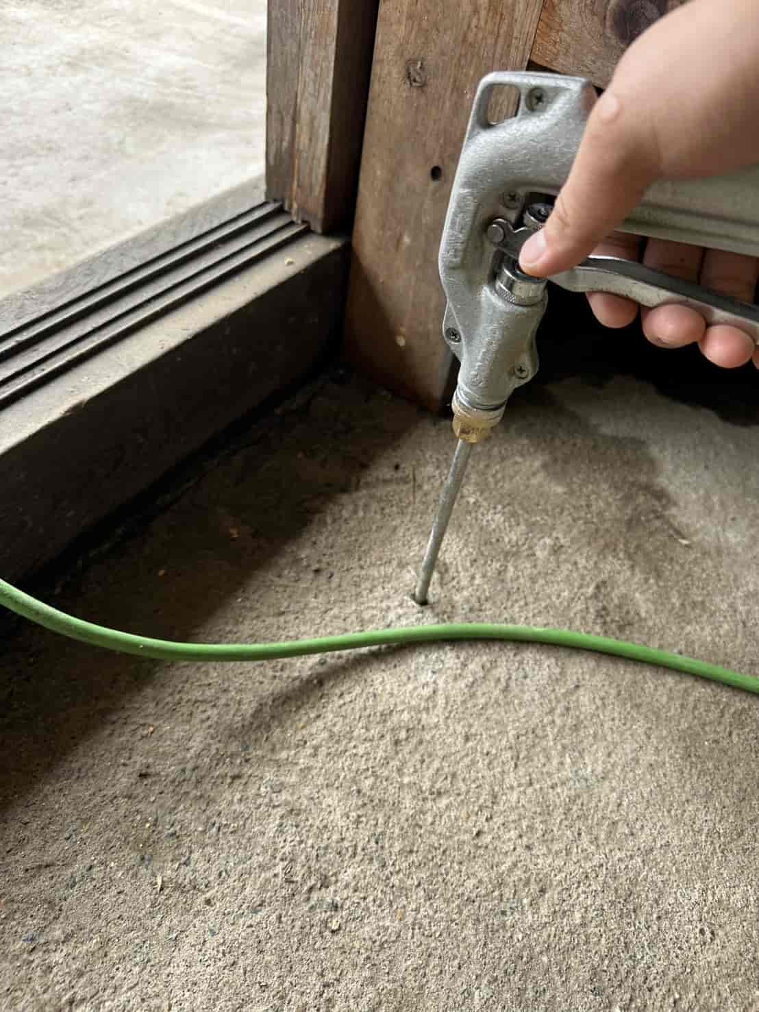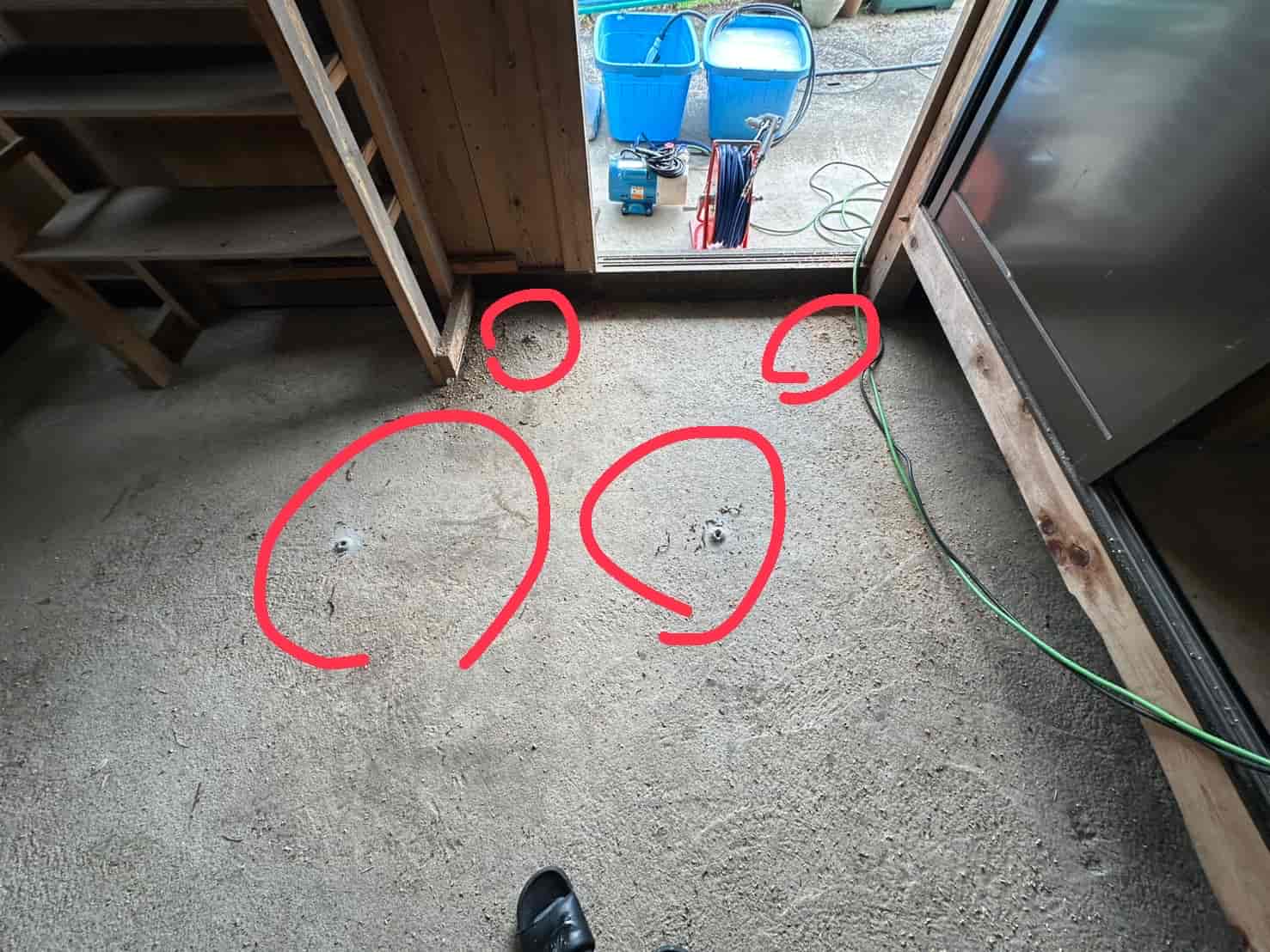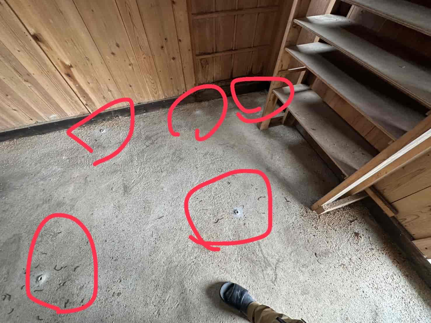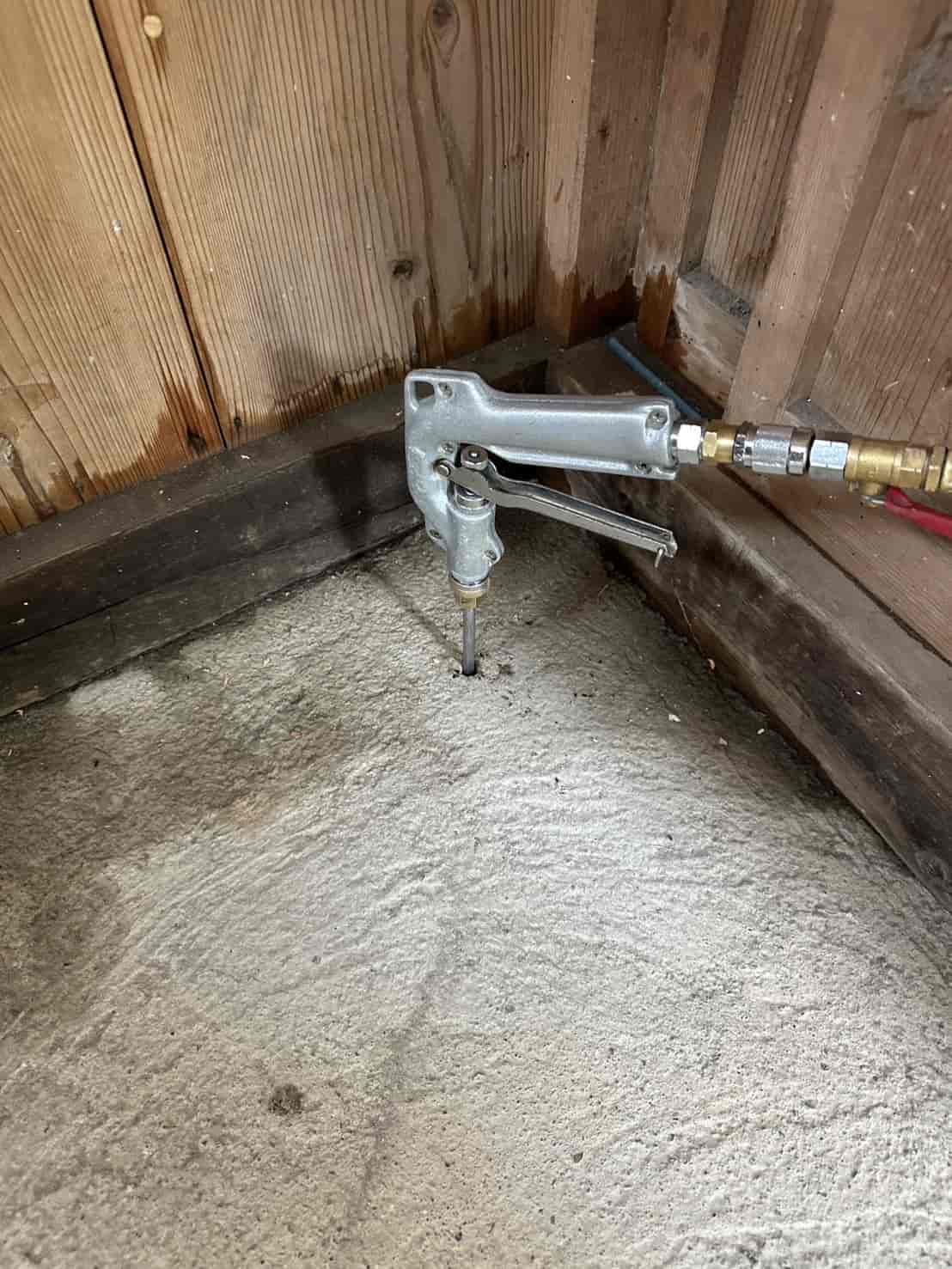 土間仕上げの床面に一定間隔で小さな穴を開け、専用の薬剤を加圧注入しました。これにより、土壌全体に薬剤が行き渡り、シロアリの通り道や巣を遮断することができます。床下がない構造の建物でも有効な方法です。