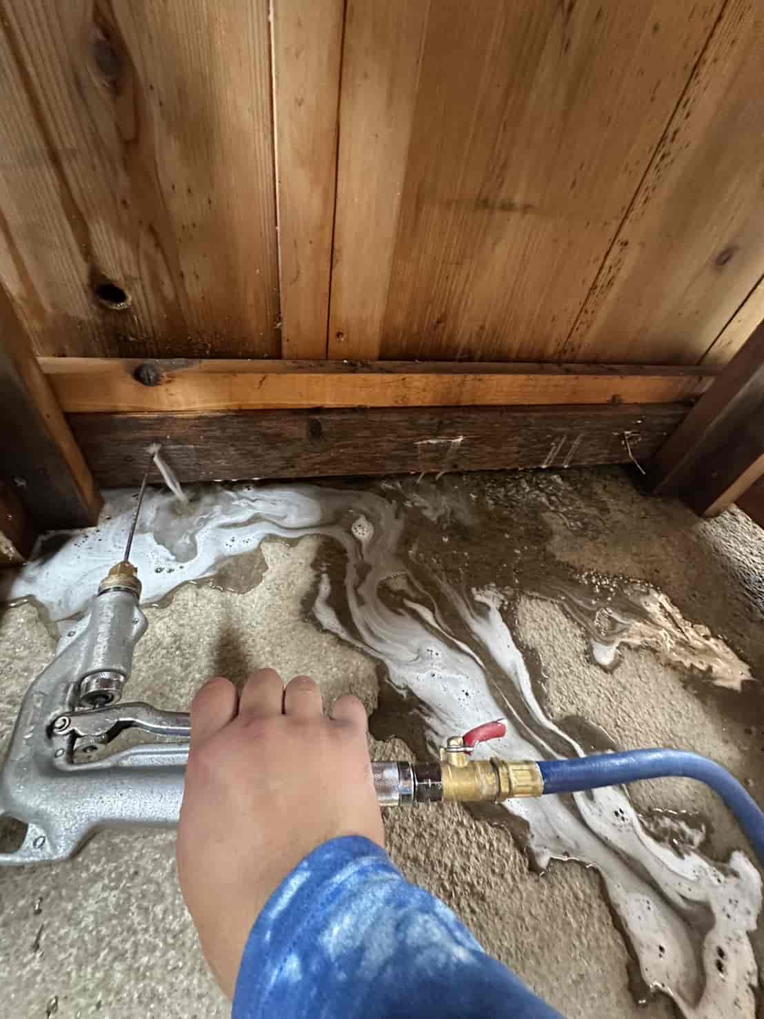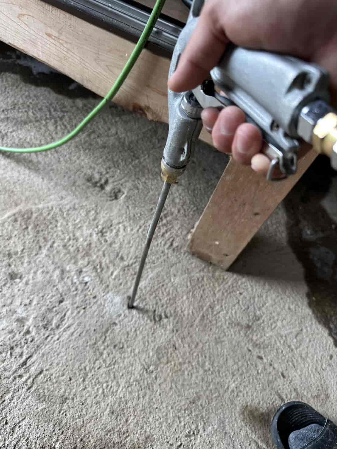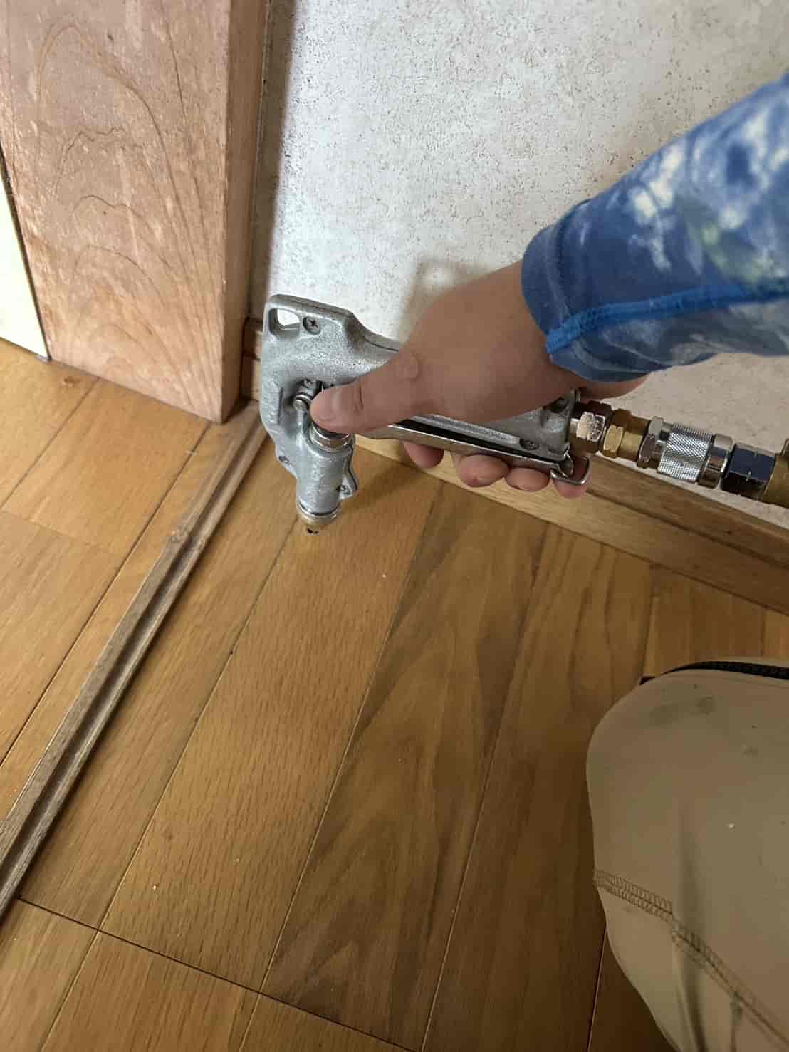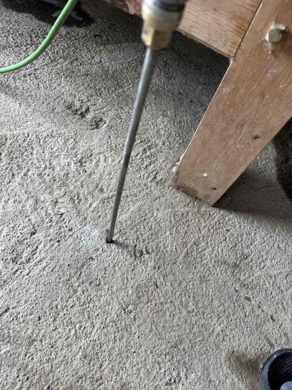 土間仕上げの床面に一定間隔で小さな穴を開け、専用の薬剤を加圧注入しました。これにより、土壌全体に薬剤が行き渡り、シロアリの通り道や巣を遮断することができます。床下がない構造の建物でも有効な方法です。