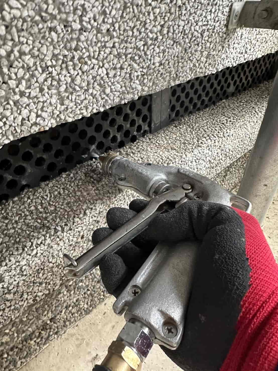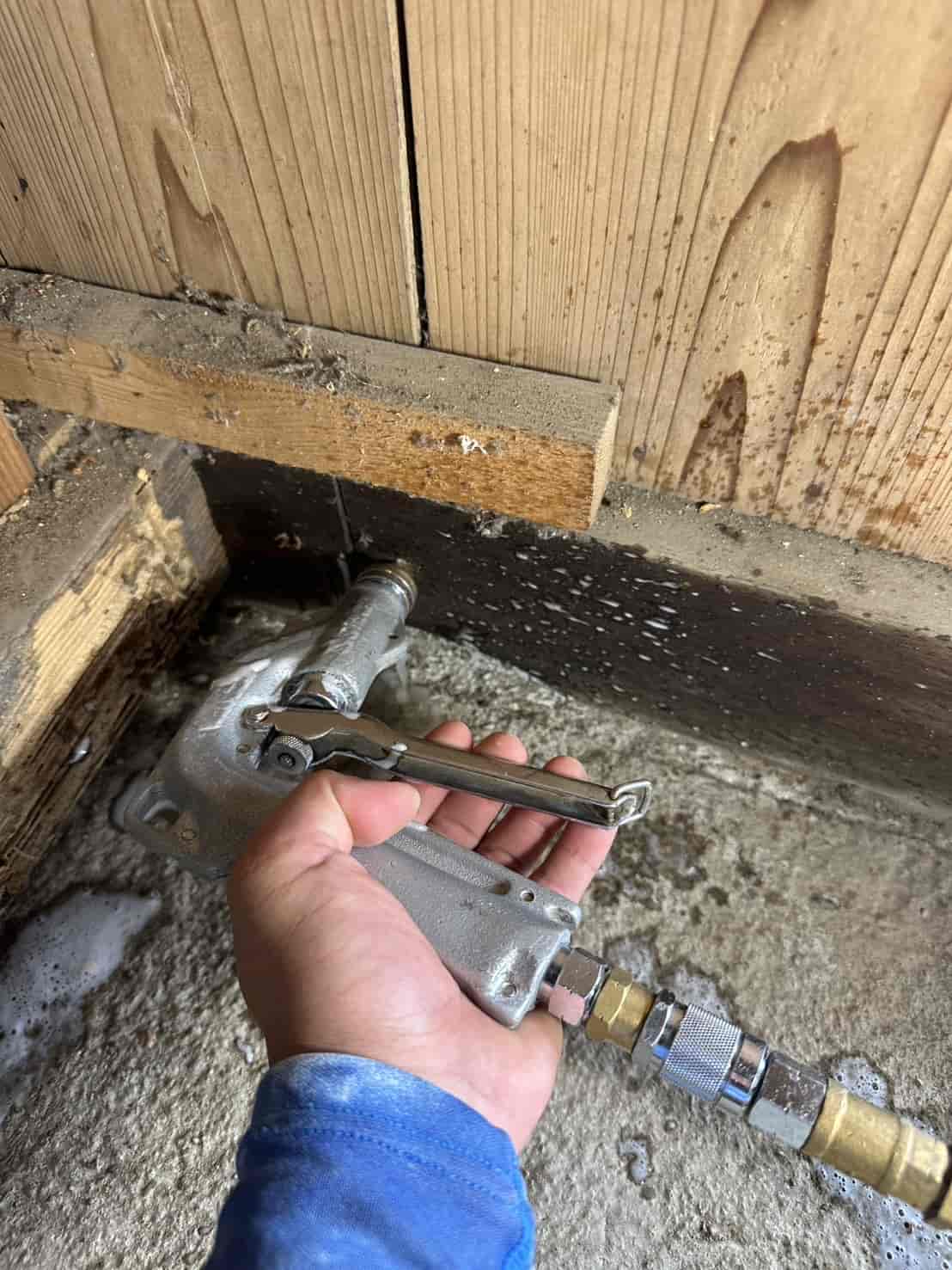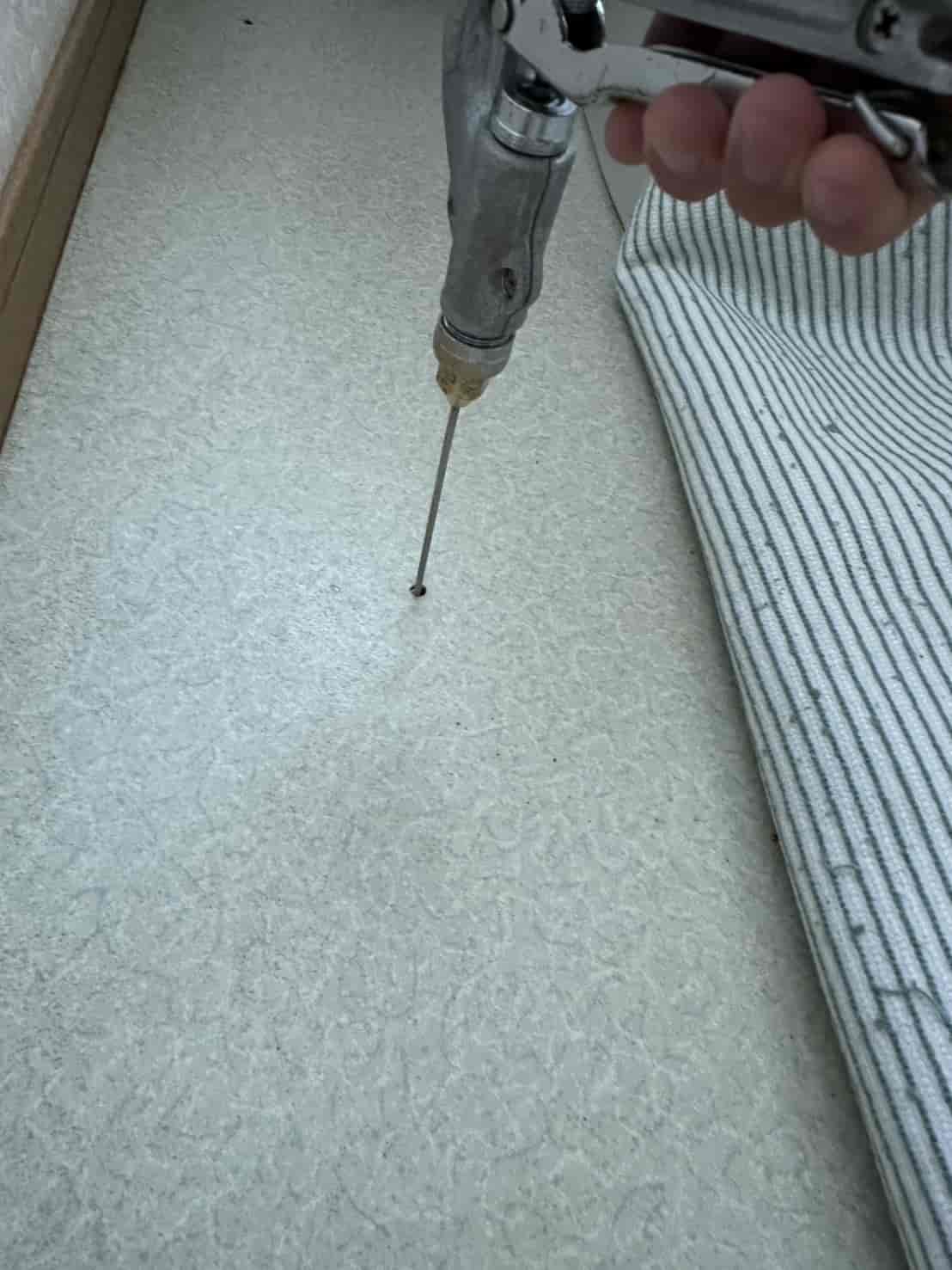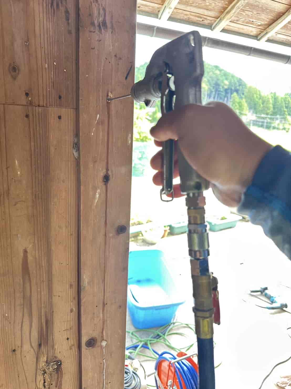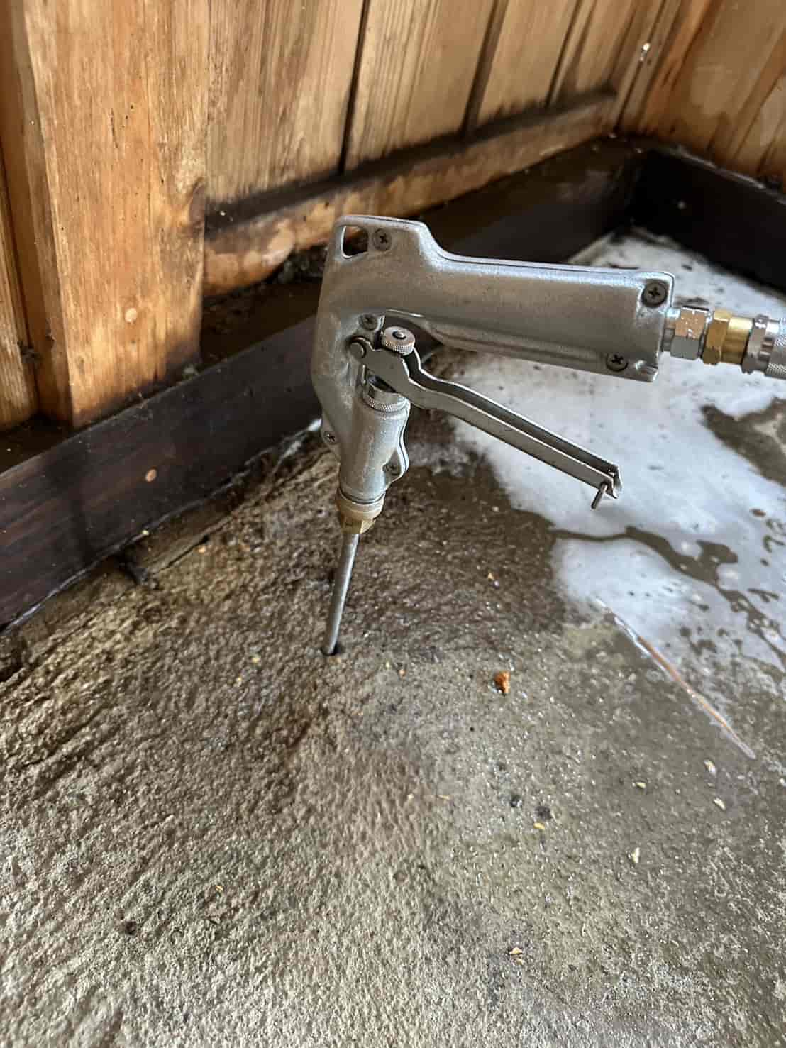 土間仕上げの床面に一定間隔で小さな穴を開け、専用の薬剤を加圧注入しました。これにより、土壌全体に薬剤が行き渡り、シロアリの通り道や巣を遮断することができます。床下がない構造の建物でも有効な方法です。