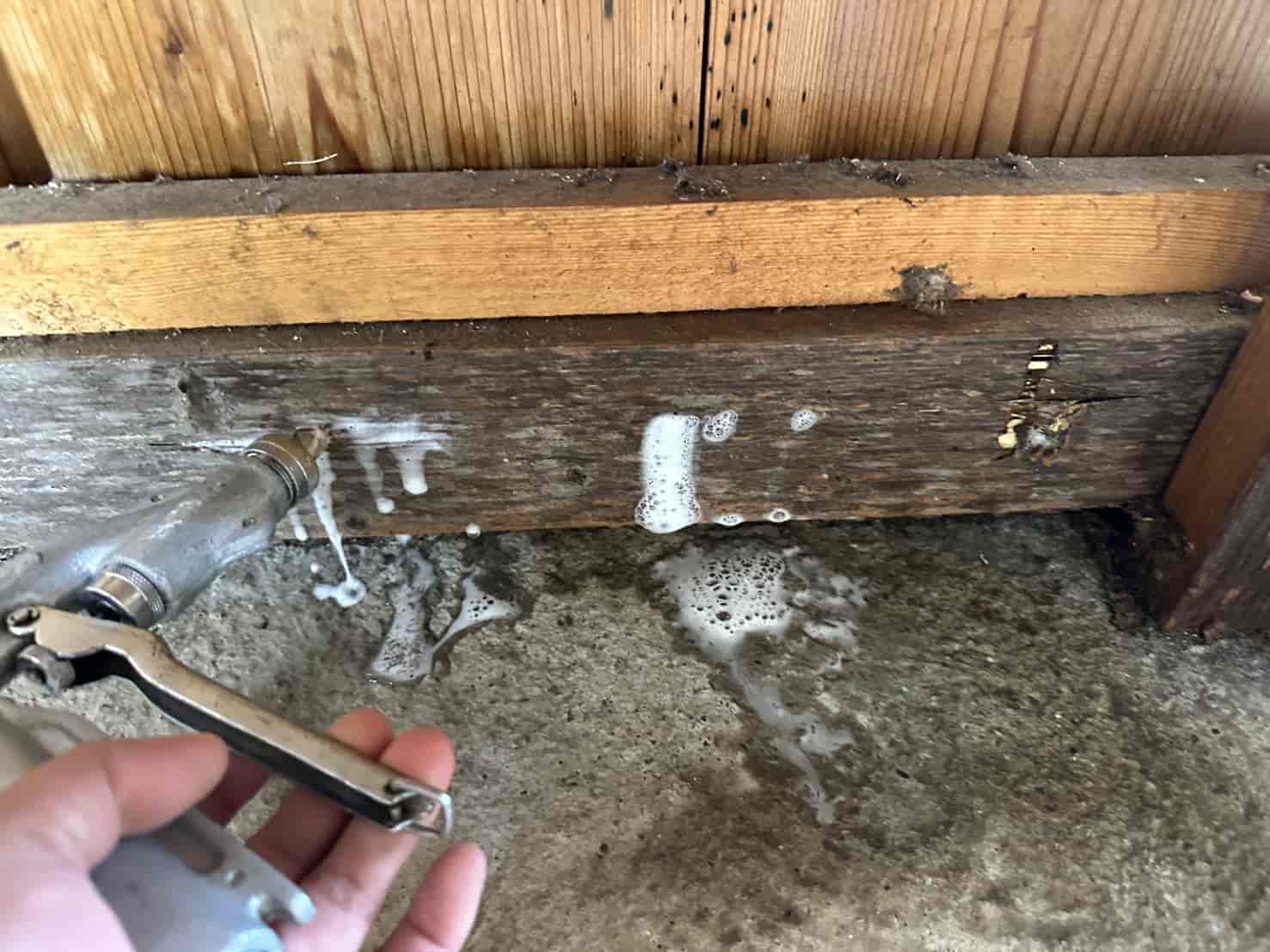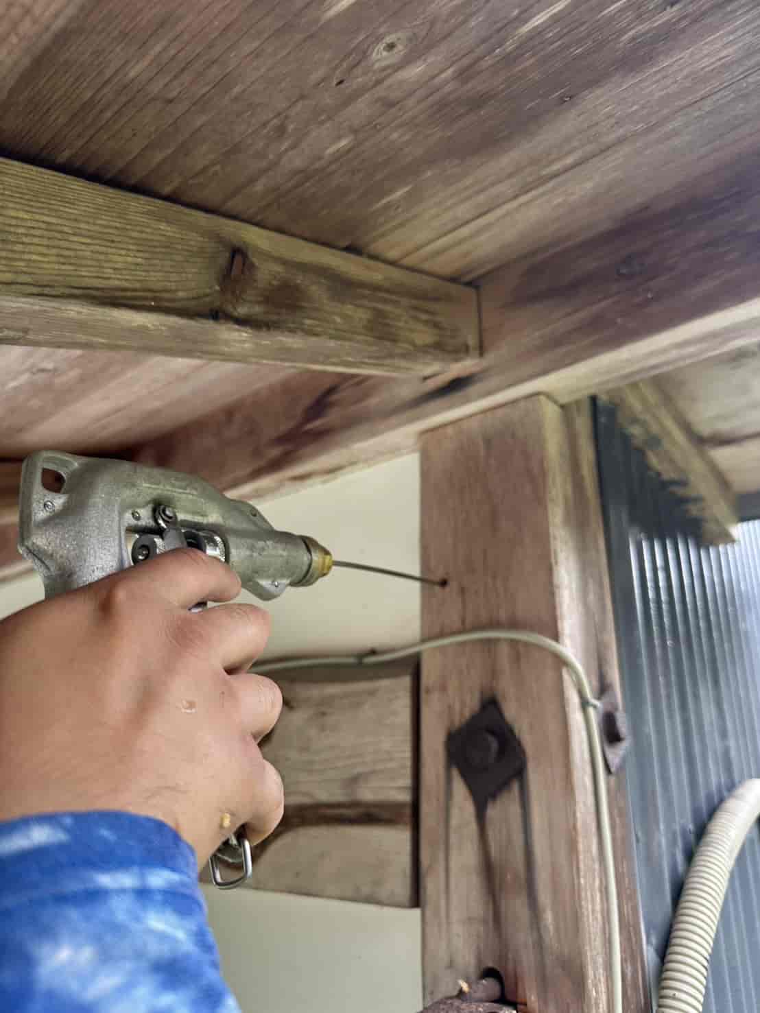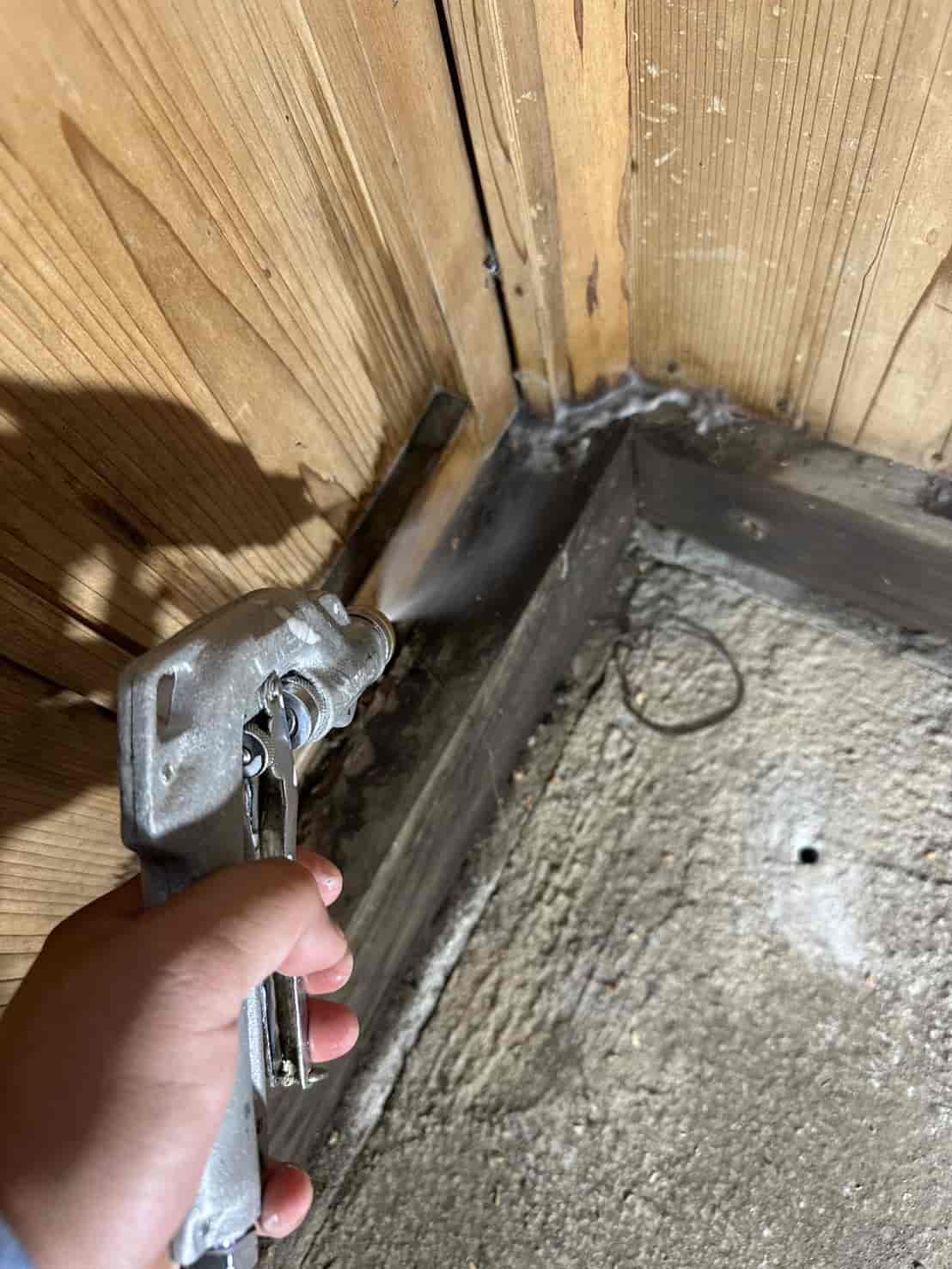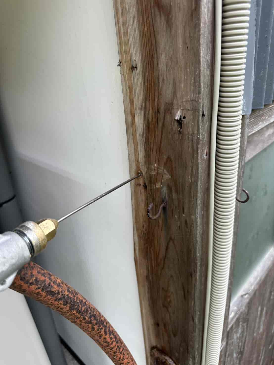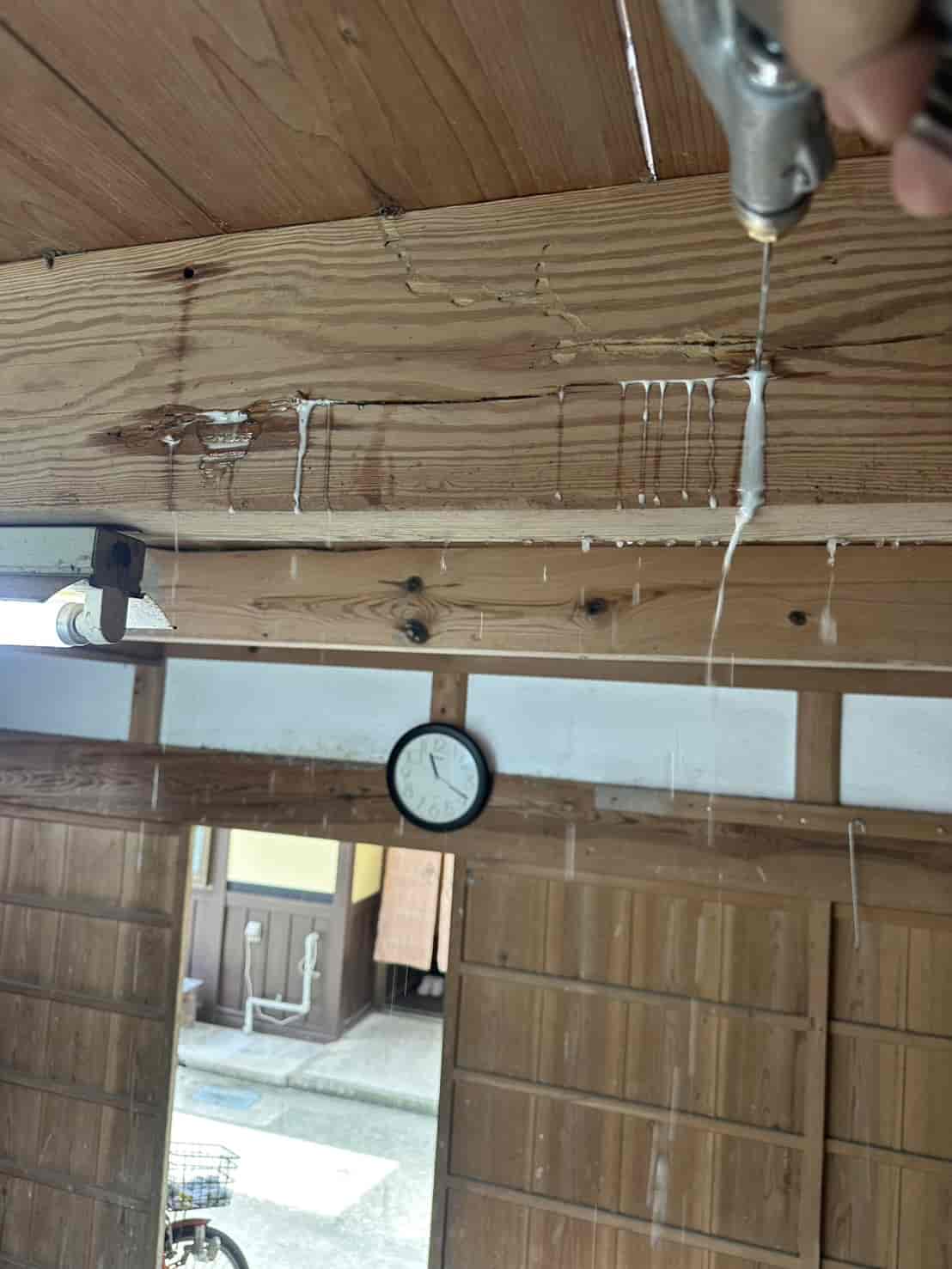 シロアリの被害が壁内部から2階の畳まで達していたため、複数箇所の壁に小さな穴を開け、薬剤を注入しました。目に見えない壁内部に潜む白アリを確実に駆除するための施工であり、建物全体に薬剤が浸透するよう丁寧に処理を行いました。
