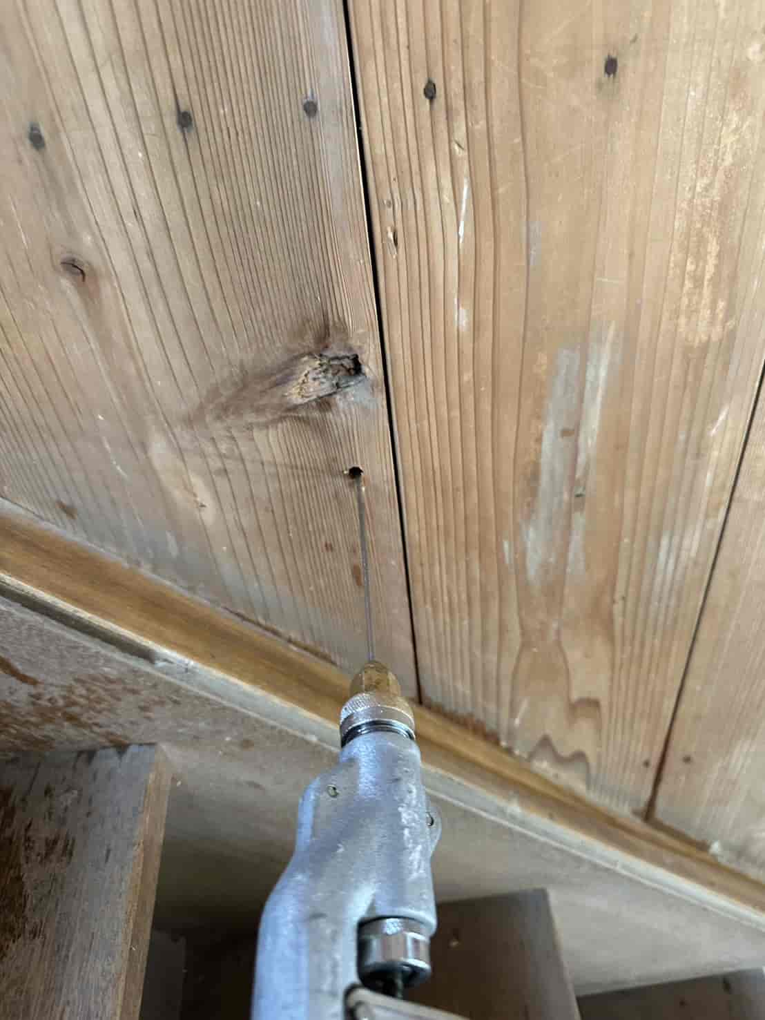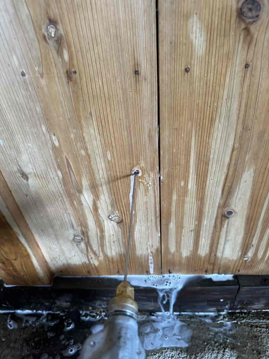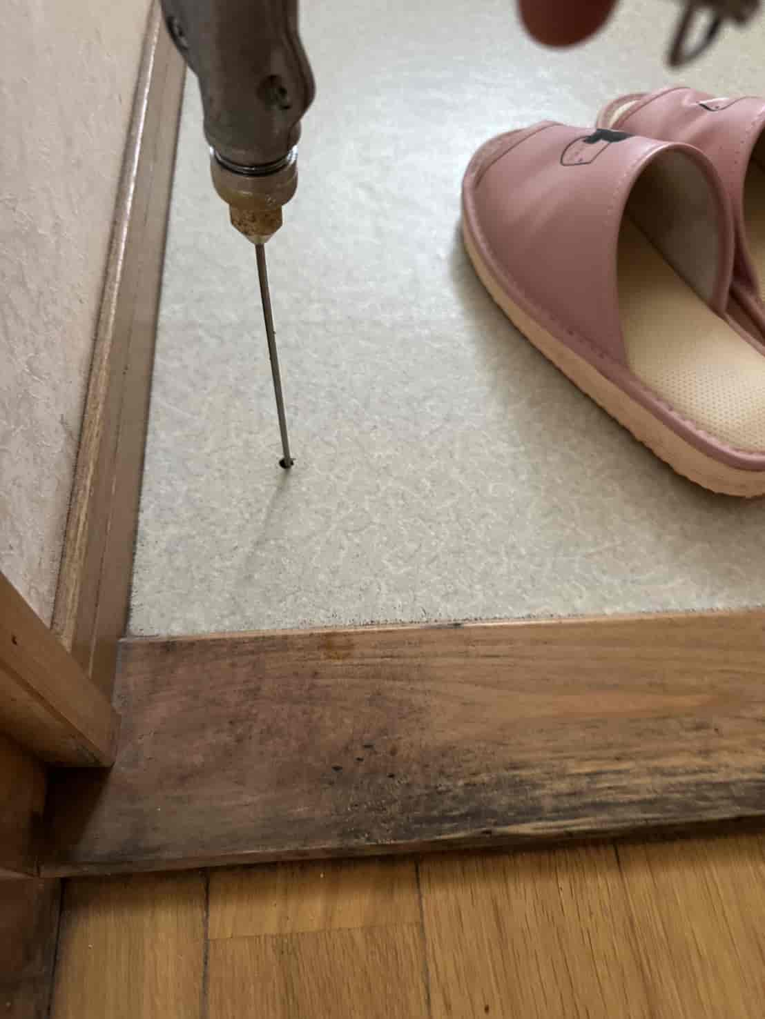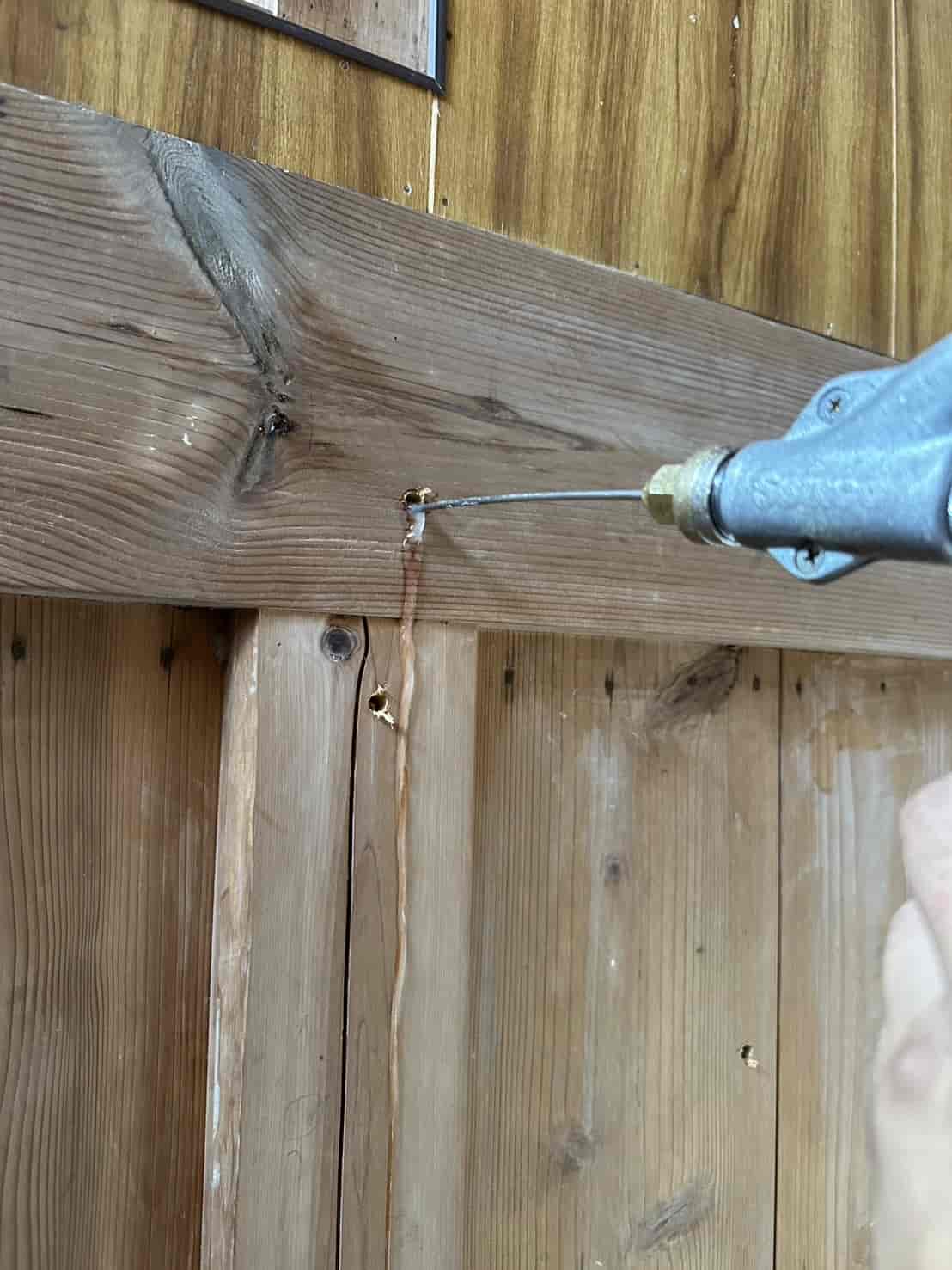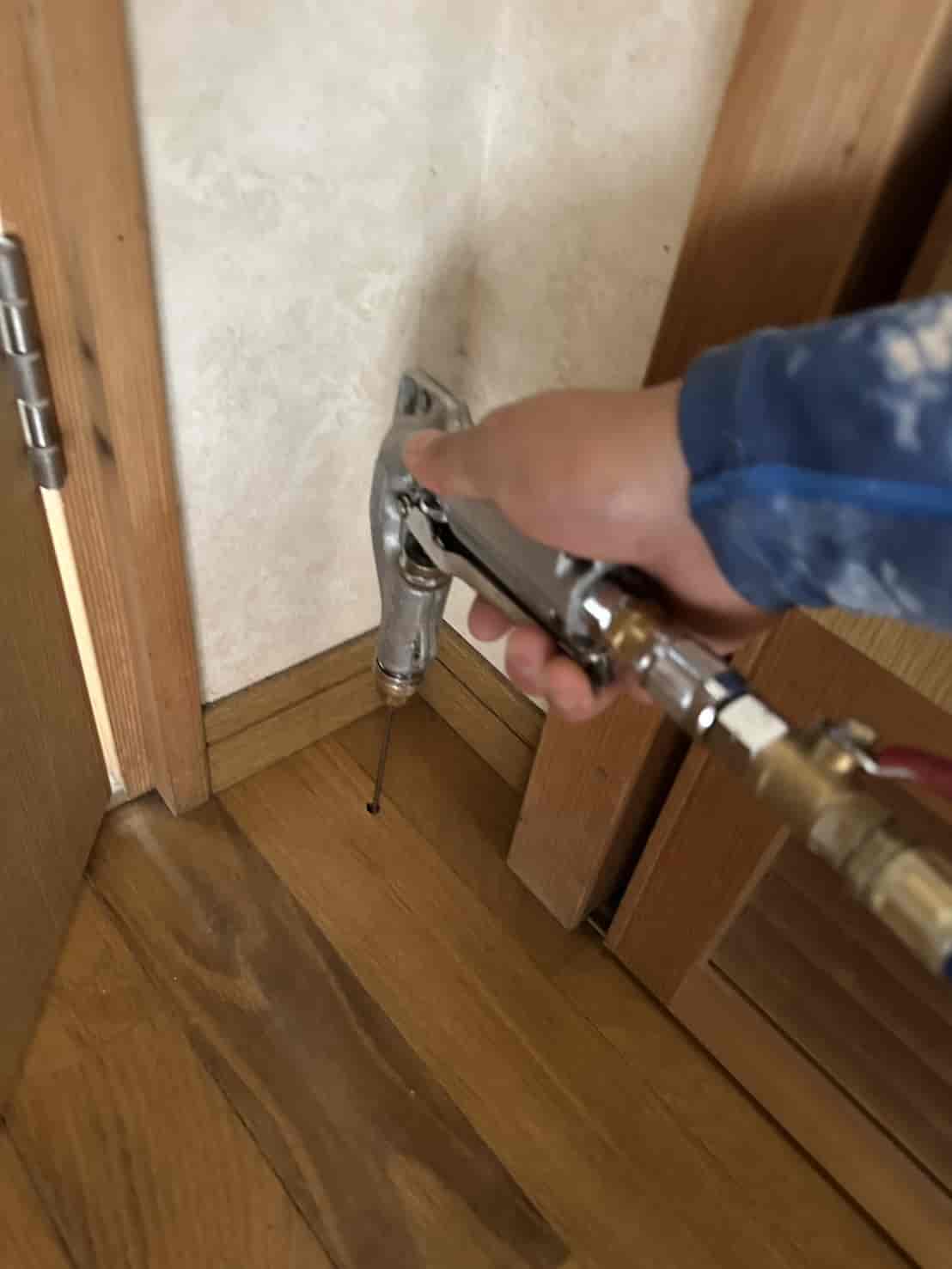 シロアリの被害が壁内部から2階の畳まで達していたため、複数箇所の壁に小さな穴を開け、薬剤を注入しました。目に見えない壁内部に潜む白アリを確実に駆除するための施工であり、建物全体に薬剤が浸透するよう丁寧に処理を行いました。