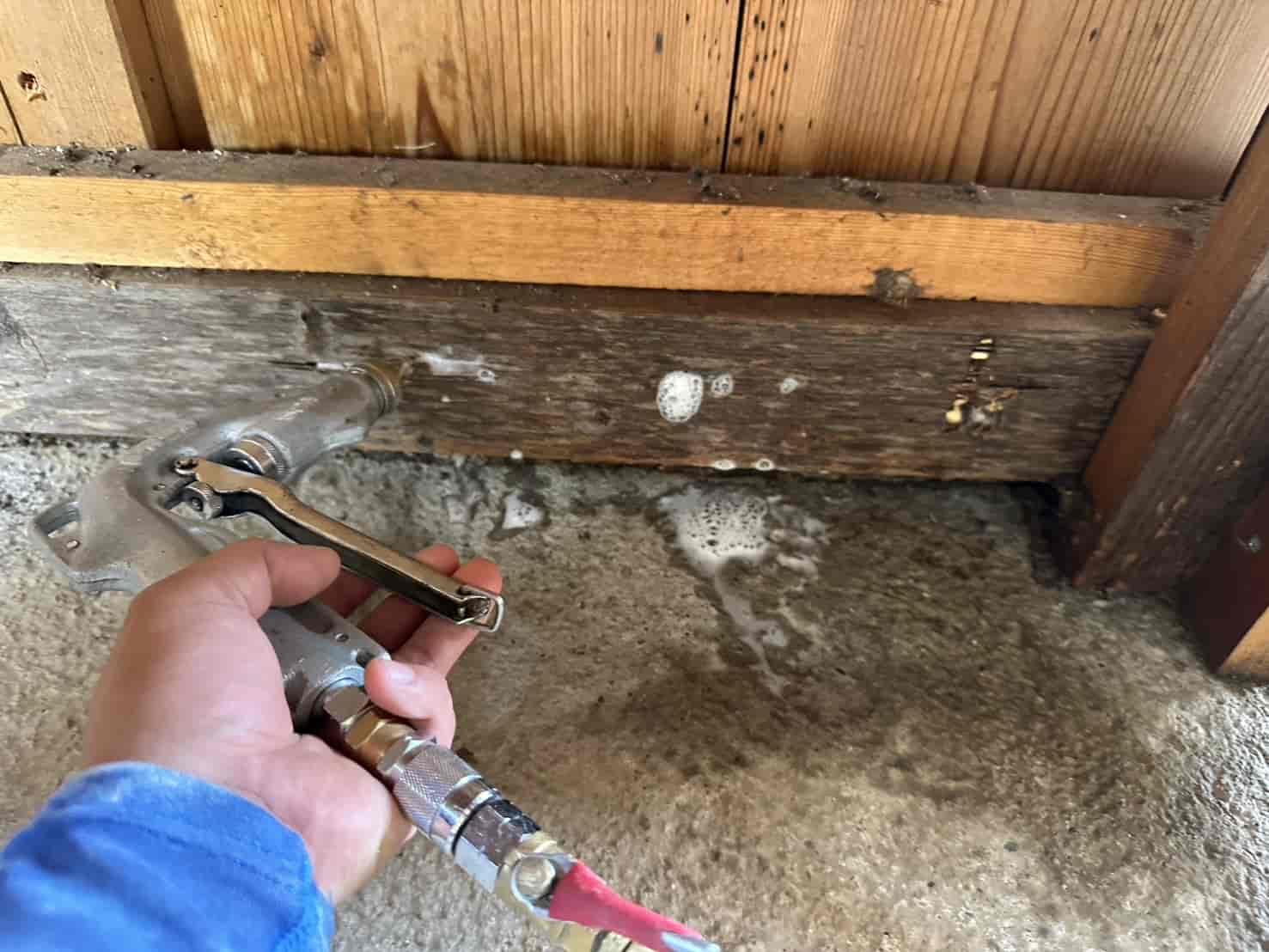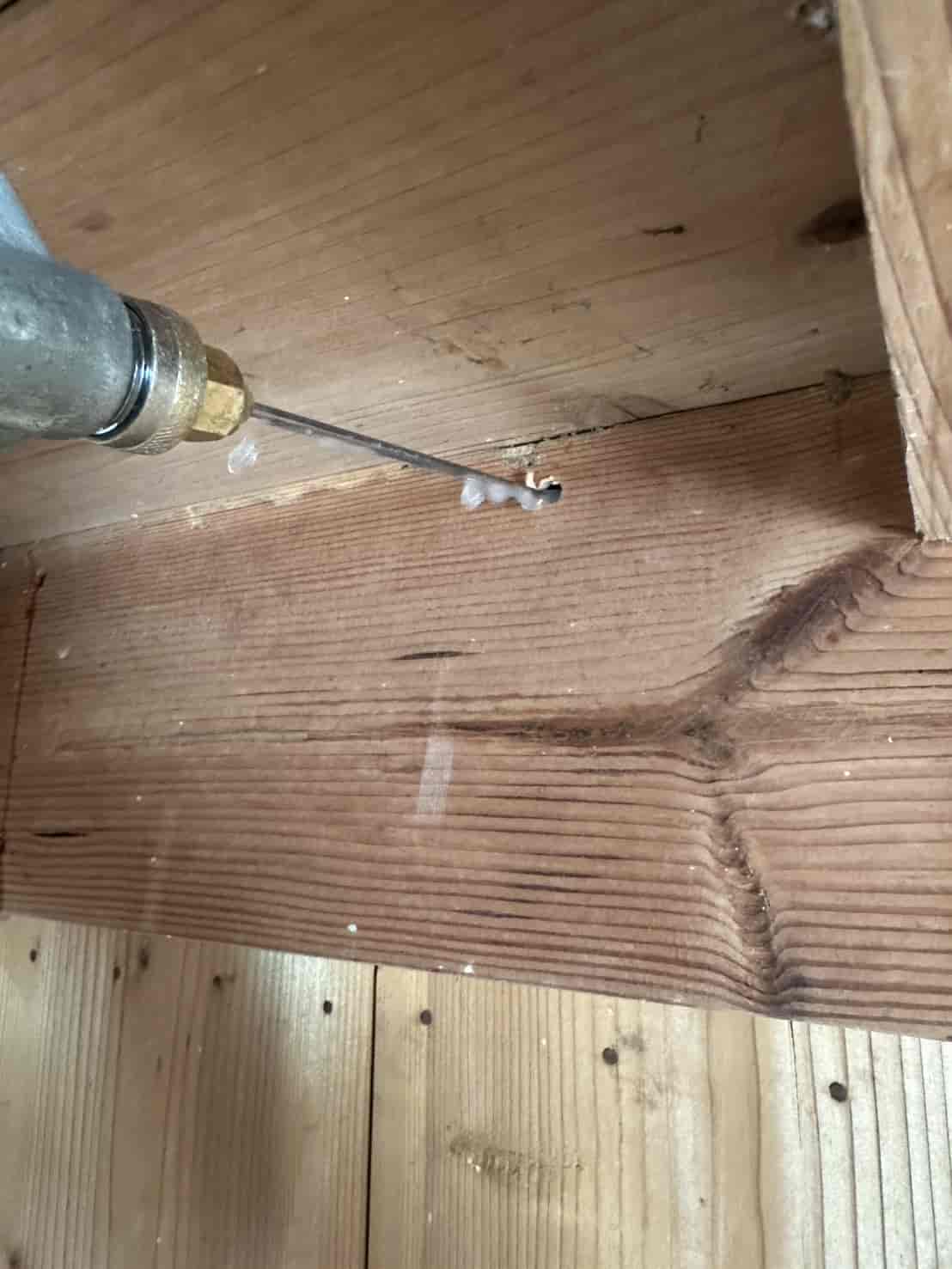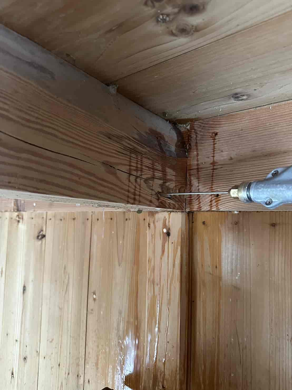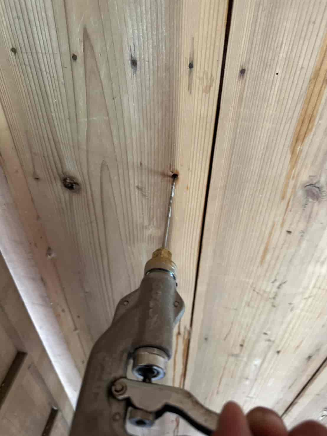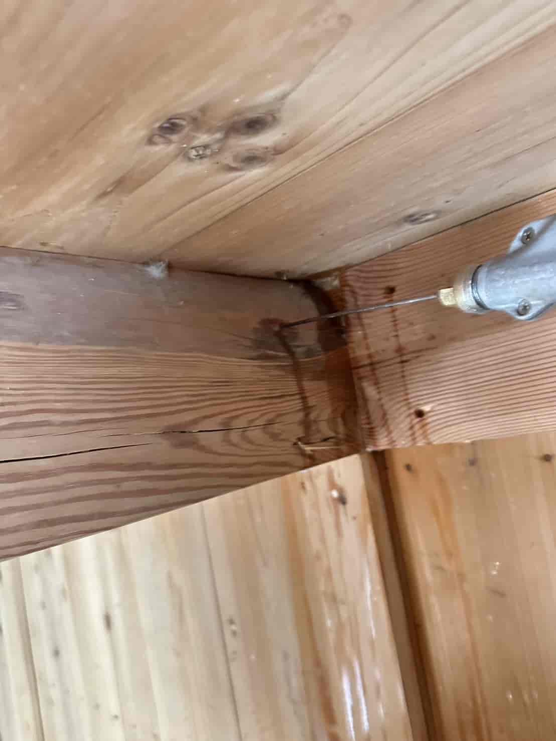 シロアリの被害が壁内部から2階の畳まで達していたため、複数箇所の壁に小さな穴を開け、薬剤を注入しました。目に見えない壁内部に潜む白アリを確実に駆除するための施工であり、建物全体に薬剤が浸透するよう丁寧に処理を行いました。