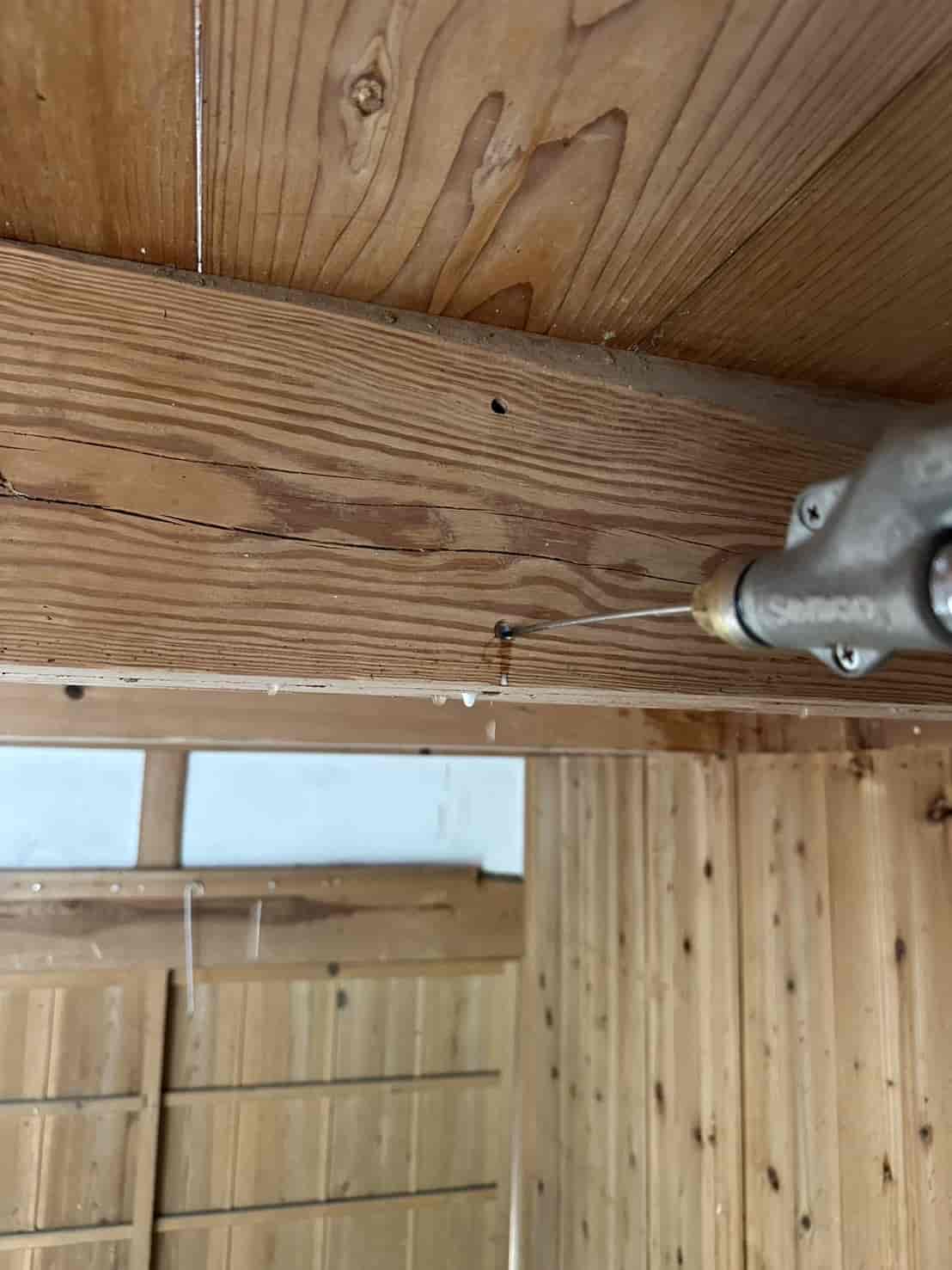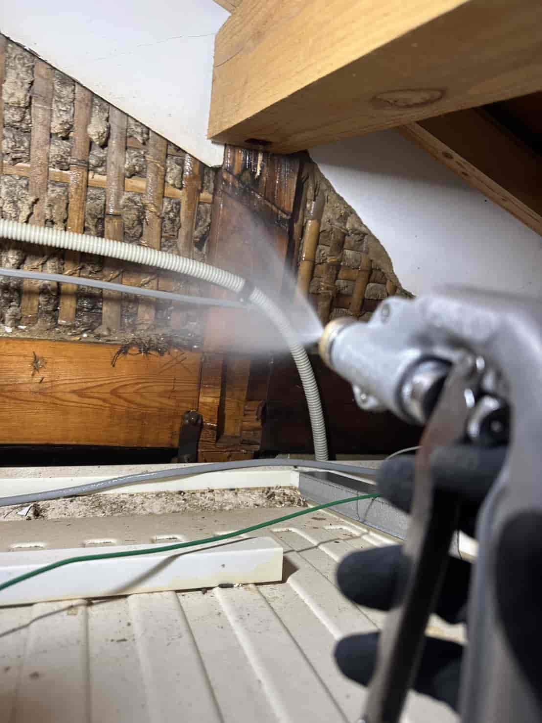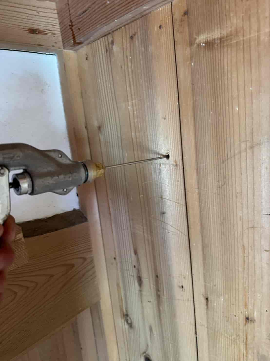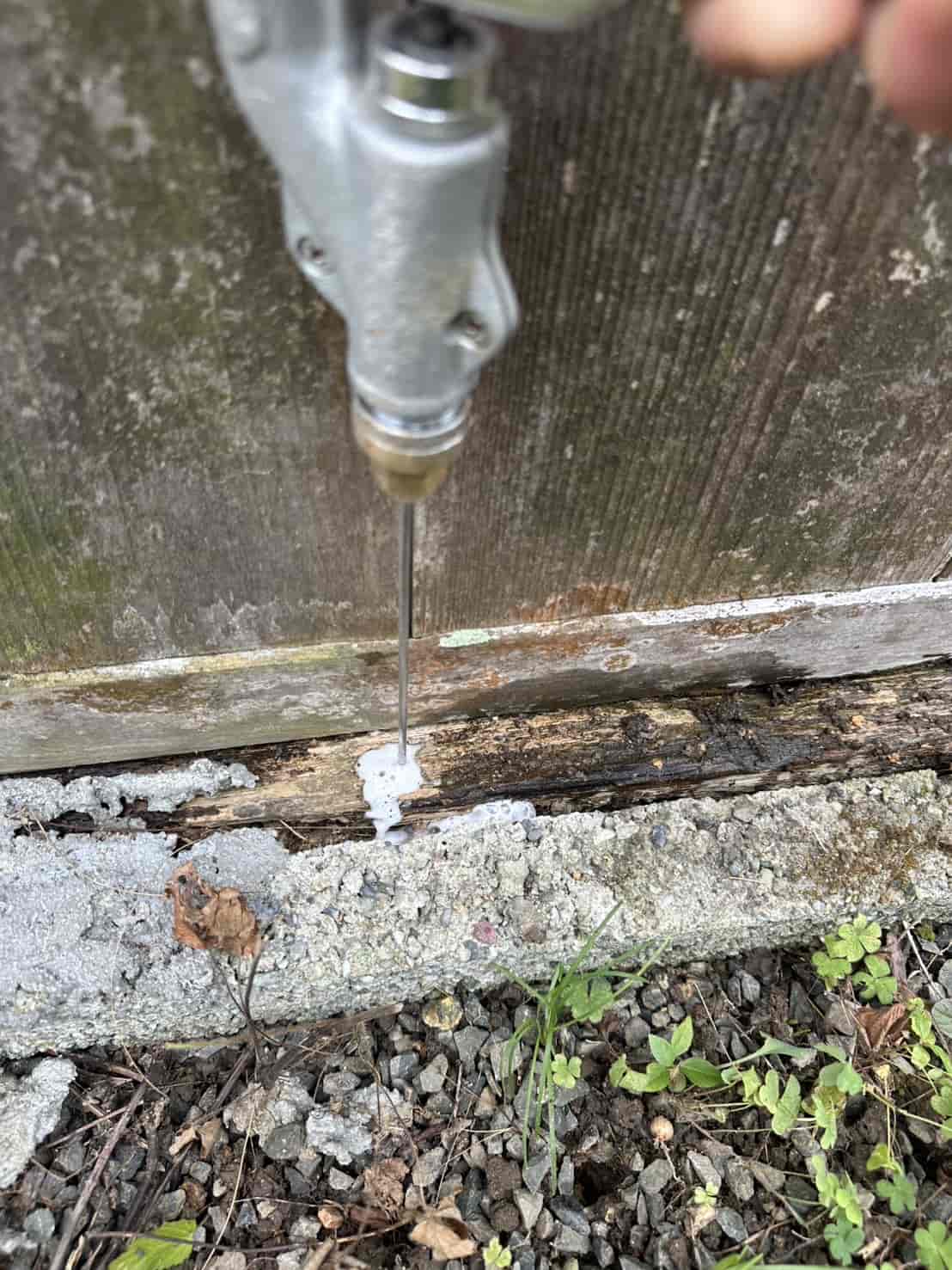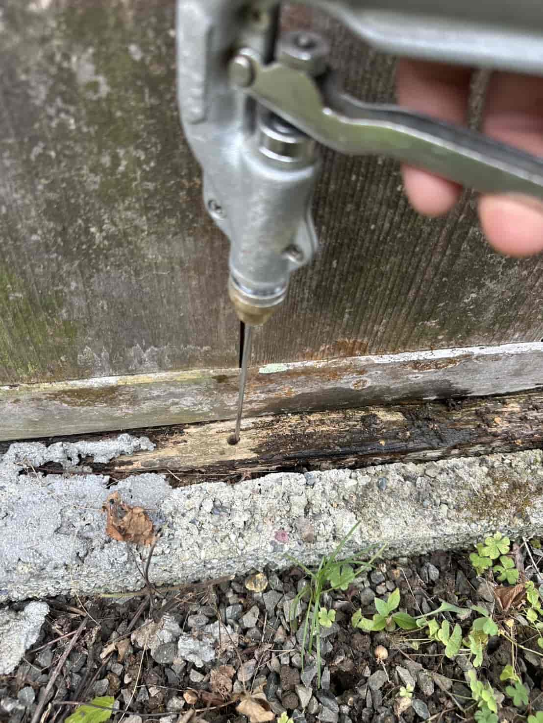 シロアリの被害が壁内部から2階の畳まで達していたため、複数箇所の壁に小さな穴を開け、薬剤を注入しました。目に見えない壁内部に潜む白アリを確実に駆除するための施工であり、建物全体に薬剤が浸透するよう丁寧に処理を行いました。