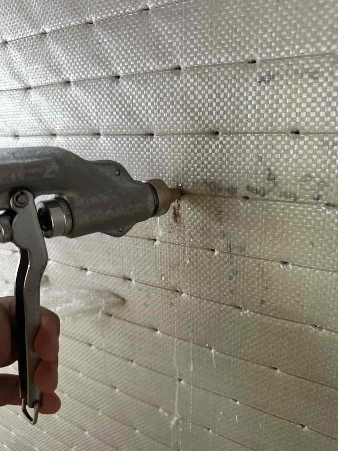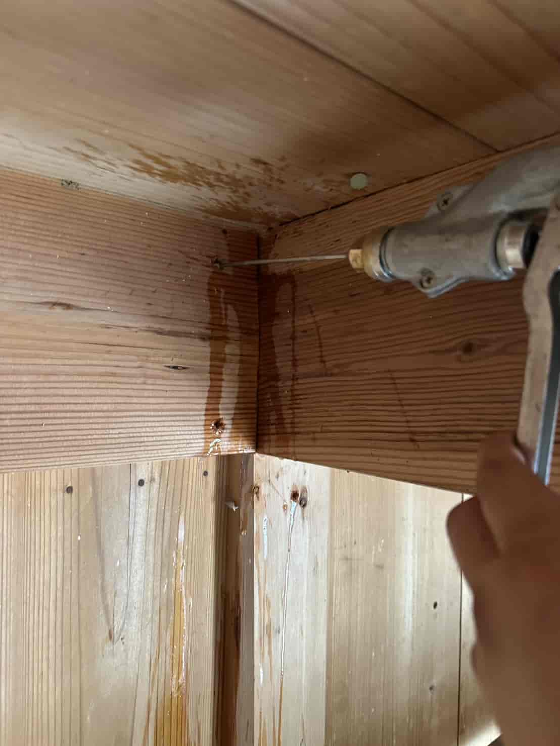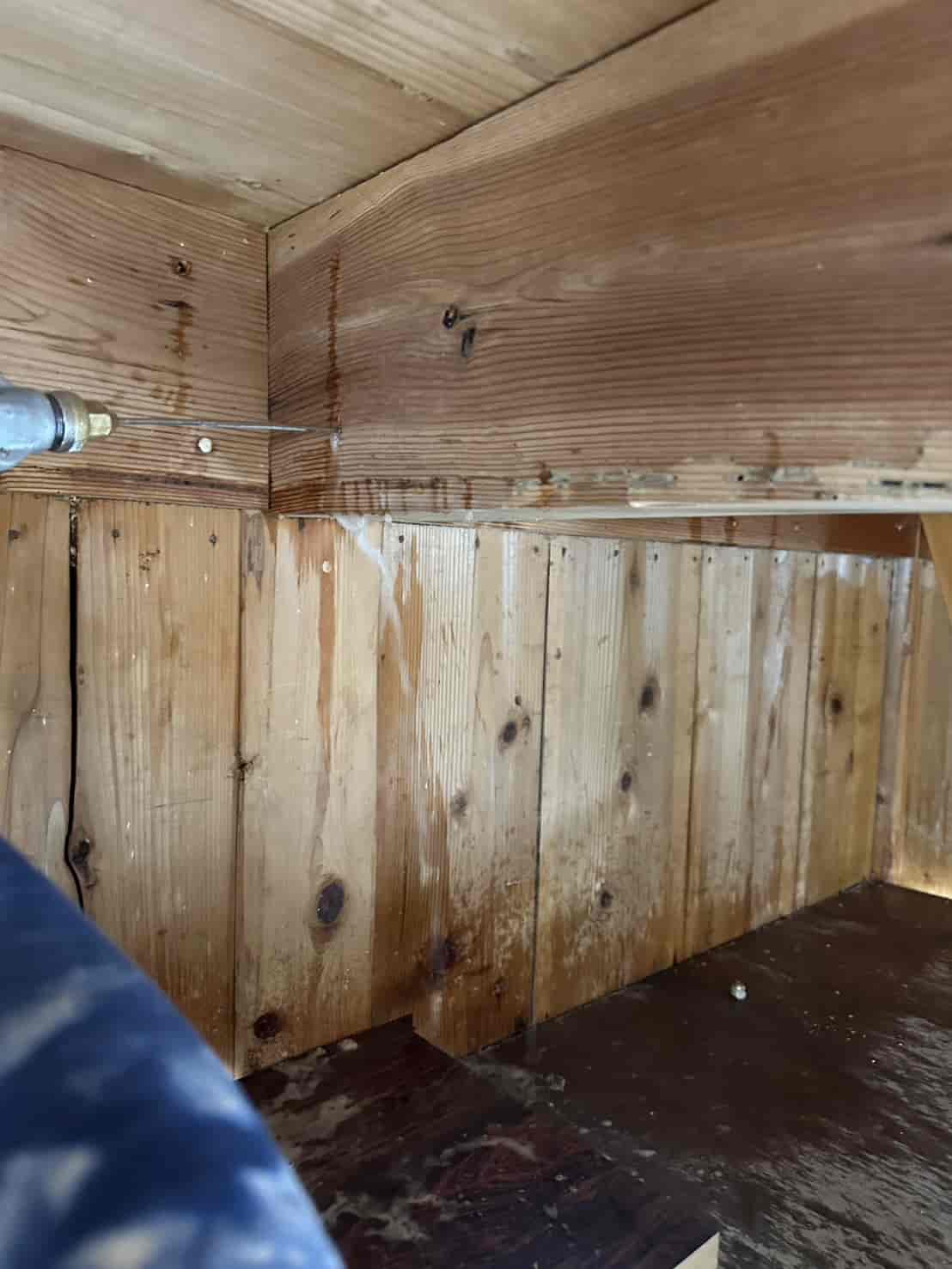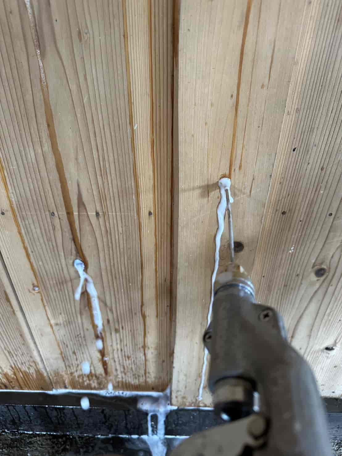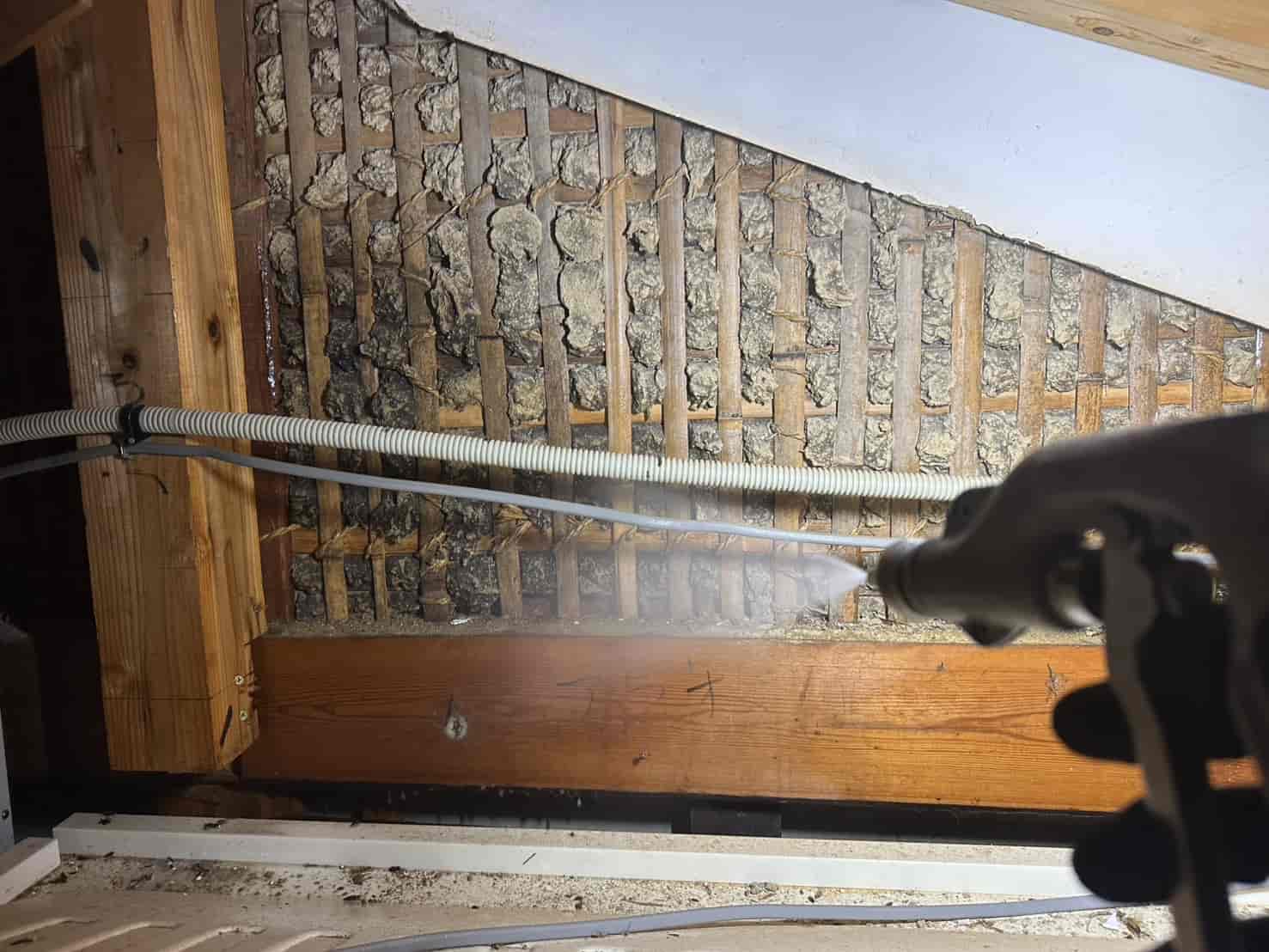 シロアリの被害が壁内部から2階の畳まで達していたため、複数箇所の壁に小さな穴を開け、薬剤を注入しました。目に見えない壁内部に潜む白アリを確実に駆除するための施工であり、建物全体に薬剤が浸透するよう丁寧に処理を行いました。
