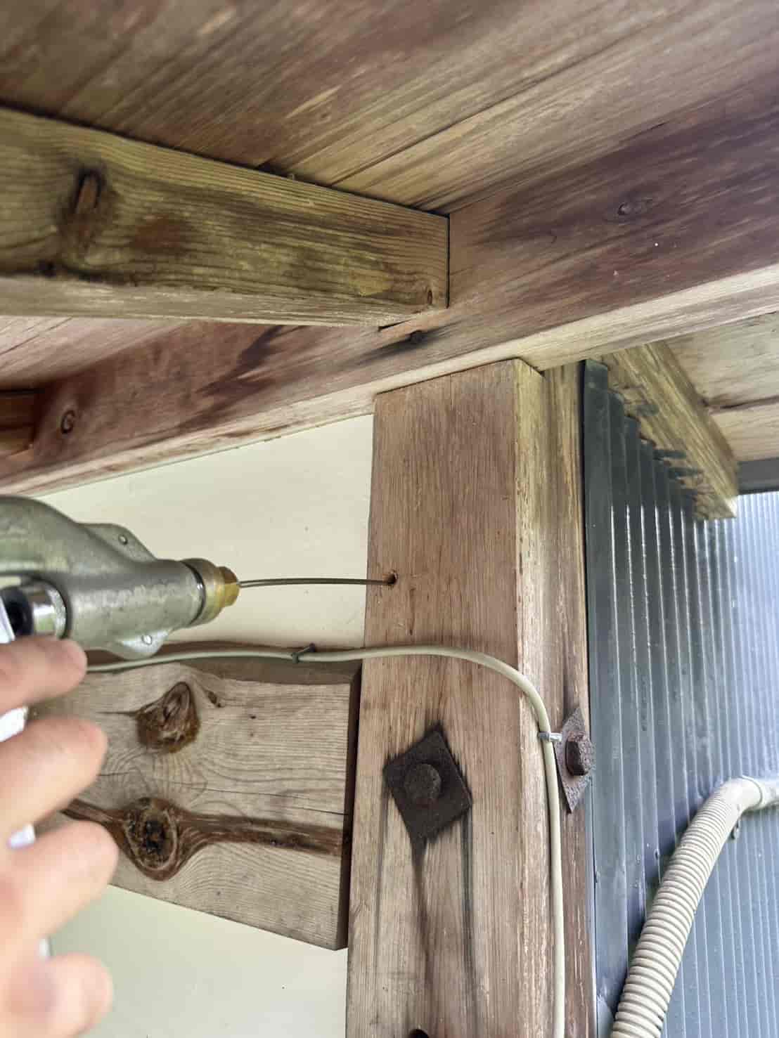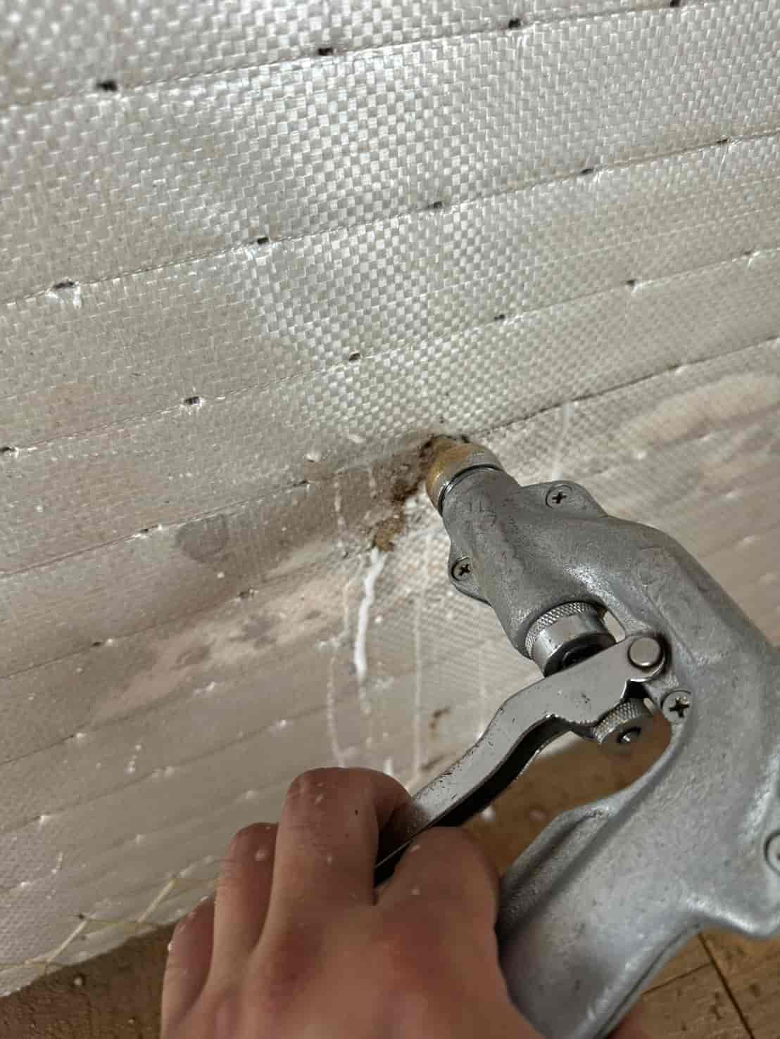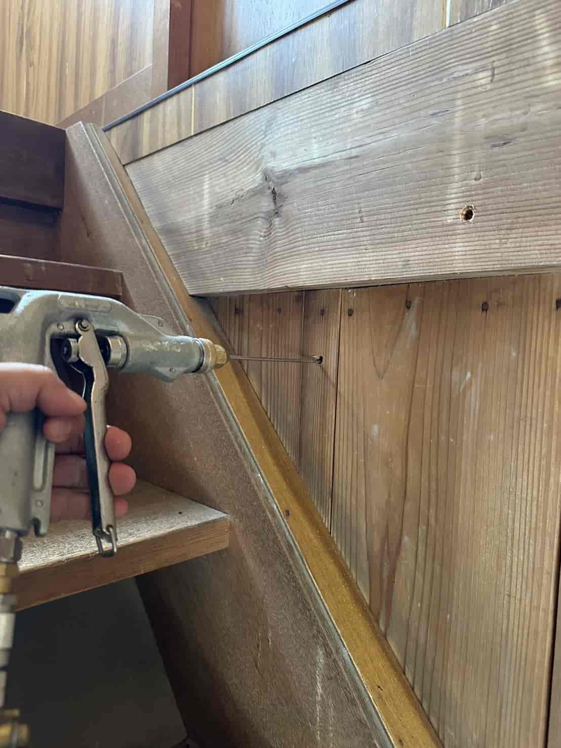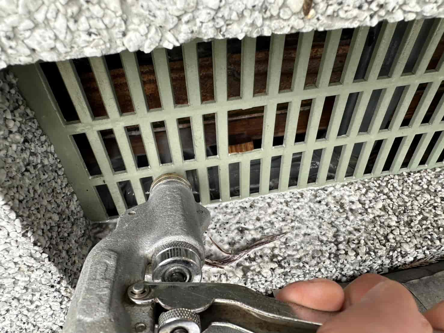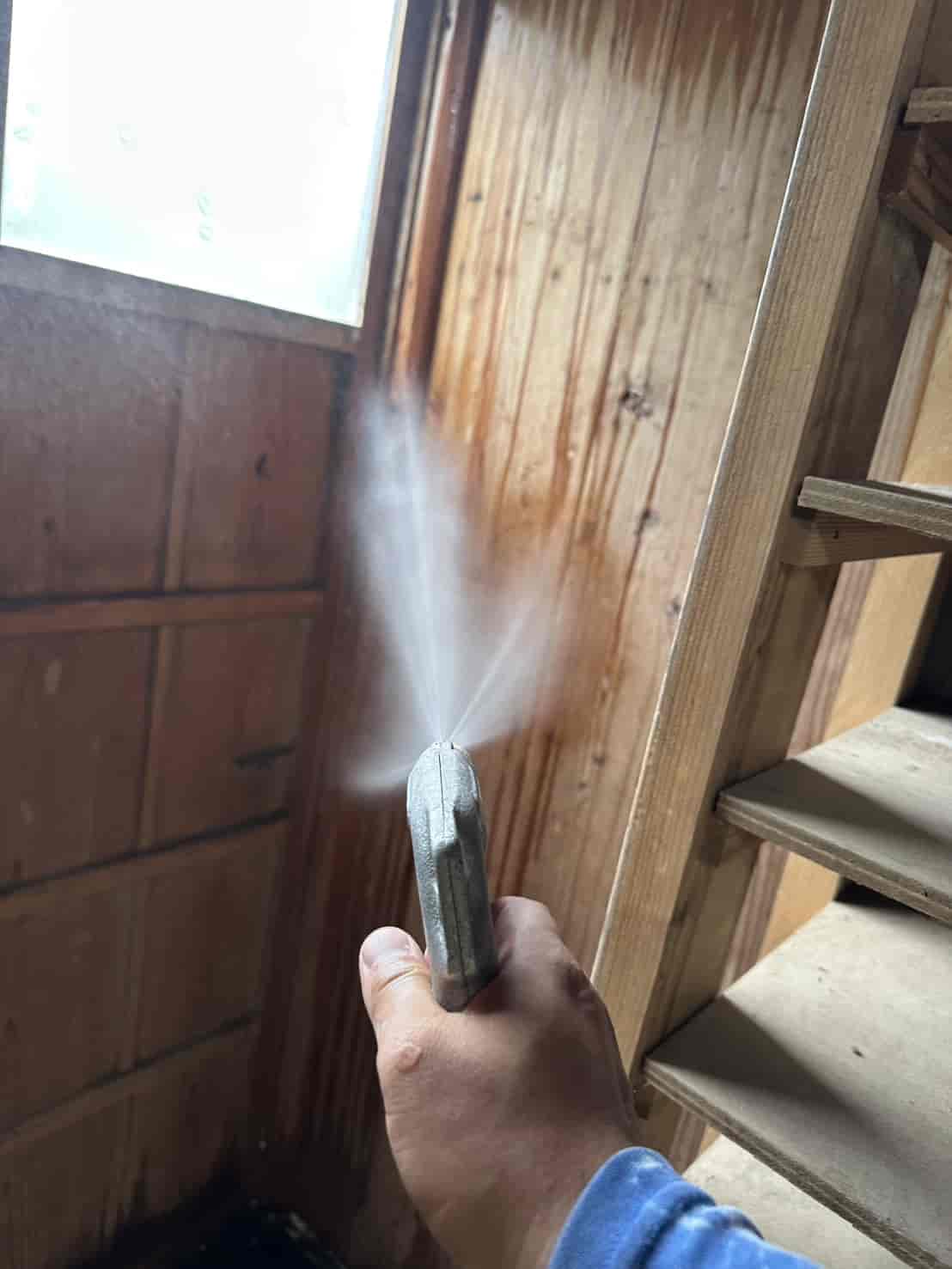 シロアリの被害が壁内部から2階の畳まで達していたため、複数箇所の壁に小さな穴を開け、薬剤を注入しました。目に見えない壁内部に潜む白アリを確実に駆除するための施工であり、建物全体に薬剤が浸透するよう丁寧に処理を行いました。
