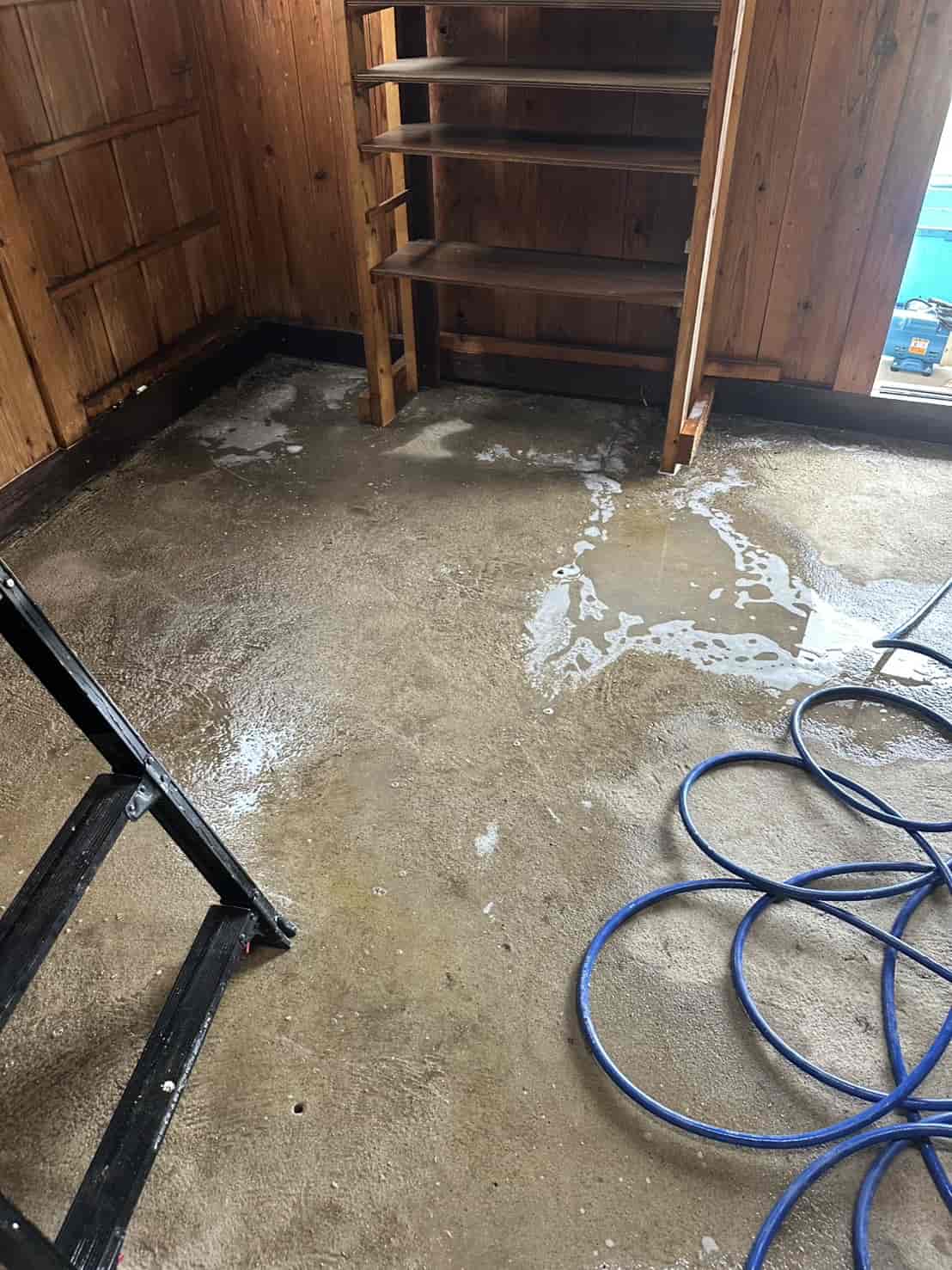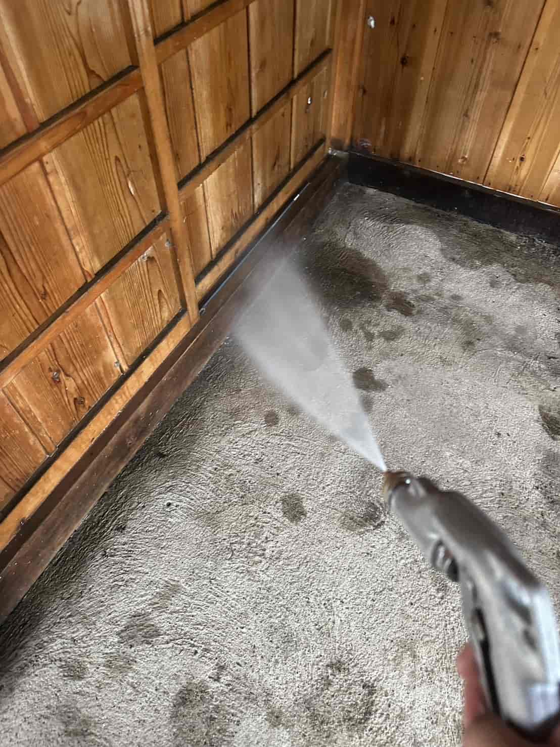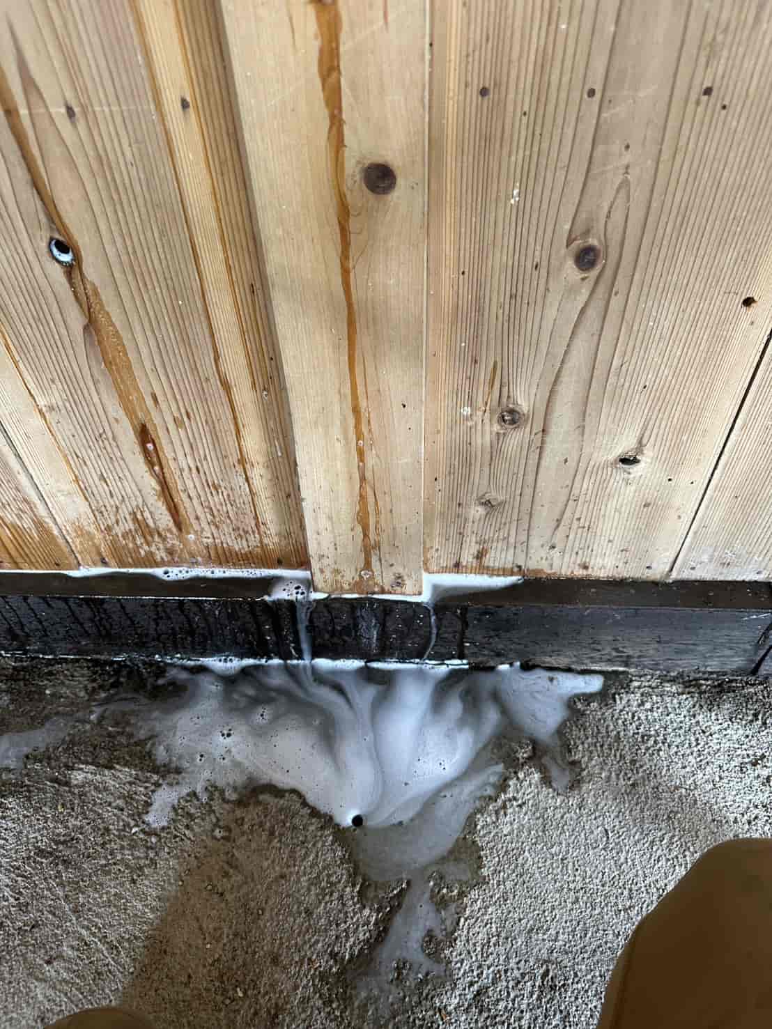 離れの建物は母屋とは構造が異なり、床下の空間がなく土間仕上げになっていました。通常の床下散布による消毒ができない構造であり、薬剤をしっかりと行き渡らせるためには特殊な施工が必要です。調査を進めたところ、白アリはすでに土間から壁の内部へ侵入し、さらに2階の畳部分にまで食害が及んでいる状況でした。ここまで進行すると、構造材や内装材に深刻な被害を与える可能性が高く、放置すれば建物の資産価値を大きく損なう恐れがあります。