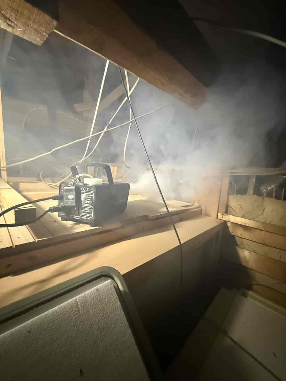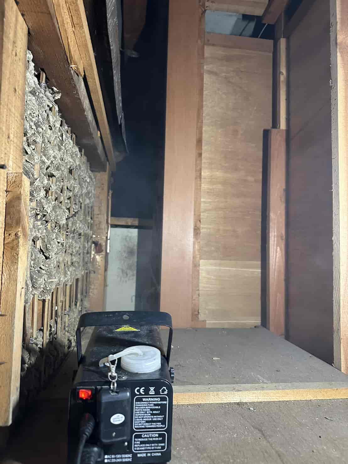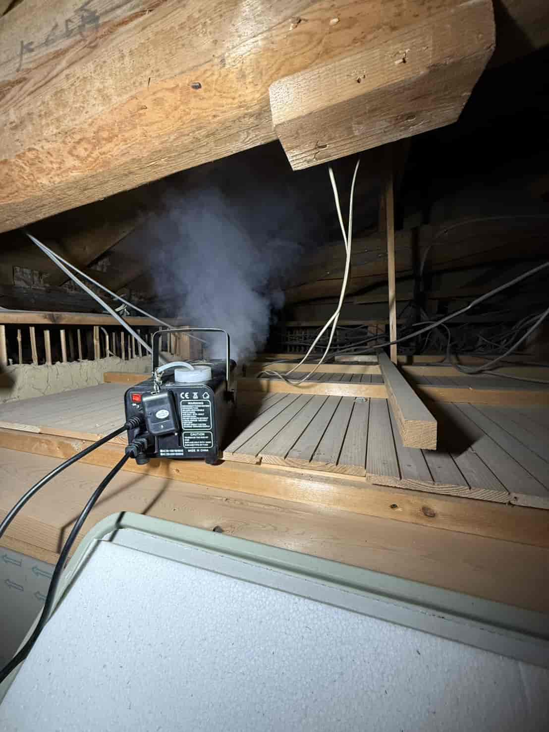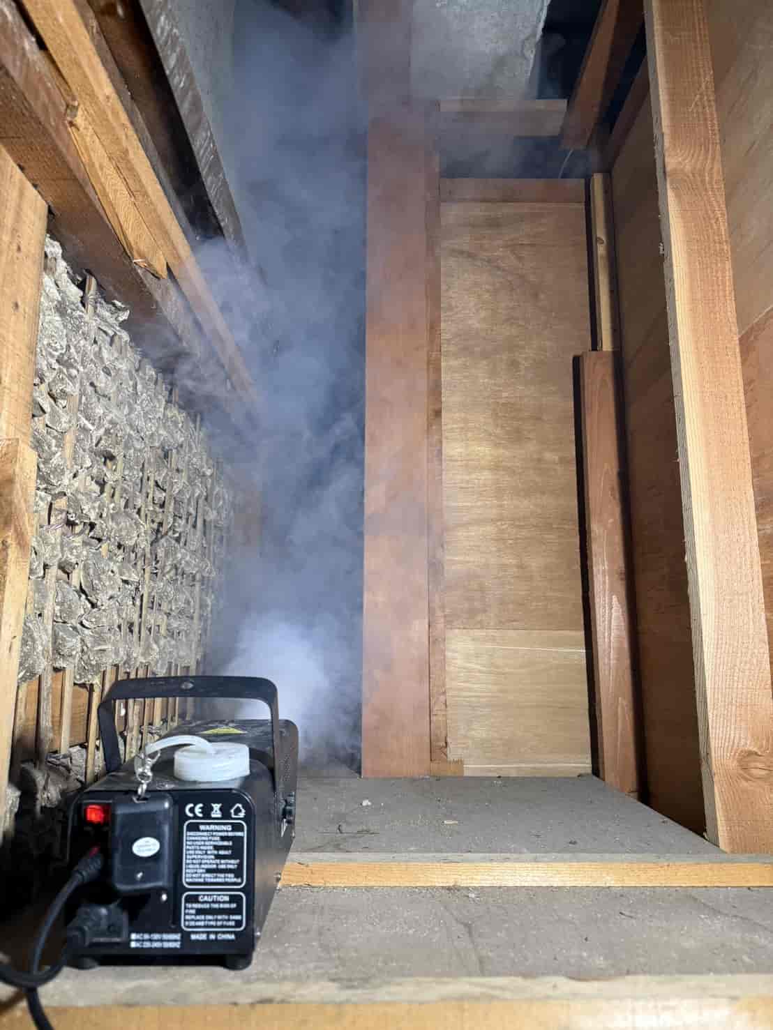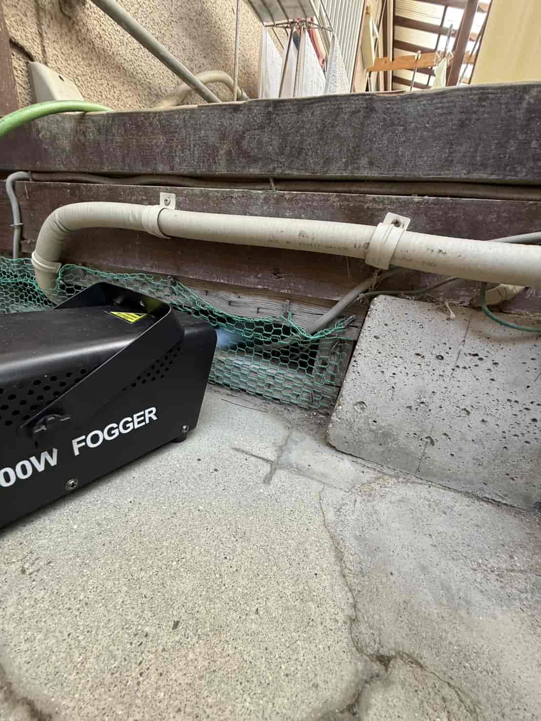 まず最初に行ったのが、追い出し用の燻煙処理です。これは天井裏や壁内に潜んでいるハクビシンを、安全かつ確実に建物外へ出すための重要な工程となります。無理に閉じ込めてしまうと、内部で死亡してしまい、悪臭や害虫発生の原因になります。そのため、封鎖作業の前に必ず追い出し処理を行います。