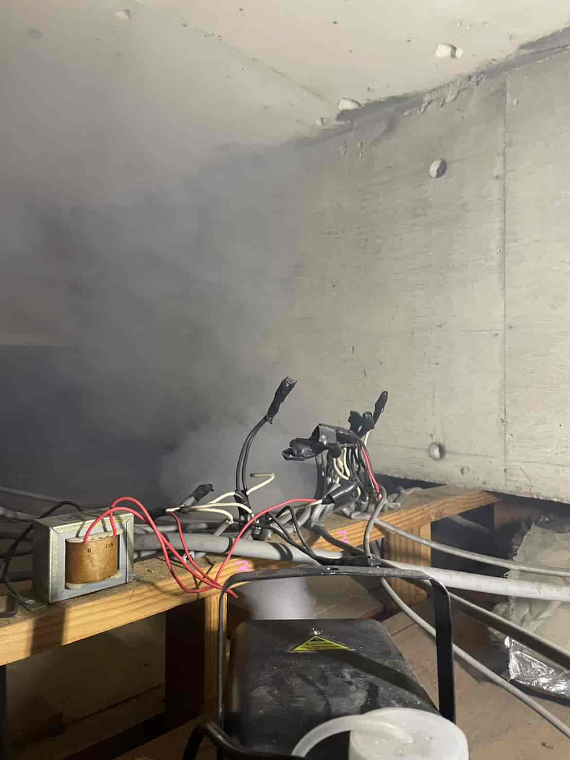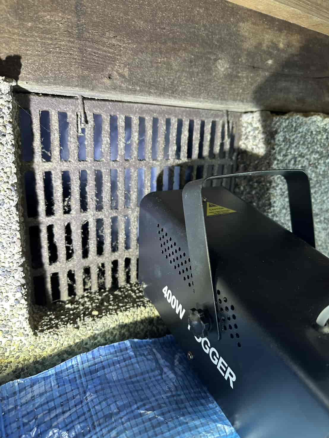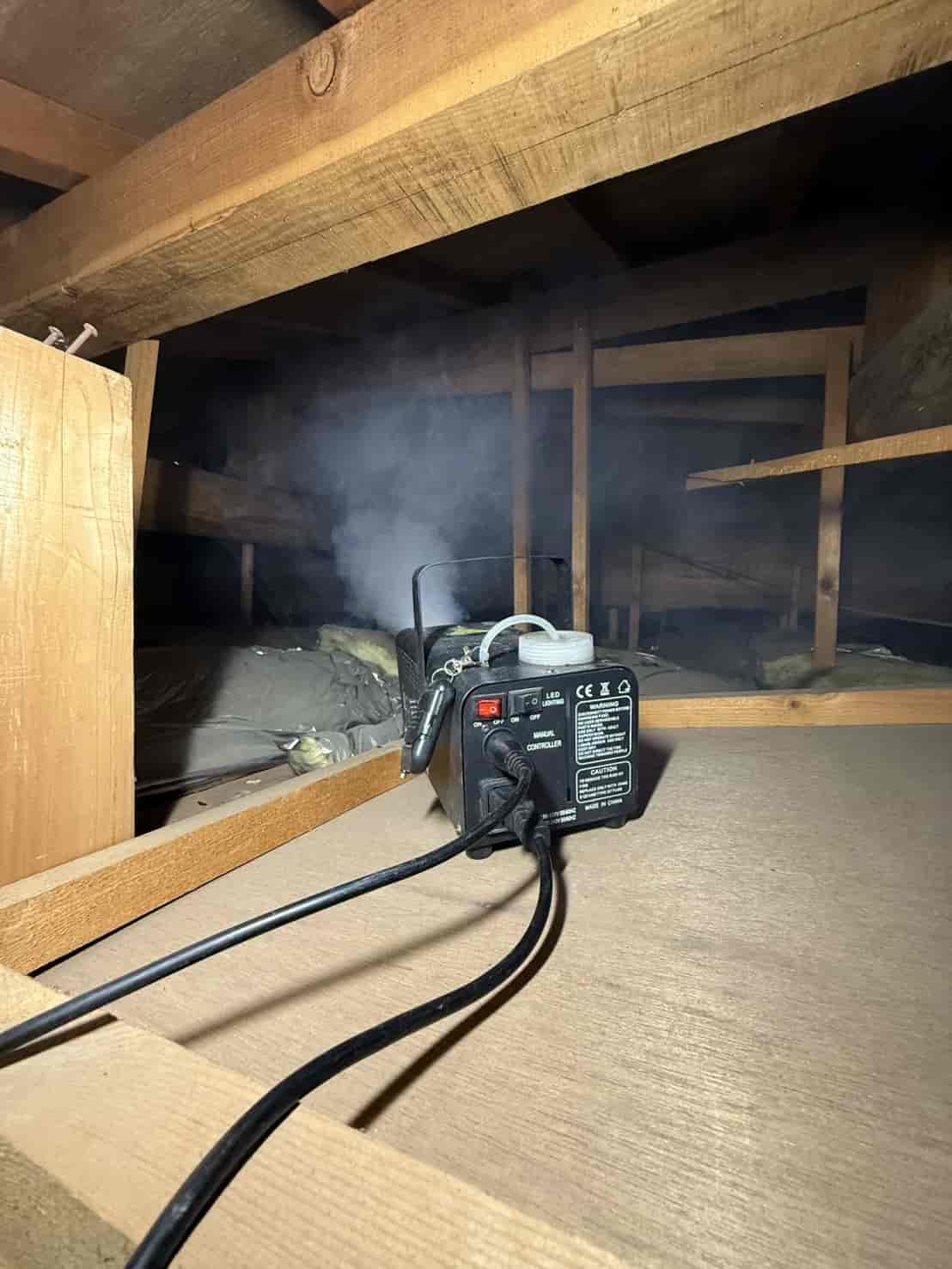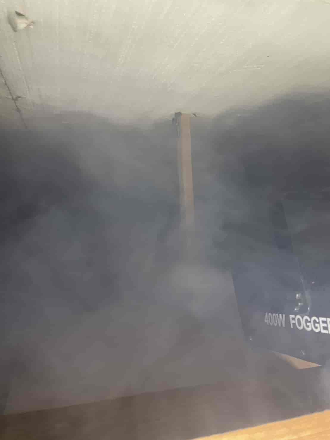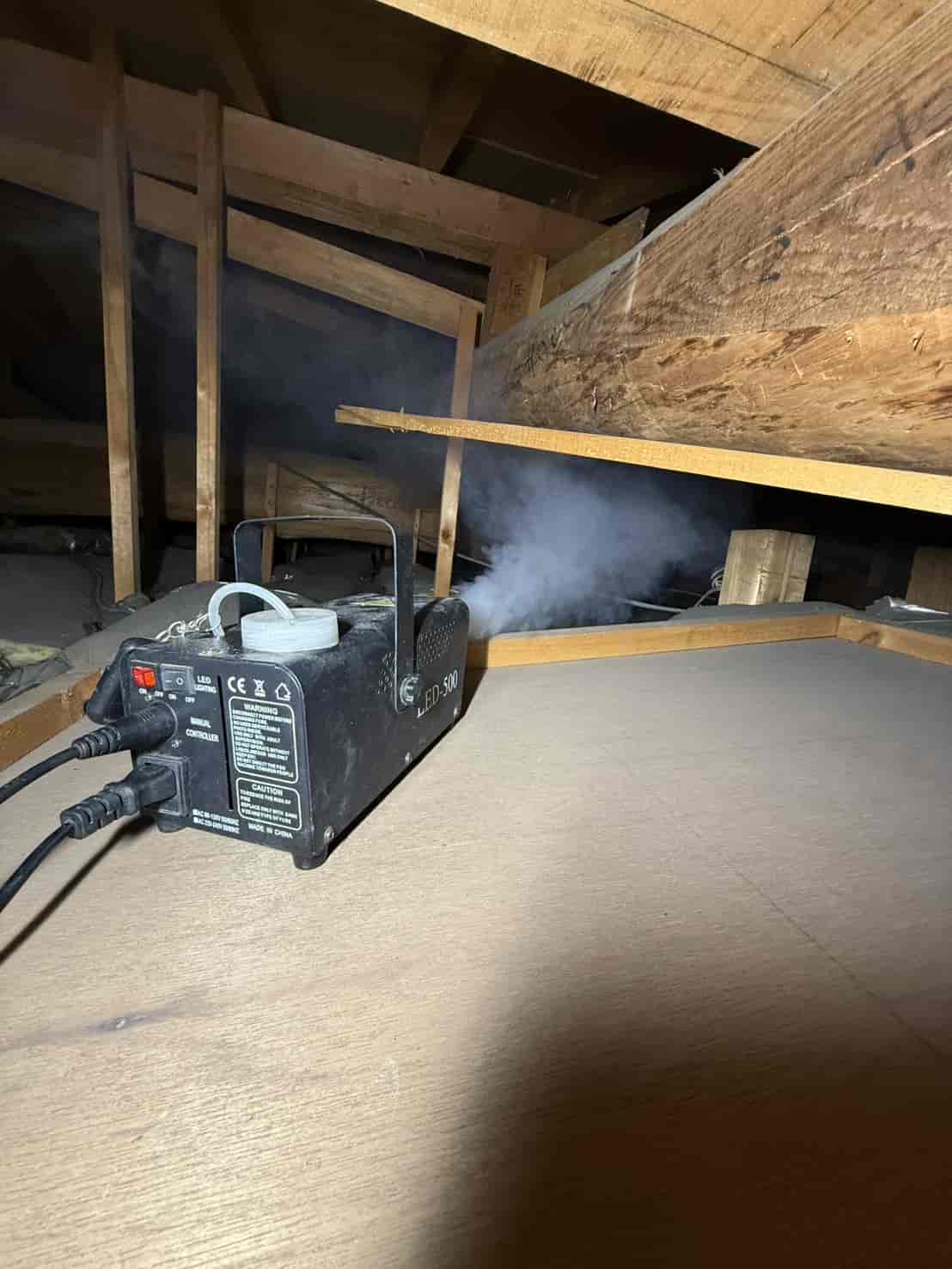 まず最初に行ったのが、追い出し用の燻煙処理です。これは天井裏や壁内に潜んでいるハクビシンを、安全かつ確実に建物外へ出すための重要な工程となります。無理に閉じ込めてしまうと、内部で死亡してしまい、悪臭や害虫発生の原因になります。そのため、封鎖作業の前に必ず追い出し処理を行います。