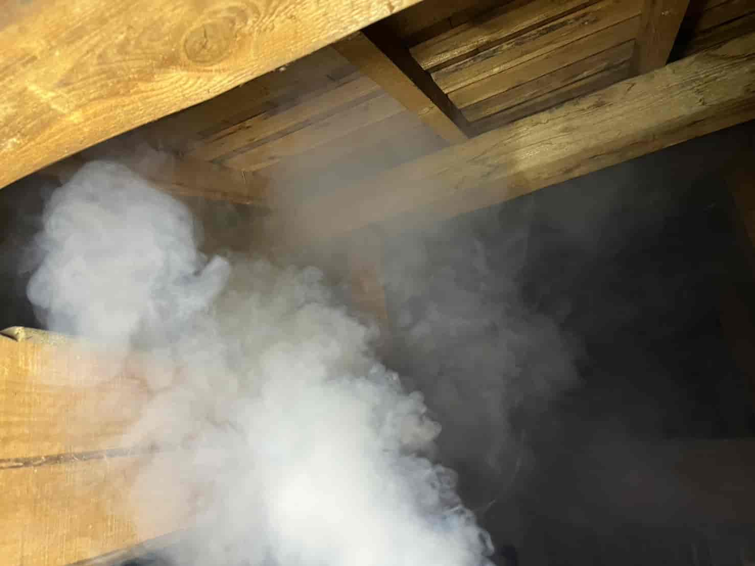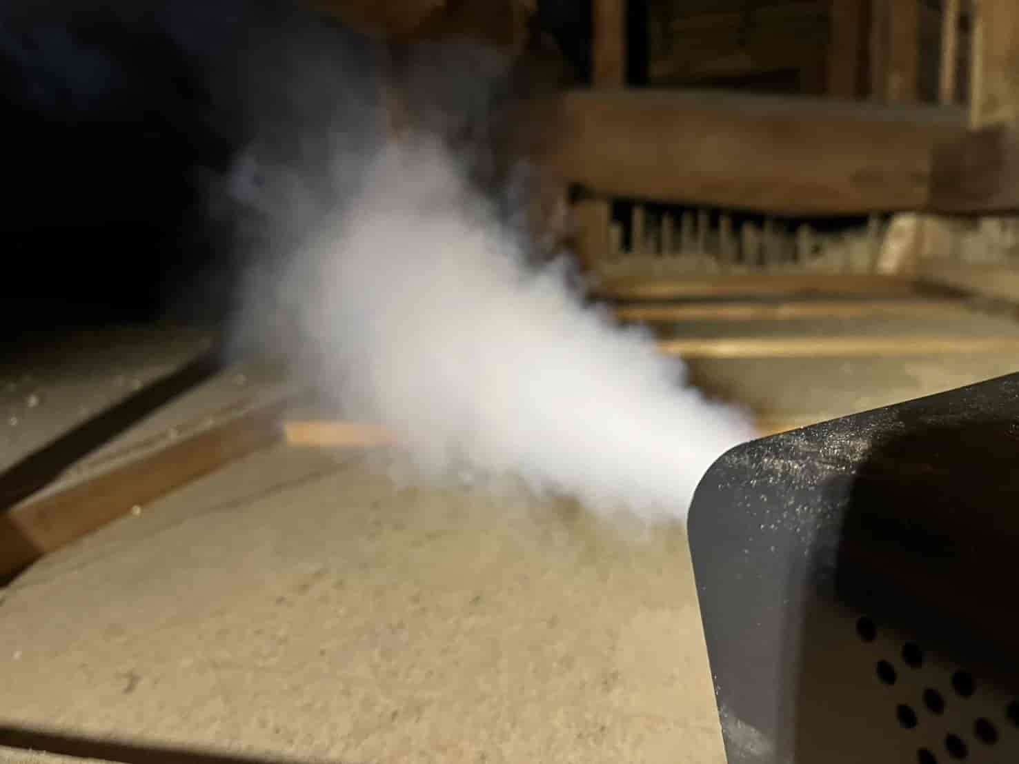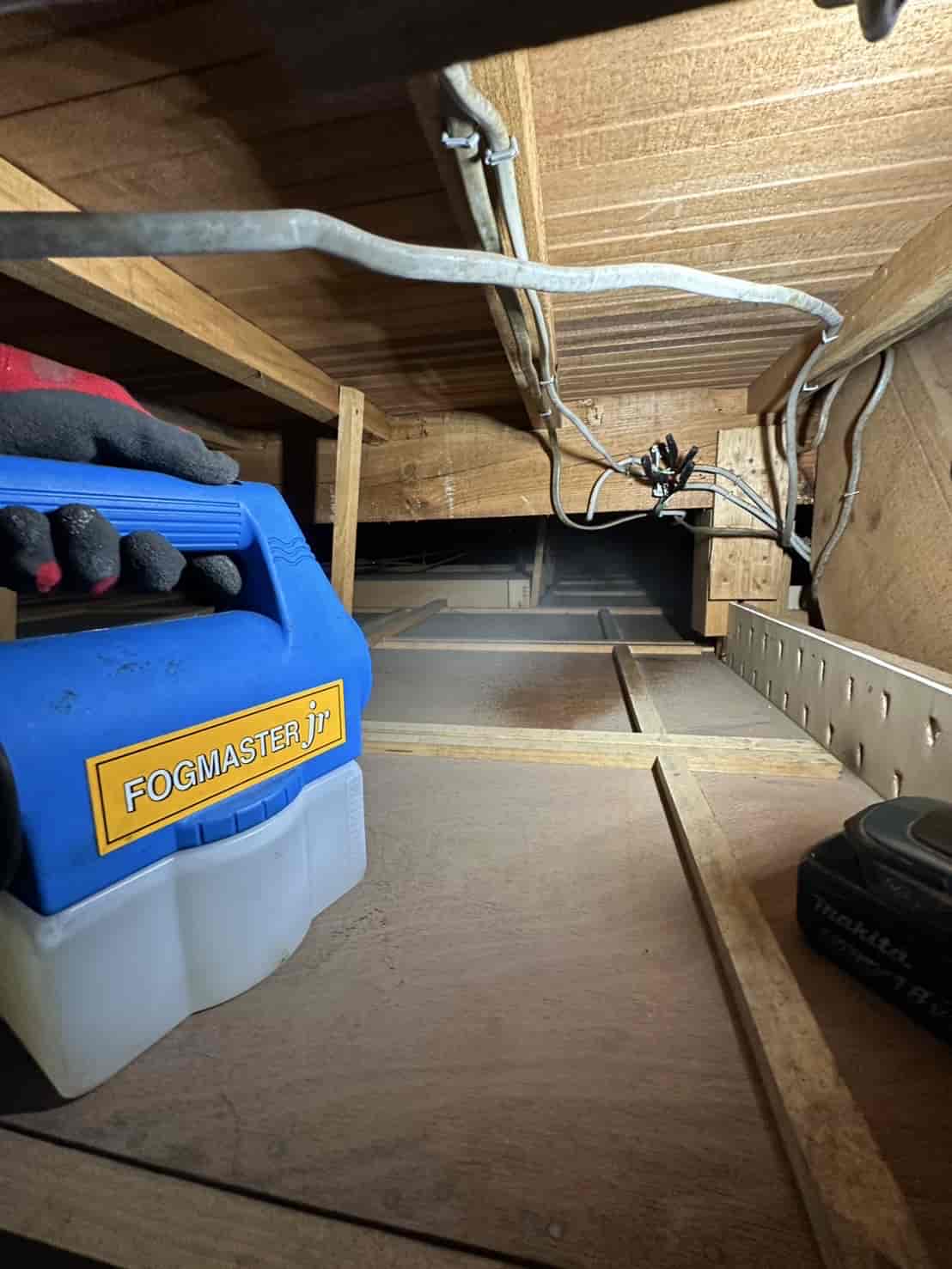天井裏へ忌避型の専用燻煙スモーク剤を焚き込みました。