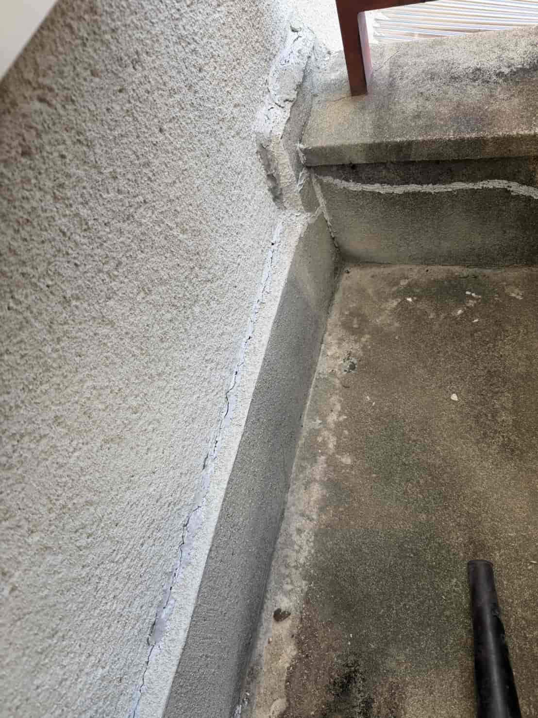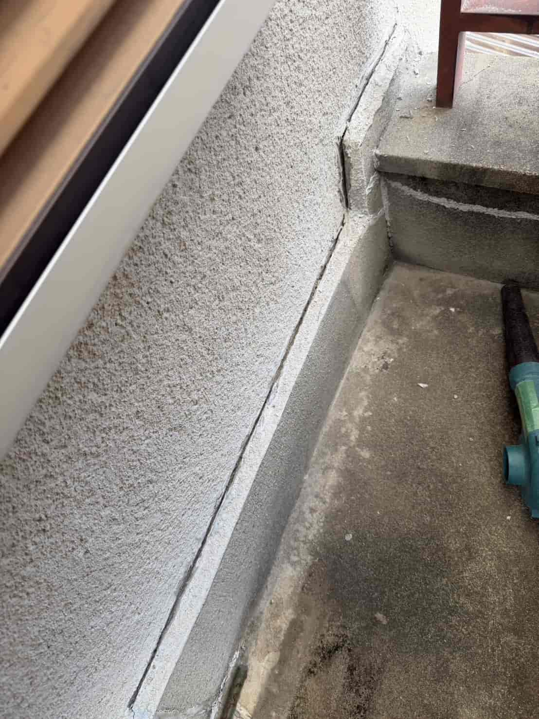【対応】外壁の大きなひび割れによる雨漏りのご相談を受け現地調査を実施。クラックから雨水が浸入している可能性が高かったため、応急処置としてVカット加工を行い、内部までしっかりコーキングを充填して止水処理を実施しました。