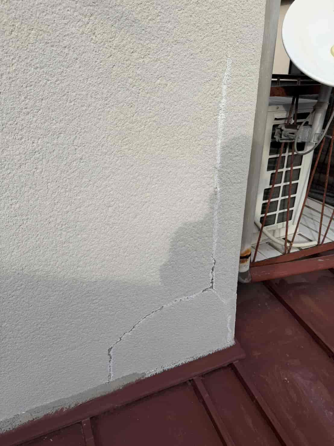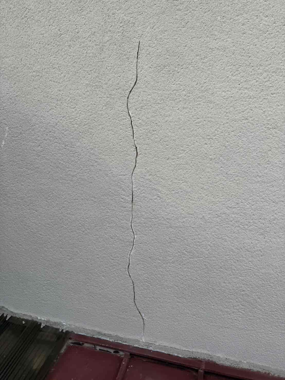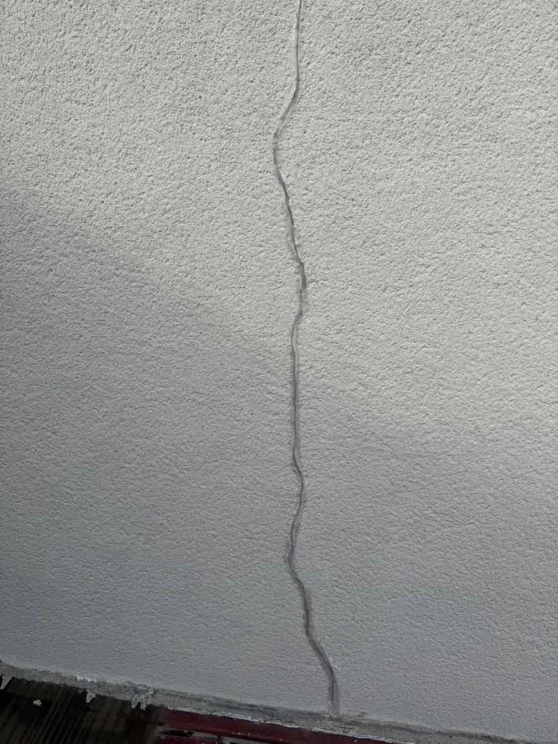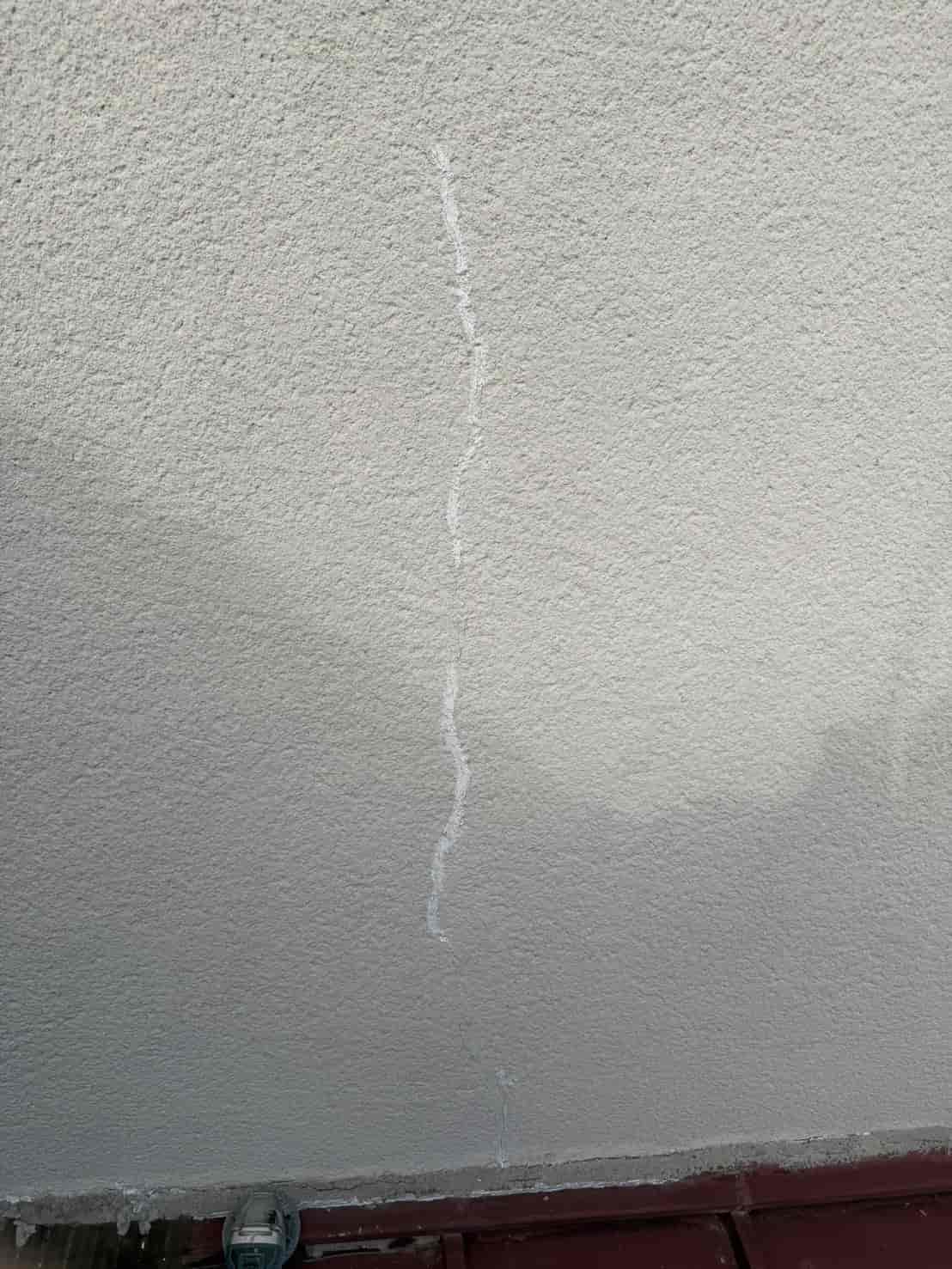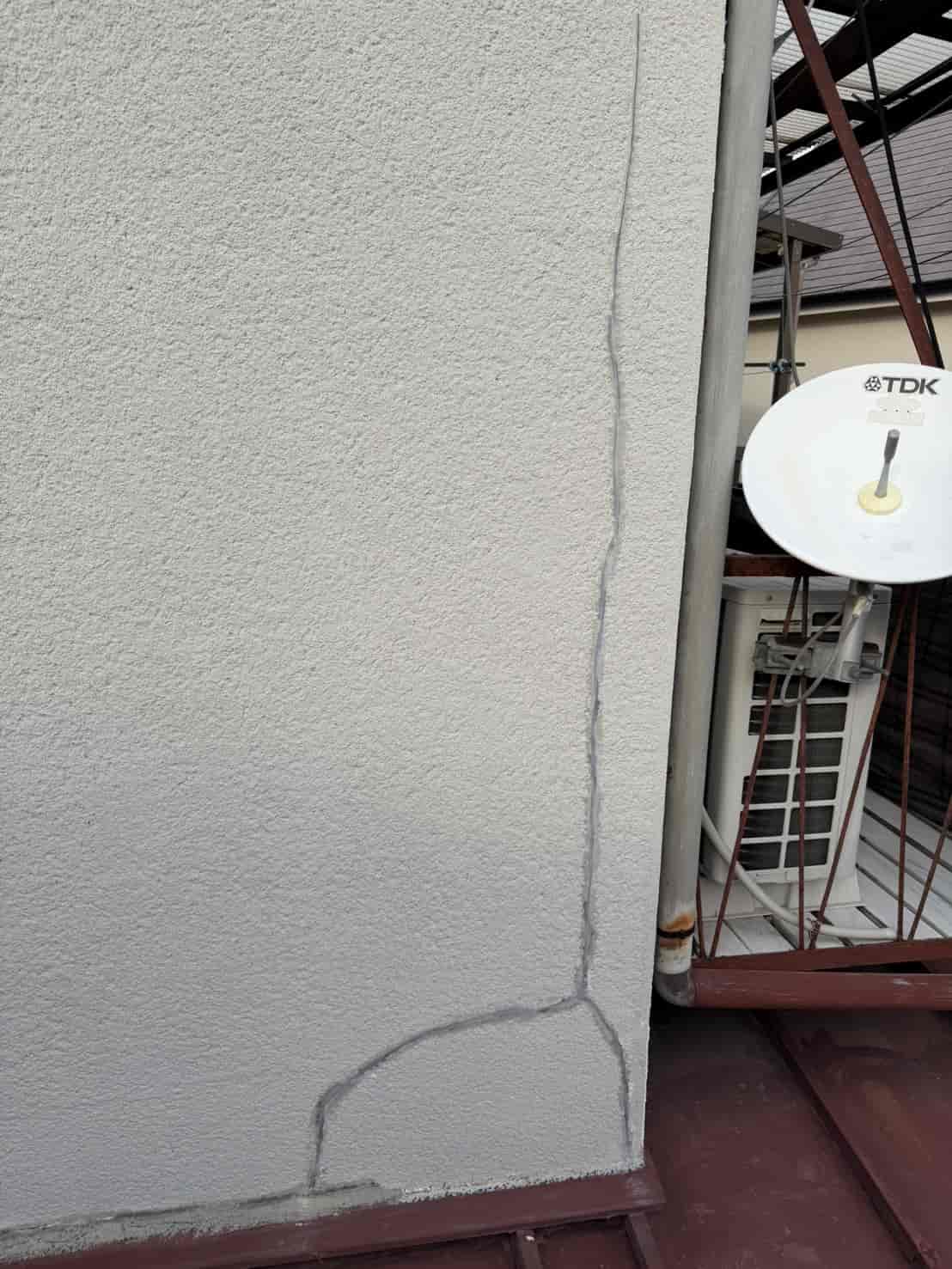 現地を確認すると、外壁に縦方向へ大きく伸びるクラック(ひび割れ)があり、その箇所から雨水が浸入している可能性が高い状況でした。