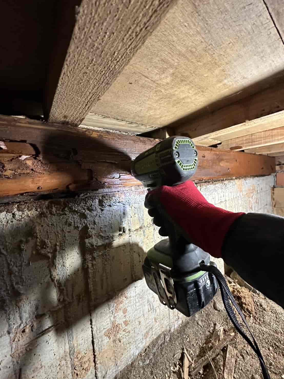 被害が確認された木部については、内部まで確実に処理するため穿孔注入処理を行いました。