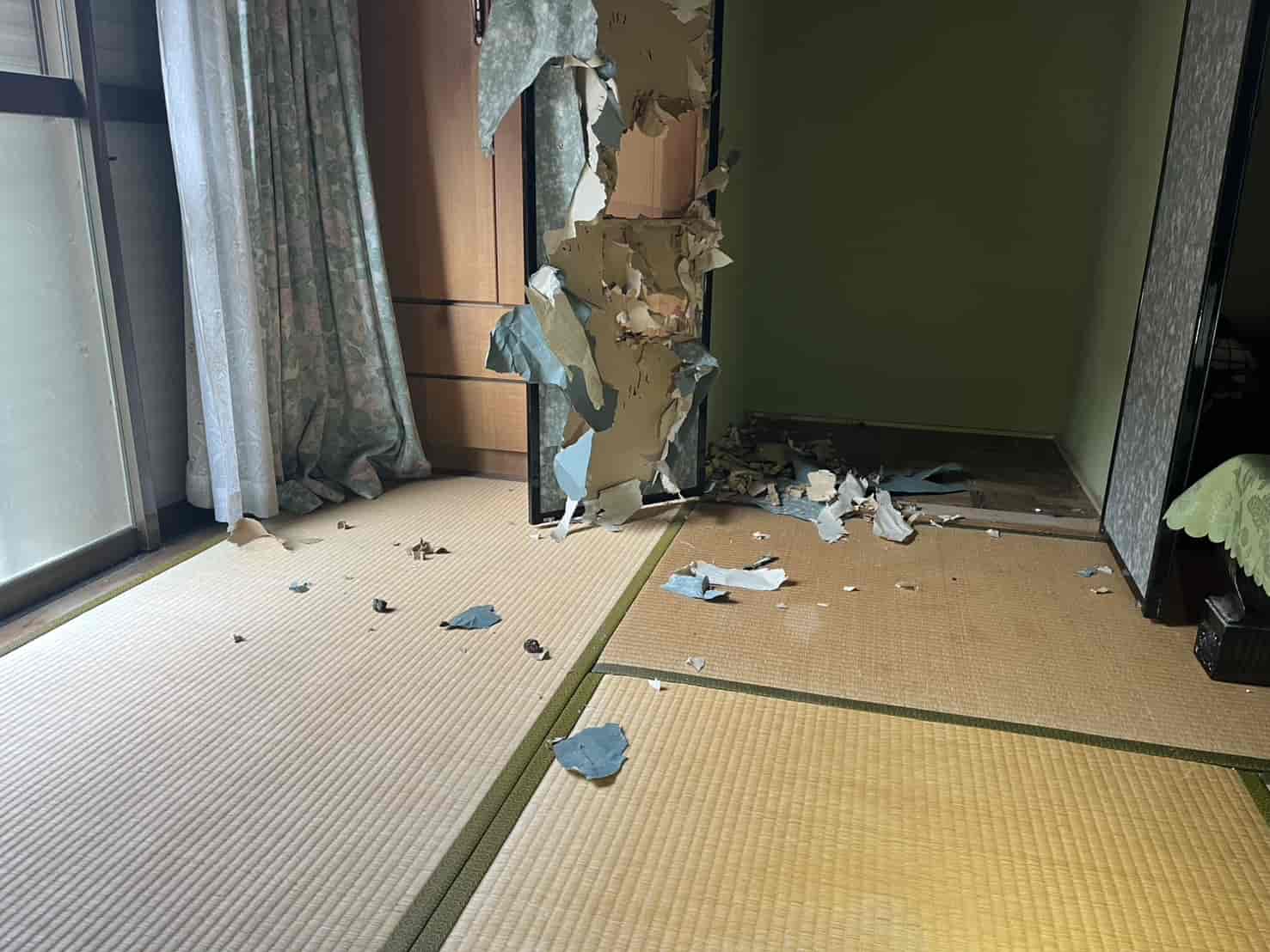 【対応】まずアライグマを安全に住宅外へ追い出し、その後、室内に残された糞尿による臭いや衛生被害を改善するために消毒・除菌作業を行いました。最後に侵入経路を特定し、金網などの専用資材で封鎖することで、再び侵入されないよう対策まで一括して対応しています。