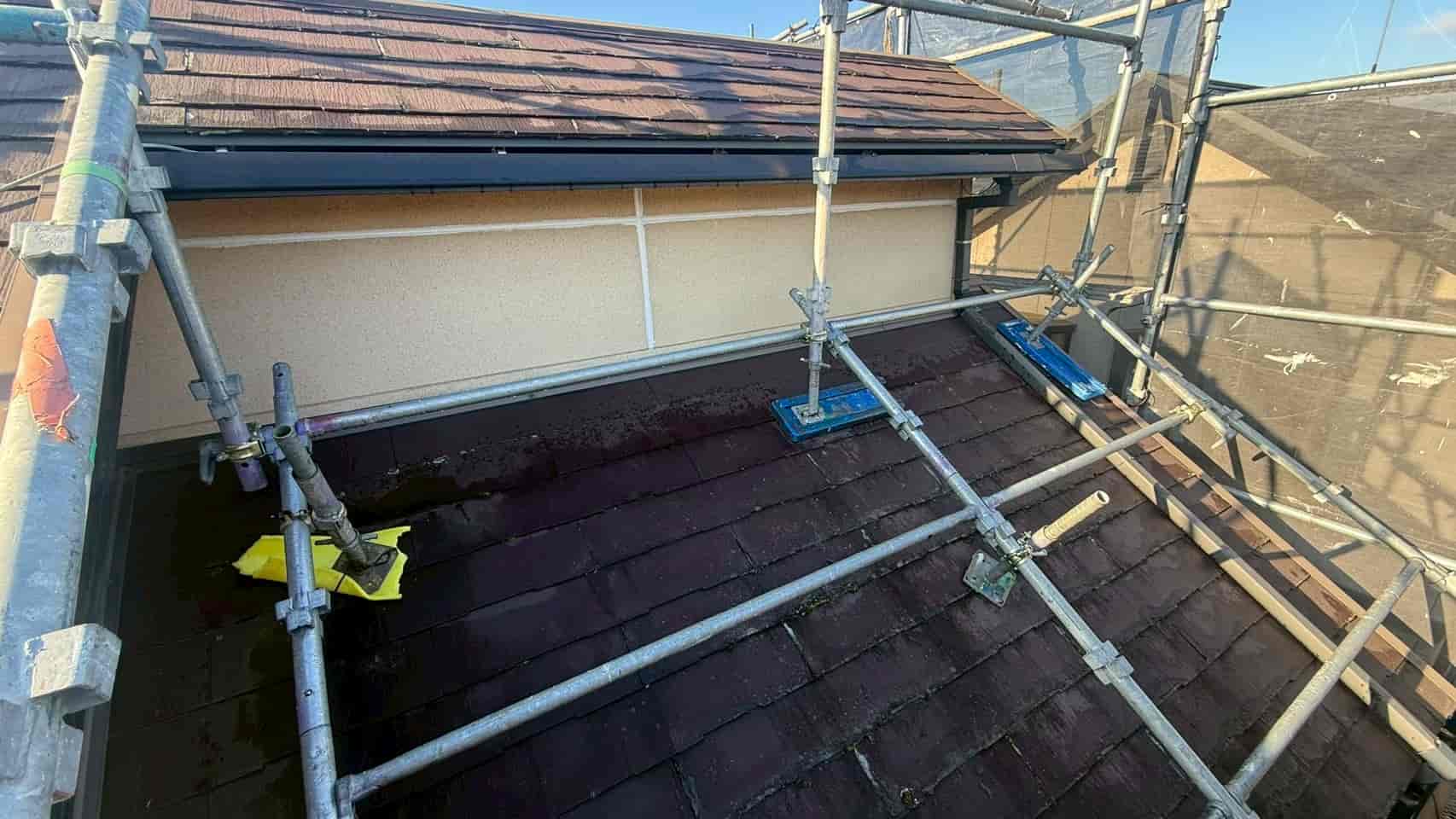 カラーベストは軽量で施工性が高く、住宅で広く使用されている屋根材ですが、経年によって防水性能が低下しやすく、定期的なメンテナンスが必要となる屋根材でもあります。今回の現場でも、表面の塗膜劣化や細かなひび割れが確認され、このまま放置すると雨水の侵入リスクが高まる状況でした。