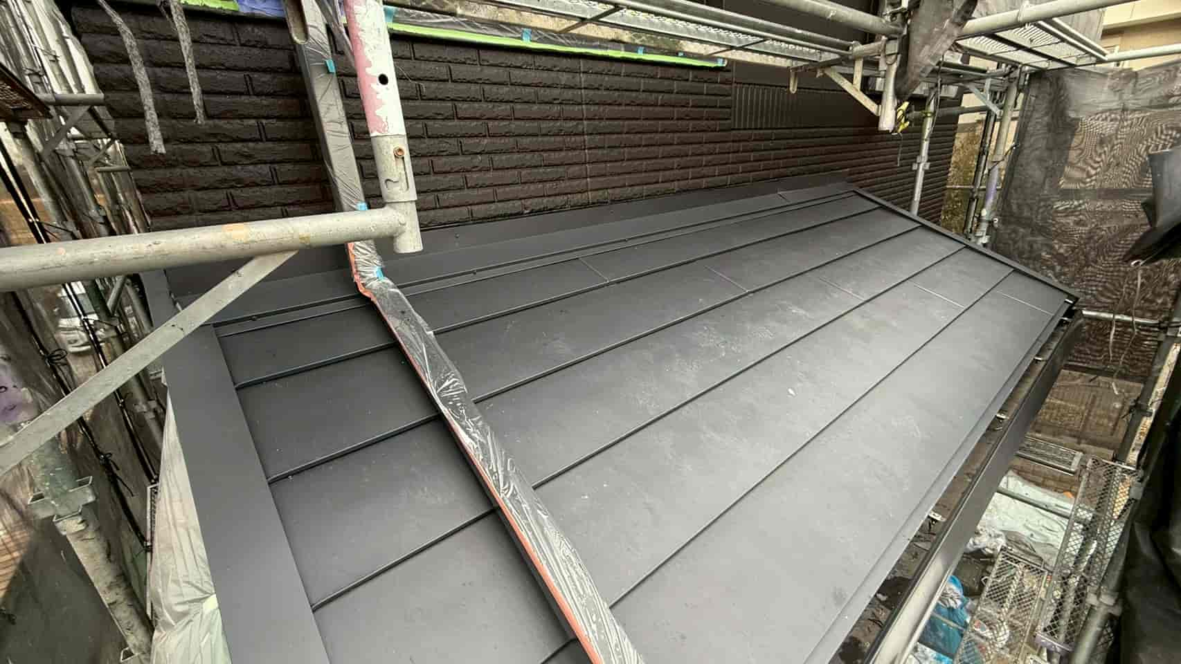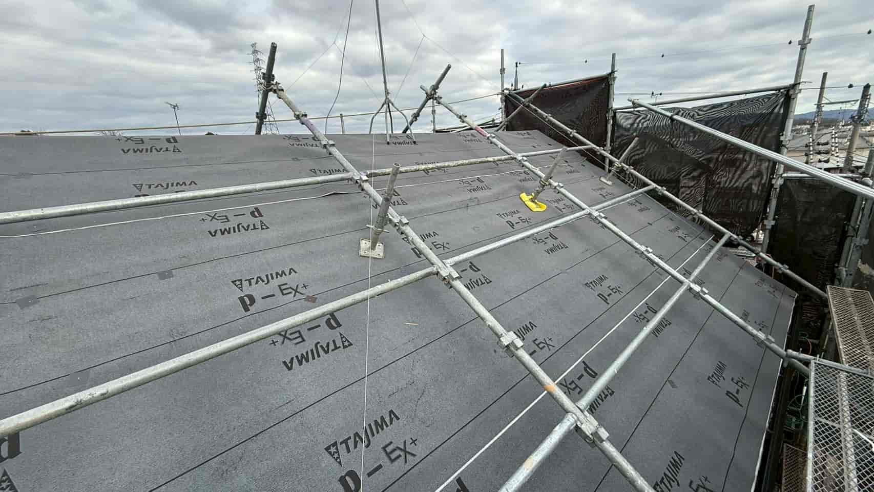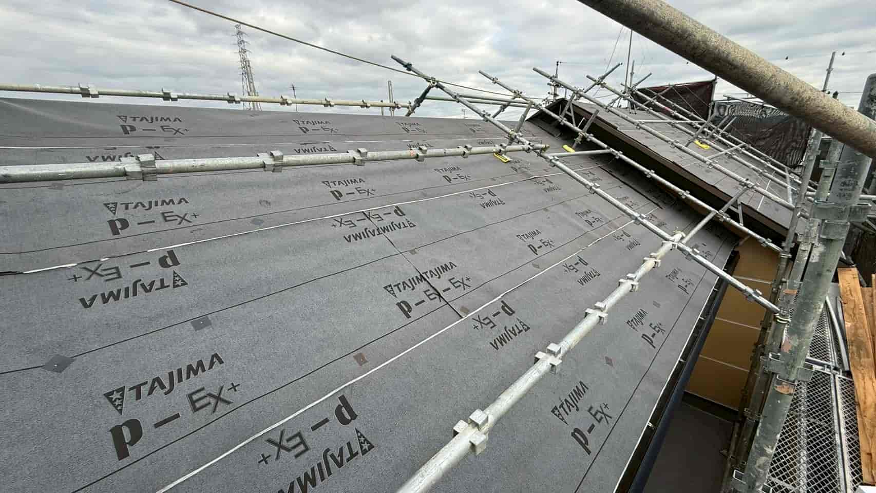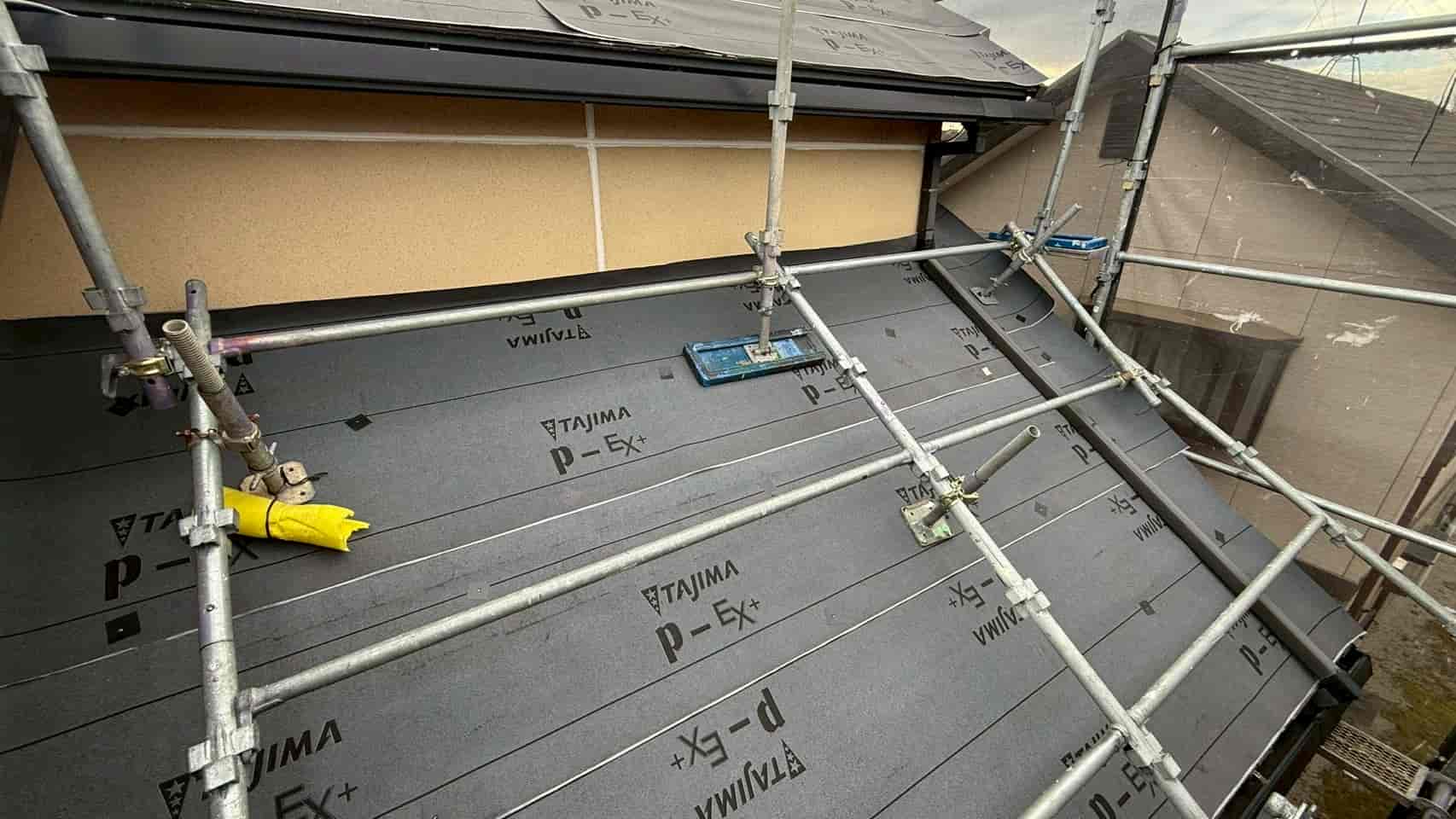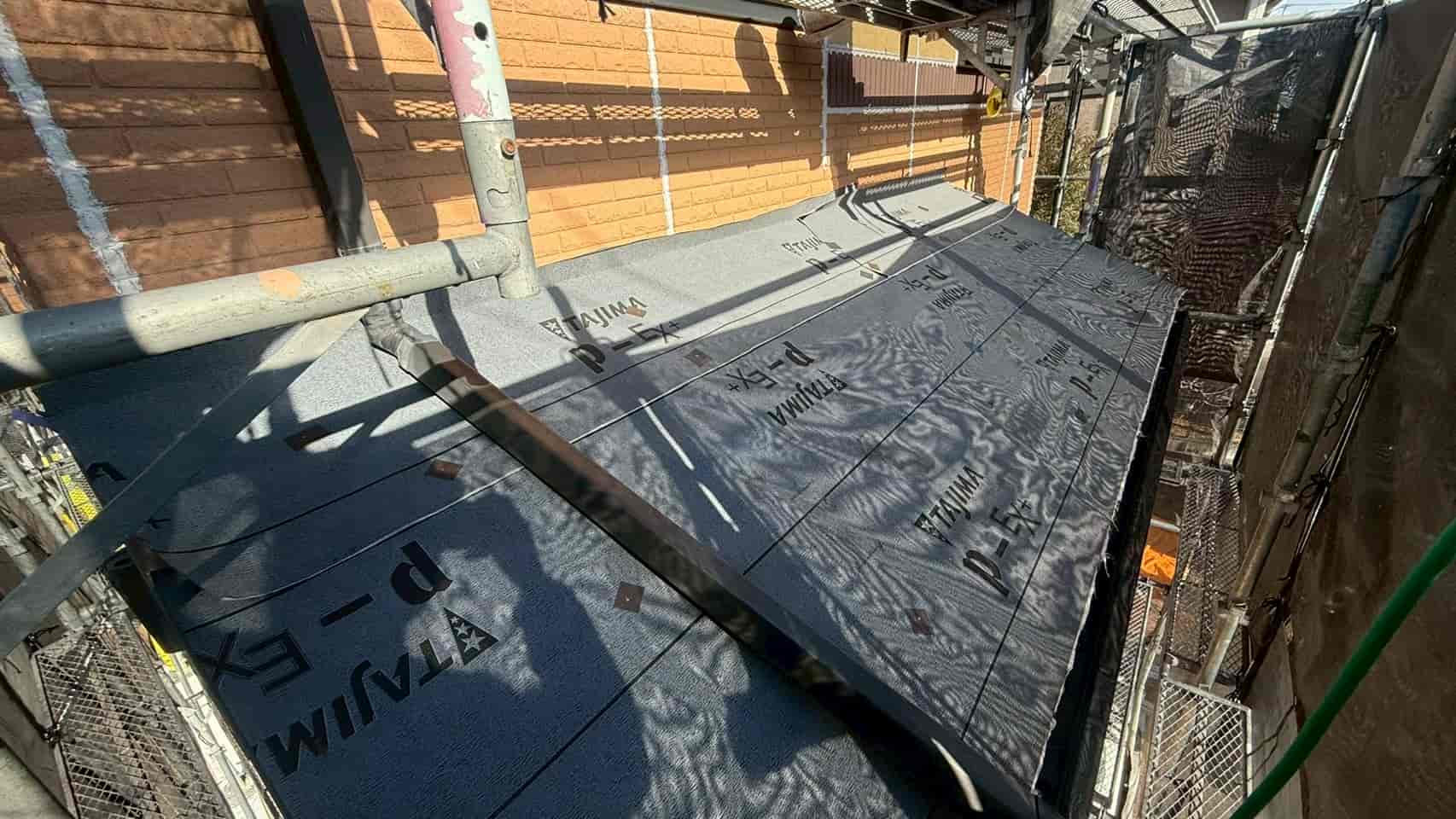 既存屋根の上からルーフィング(防水シート)を全面に施工しました。カバー工法において、この防水層は非常に重要であり、万が一屋根材の隙間から水が侵入した場合でも、内部への浸水を防ぐ役割を果たします。