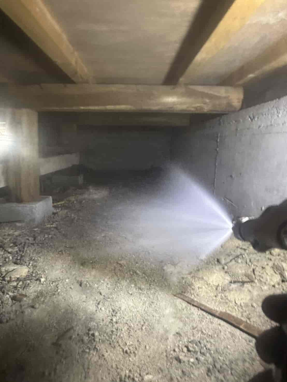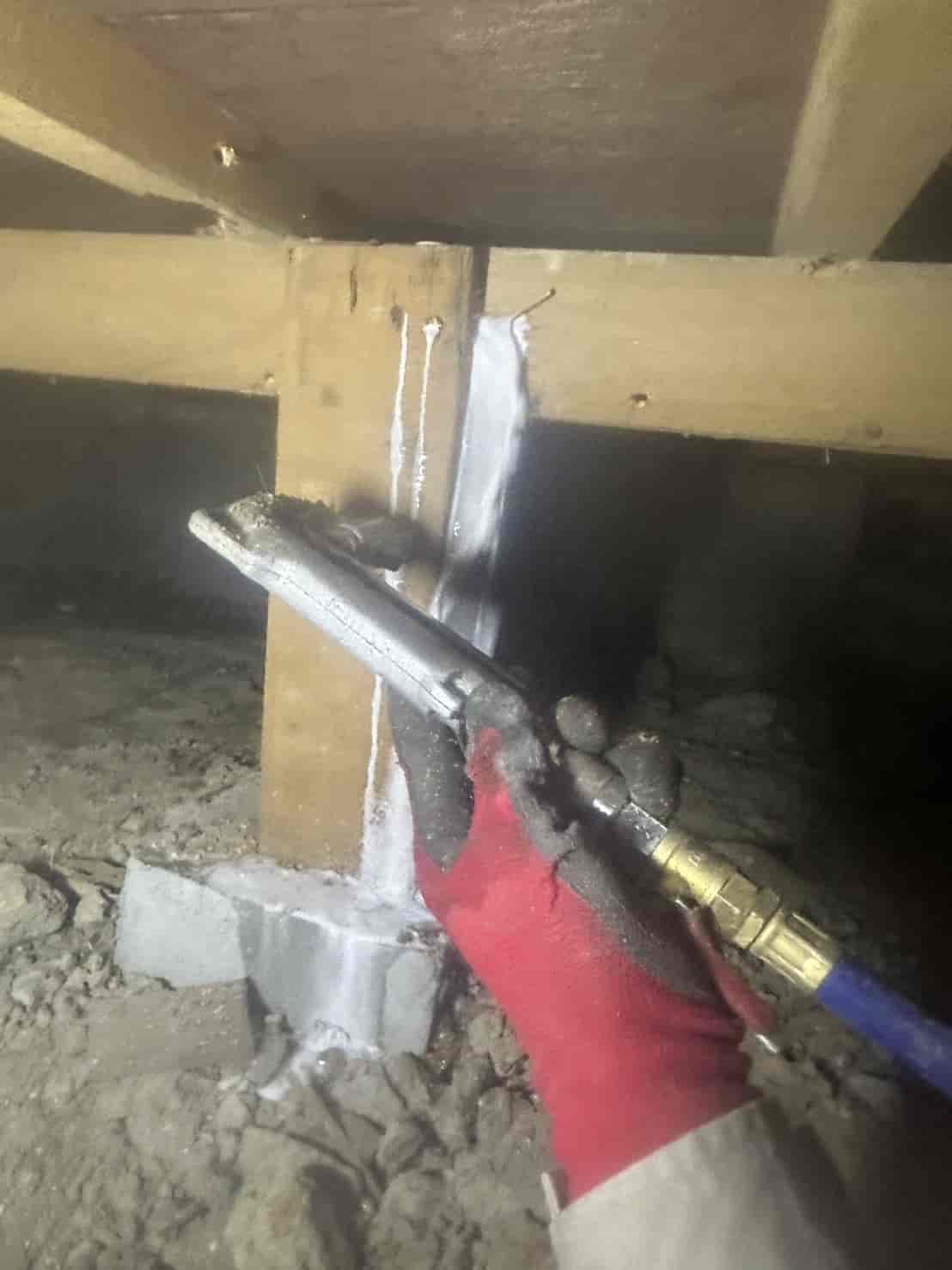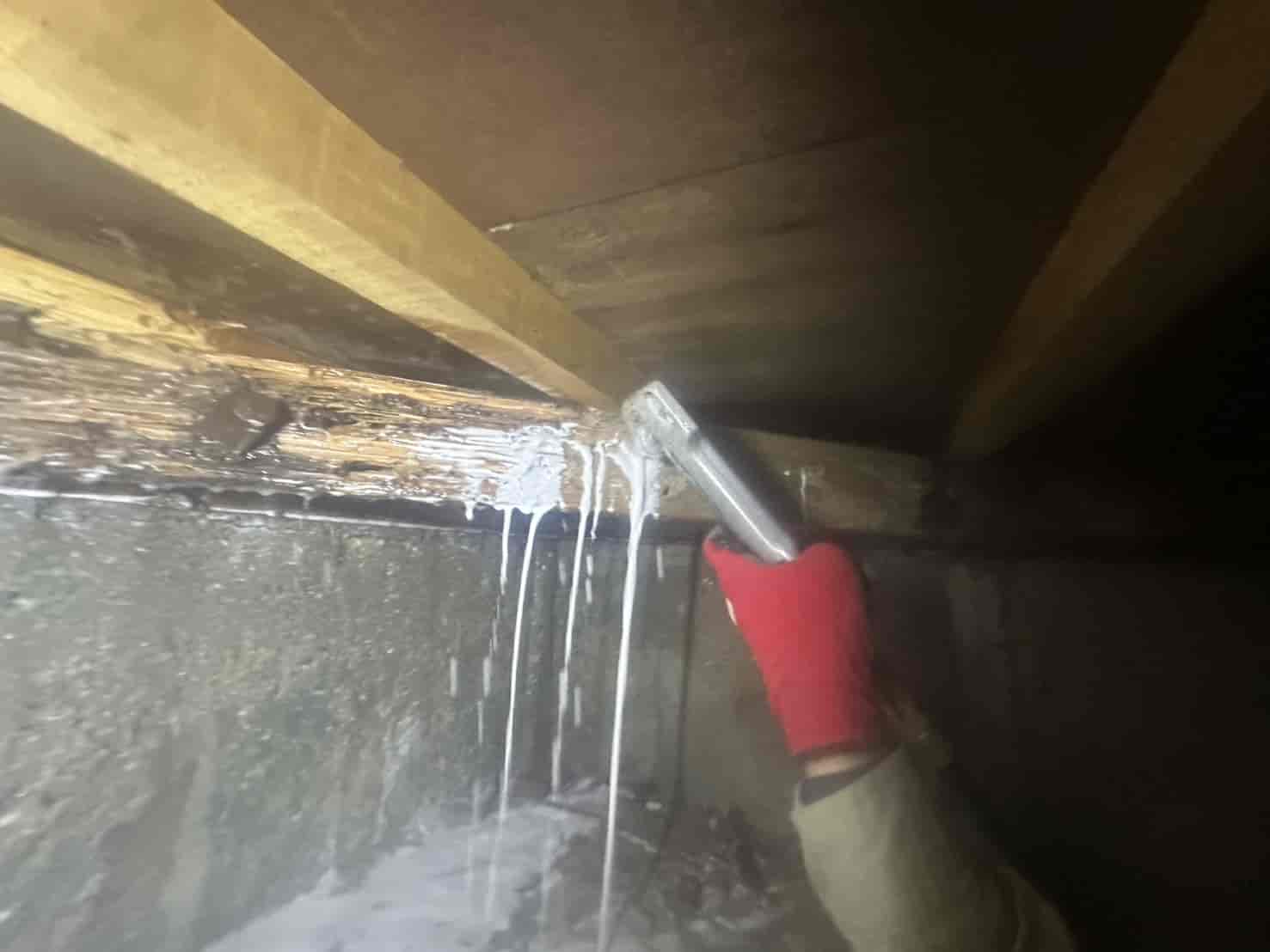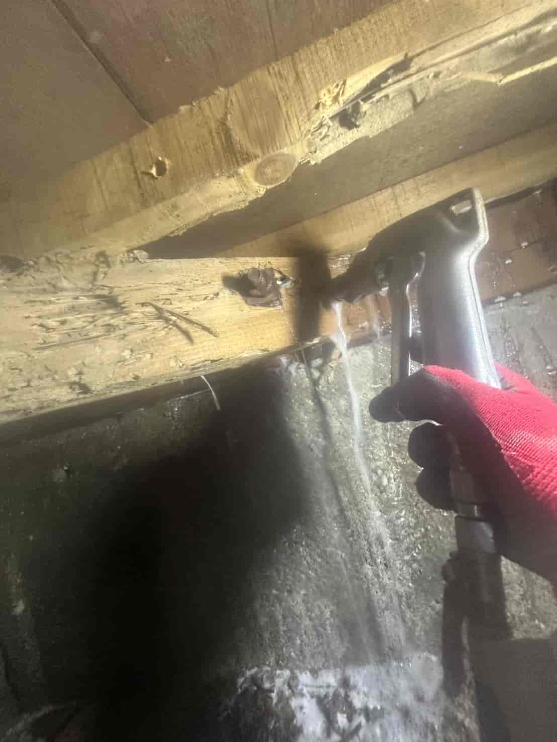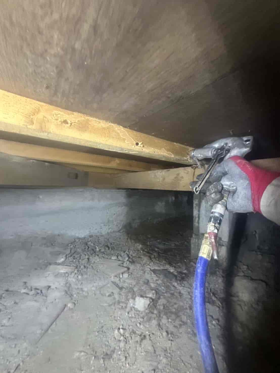 床下全域を満遍なく処理する標準プランとは違い、職人が直接入って作業できる範囲を中心に、薬剤処理を徹底しました。床下に入れる区画は限られていましたが、シロアリは構造材を経由して広がるため、入り込める箇所をしっかり処理するだけでも効果はあります。