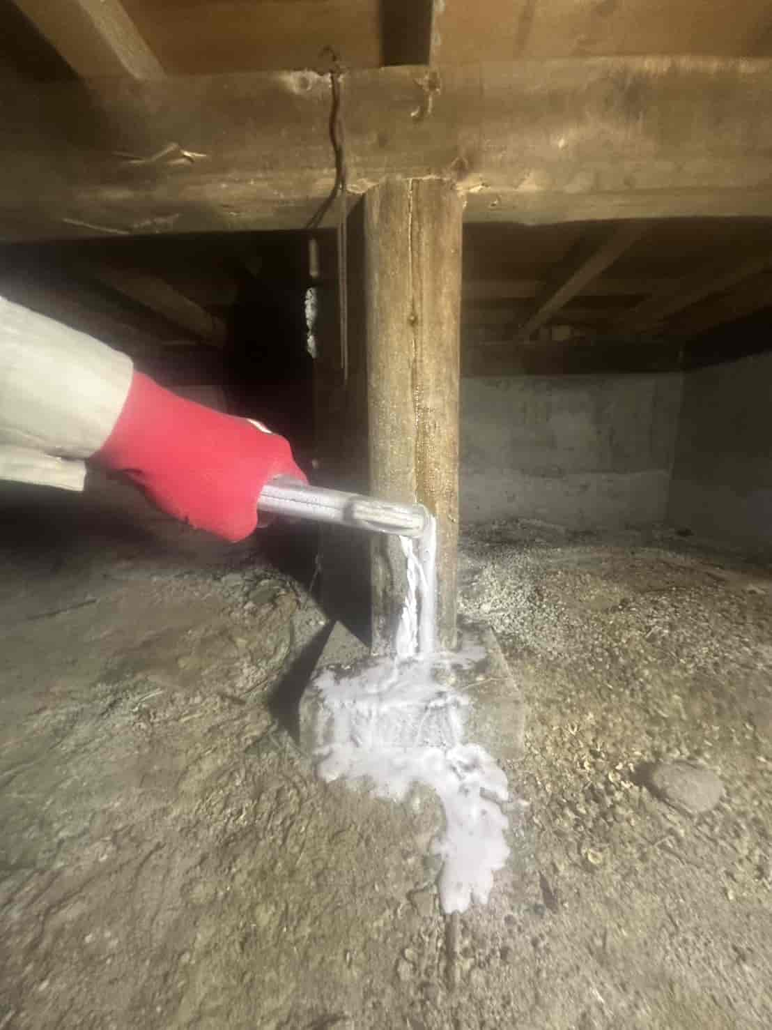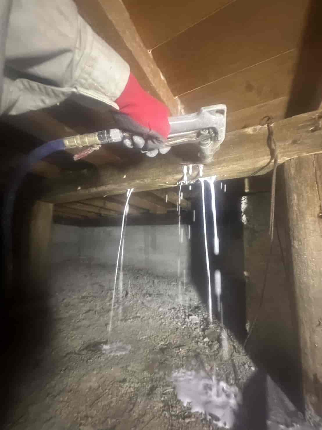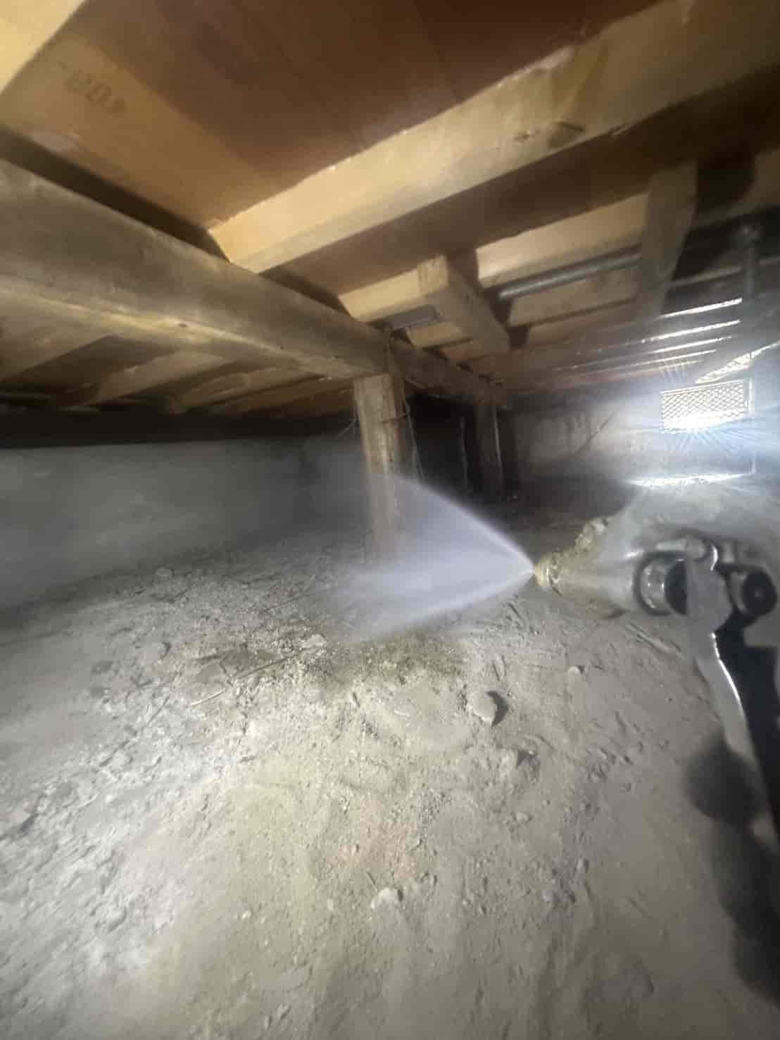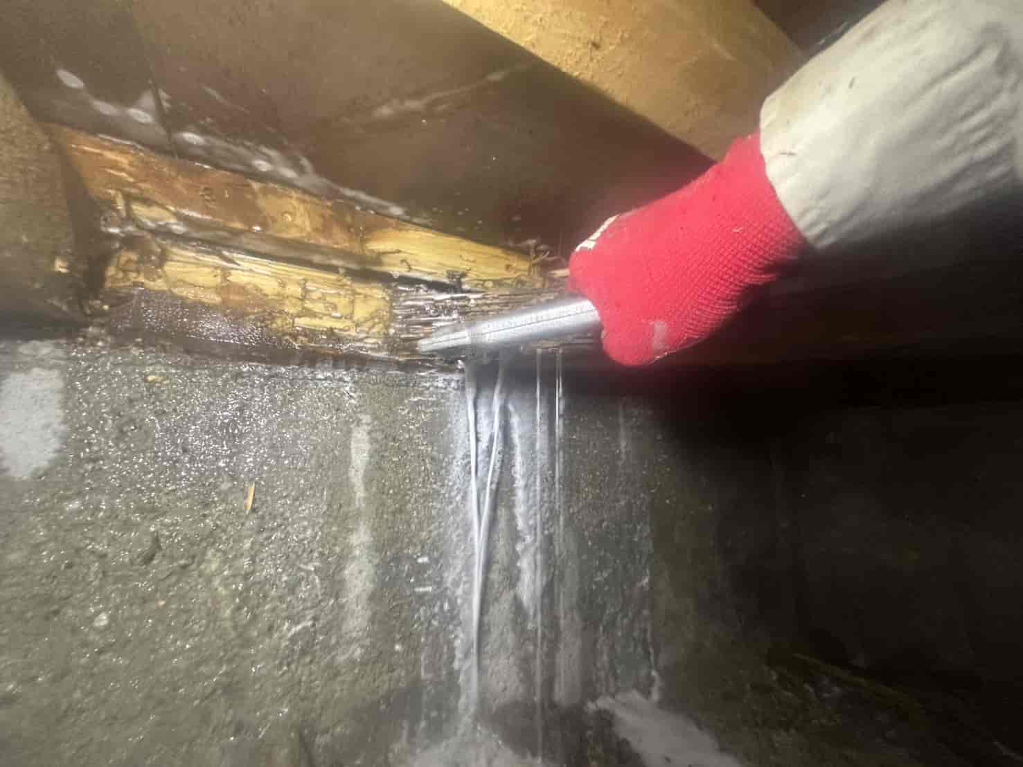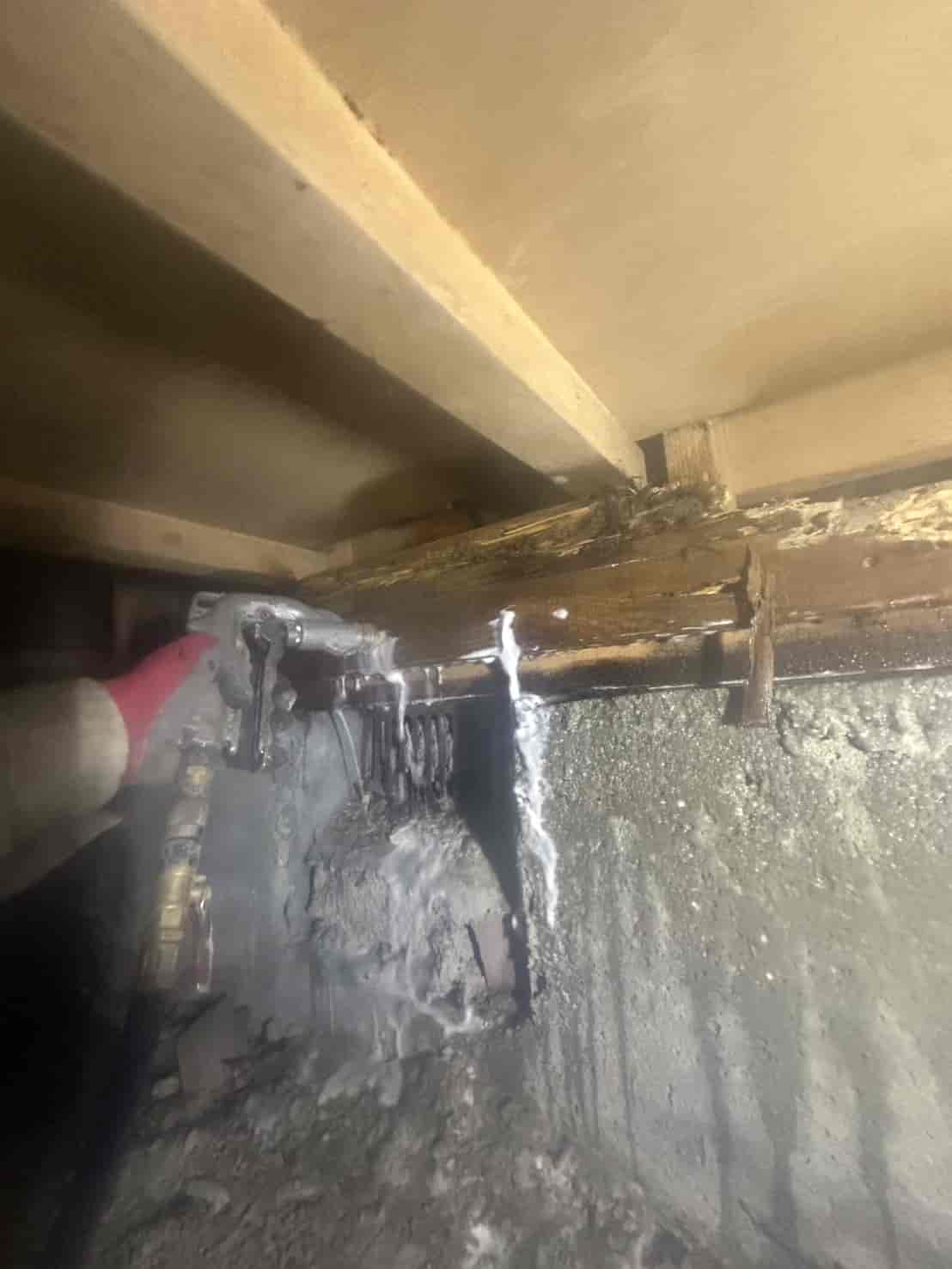 床下全域を満遍なく処理する標準プランとは違い、職人が直接入って作業できる範囲を中心に、薬剤処理を徹底しました。床下に入れる区画は限られていましたが、シロアリは構造材を経由して広がるため、入り込める箇所をしっかり処理するだけでも効果はあります。