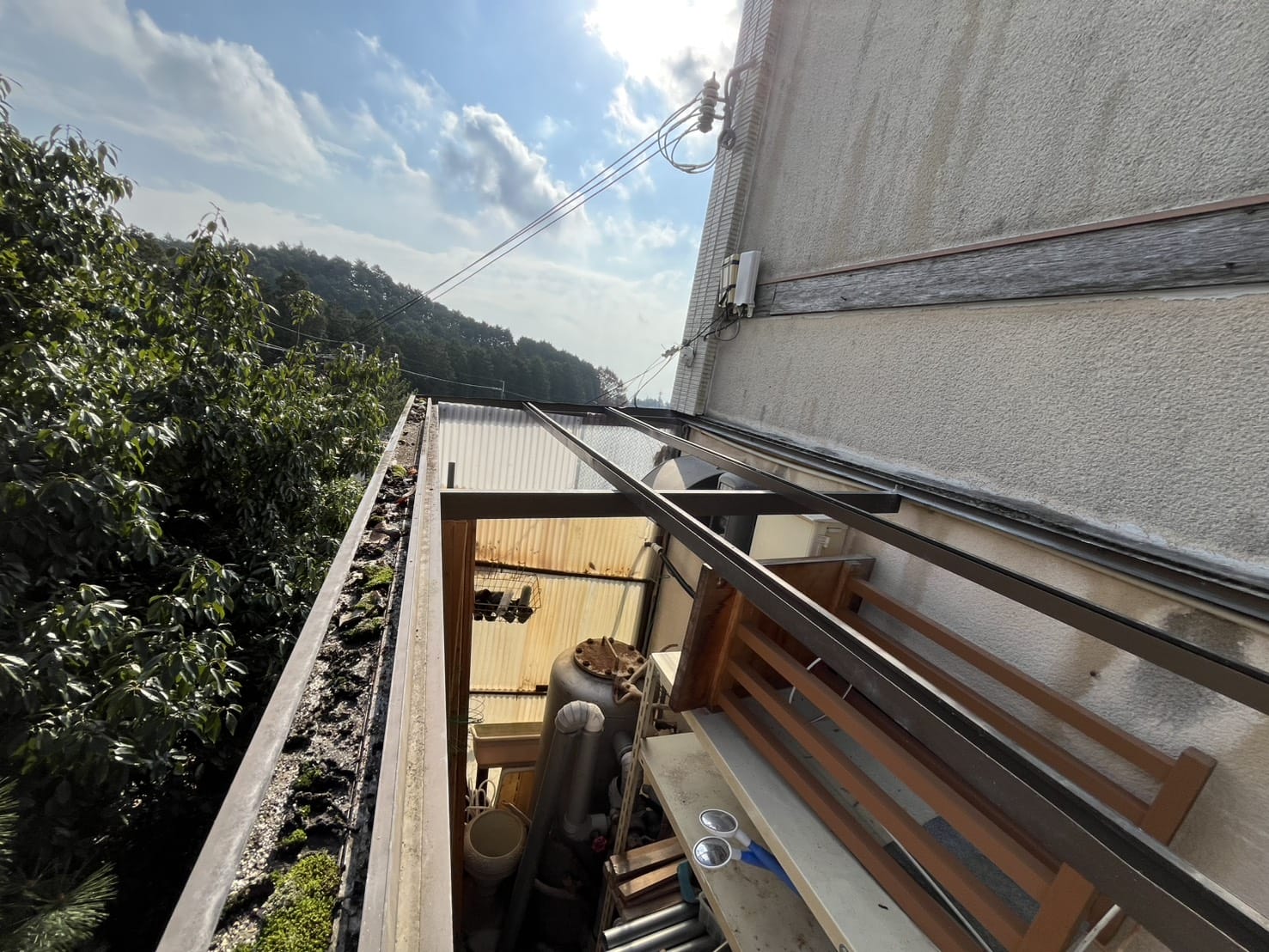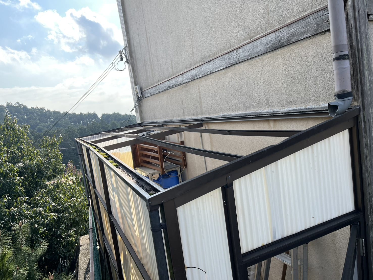 一部の飛散・欠落:特に風当たりの強い箇所では、波板がすでに飛んでしまい、下地がむき出しの状態。これでは雨を凌ぐどころか、中に保管しているものが水濡れする危険性が高まります。アルミ枠の損傷:最も深刻だったのは、波板を支えるアルミ製の骨組み(枠)までが強風の影響で大きく捻じ曲がっていた点です。