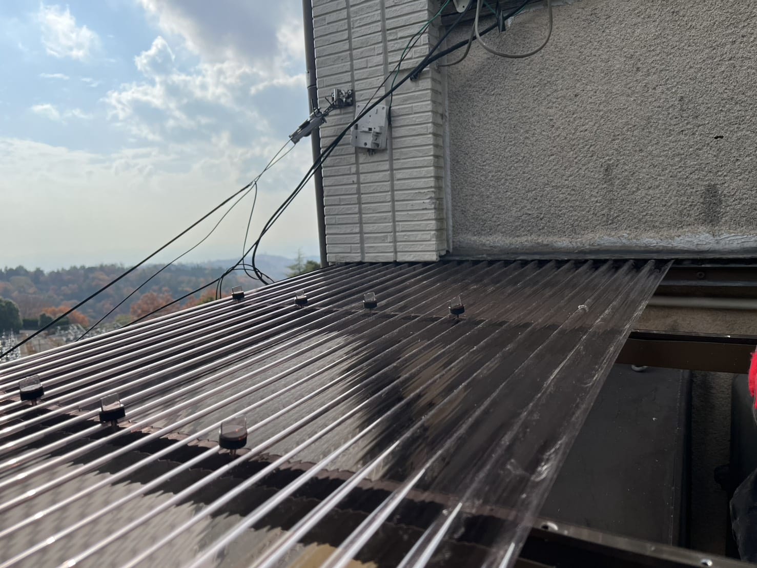 「アルミ枠の損傷はありますが、この枠を最大限に活かし、手作業で慎重に調整・補強することで、費用が高額になるアルミ枠の全交換を回避しませんか?破損がひどい波板のみを新しいものに張り替えることで、波板が飛散する心配もなくなり、雨もしっかり凌げるようになります。」