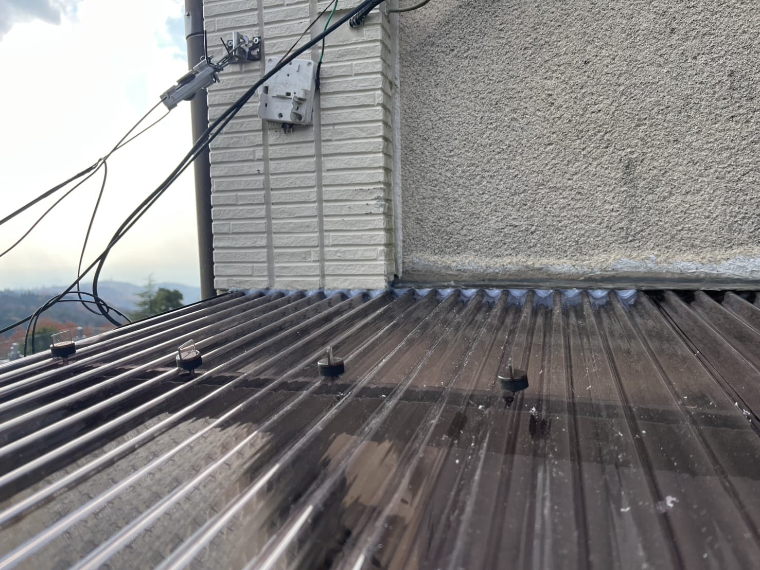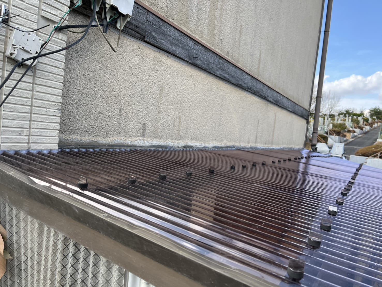 私たちはお客様から一本のお電話をいただき、すぐに現地調査へ向かいました。その時拝見した物置の波板は、お客様が心配されていた通り、想像以上に深刻な状態でした。波板自体の著しい劣化と破損:長年の紫外線や風雨で脆くなり、パリパリにひび割れたり、穴が開いたりしている箇所が散見されました。