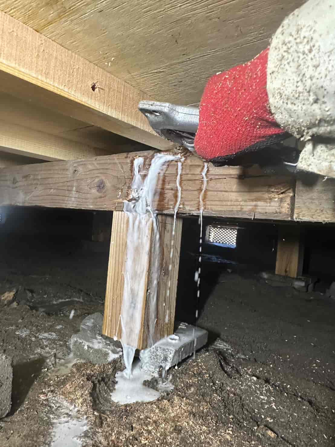 以前、シロアリ被害が見られた木製テラス柱。こうした場所は、一度駆除しても湿気や立地条件によって再び被害が出るリスクがあります。そのため今回は、念のため再発防止の薬剤処理を追加施工。木材の内部まで薬剤を行き渡らせることで、見た目は同じでも「中身の安全性」がまったく違います。
