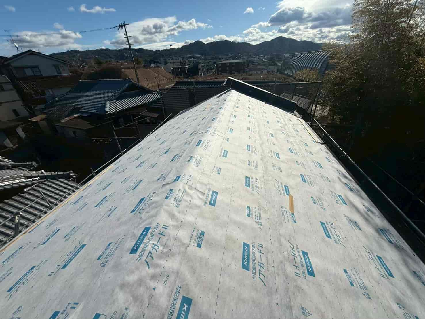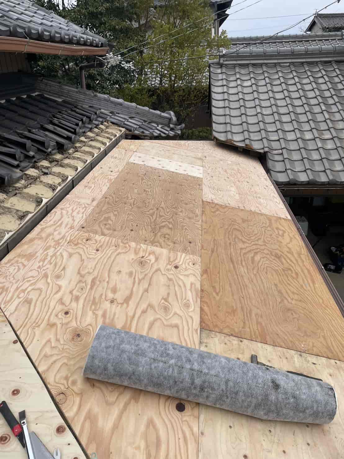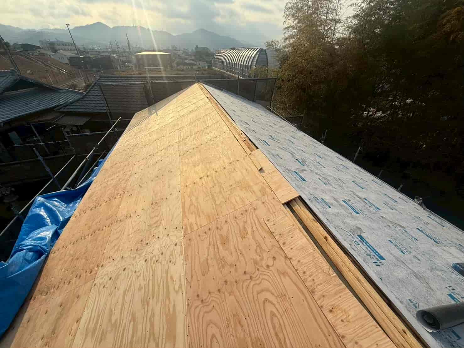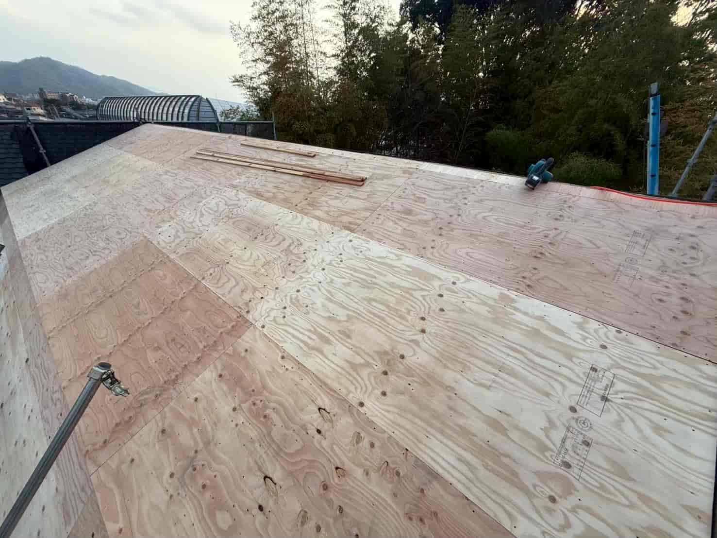 野地板の状態を整えた後、新たに構造用合板を使用して下地の強度を確保。その上からルーフィング(防水シート)を全面に施工し、防水性能を大幅に向上させています。