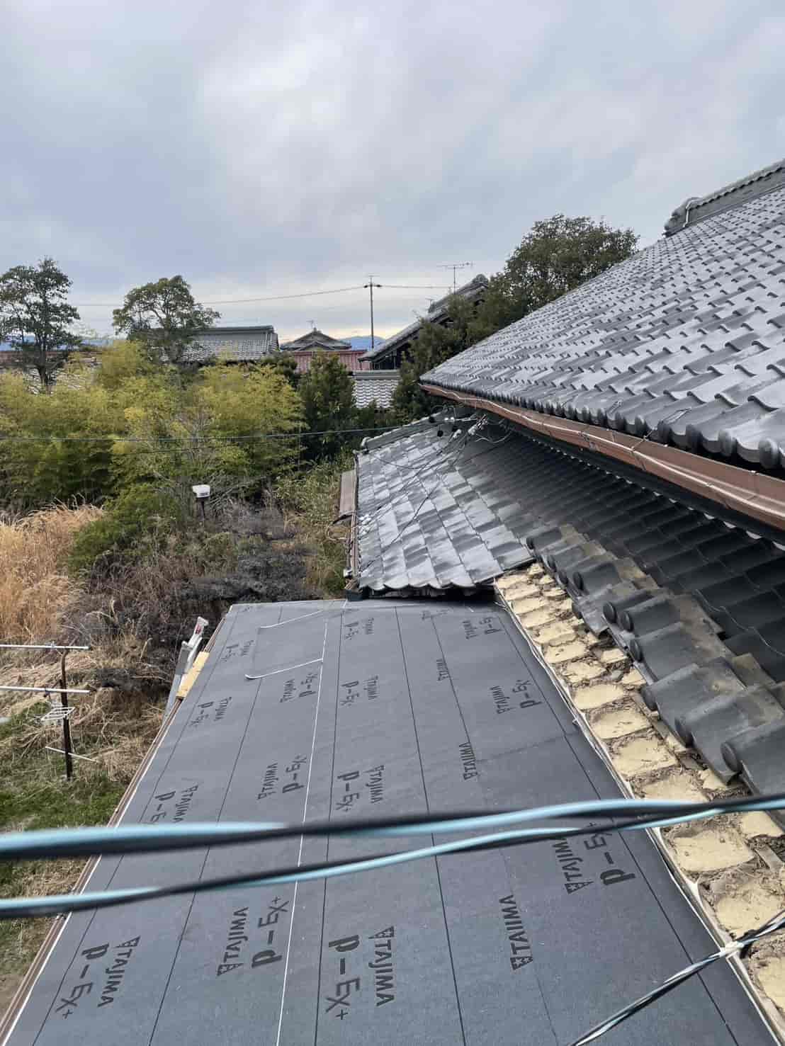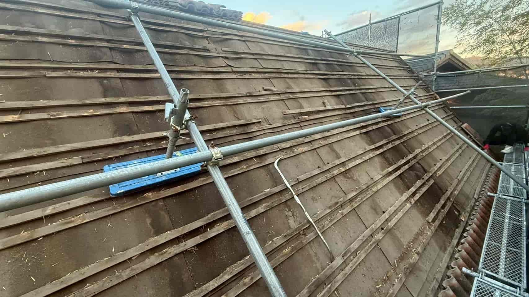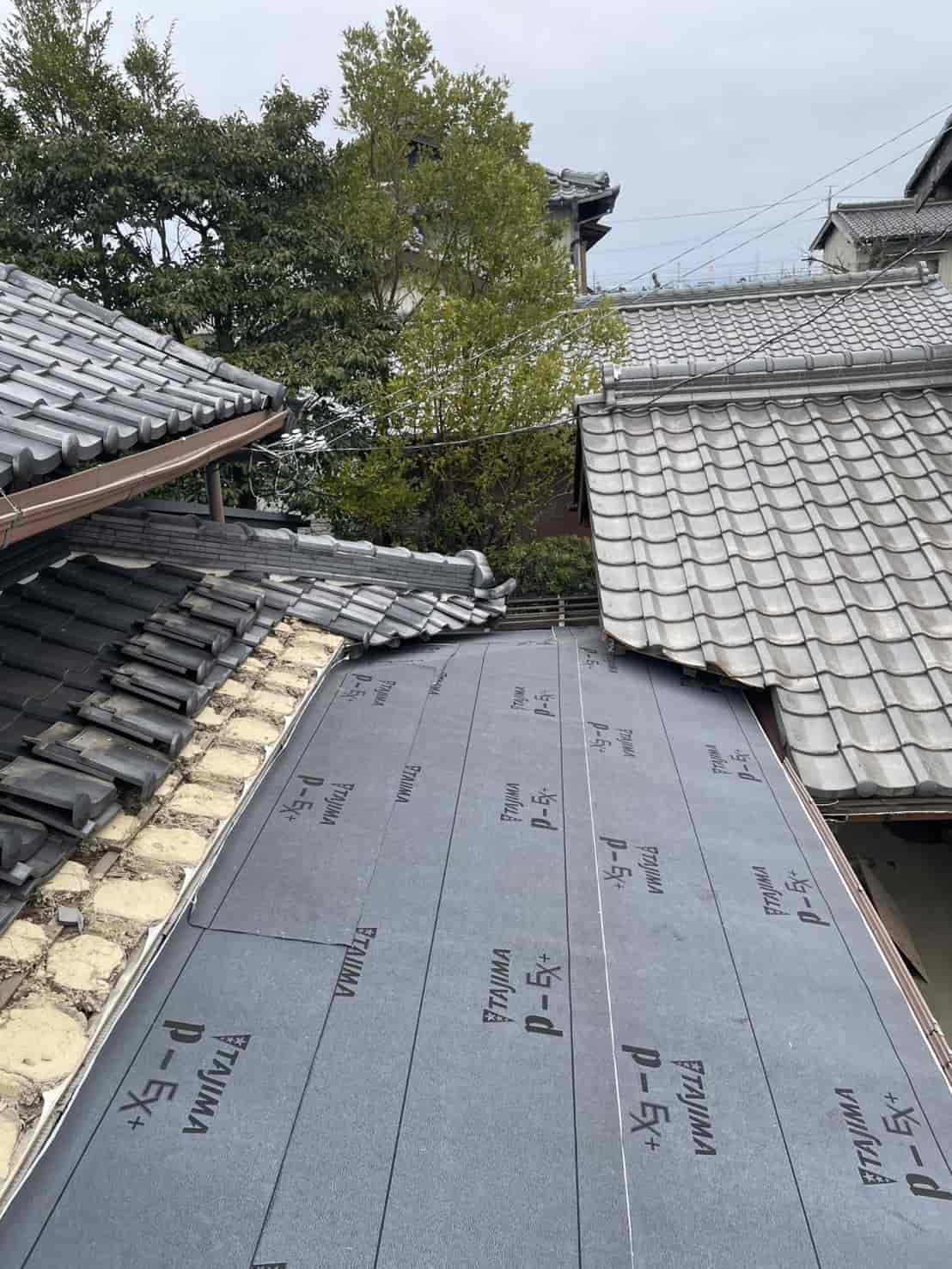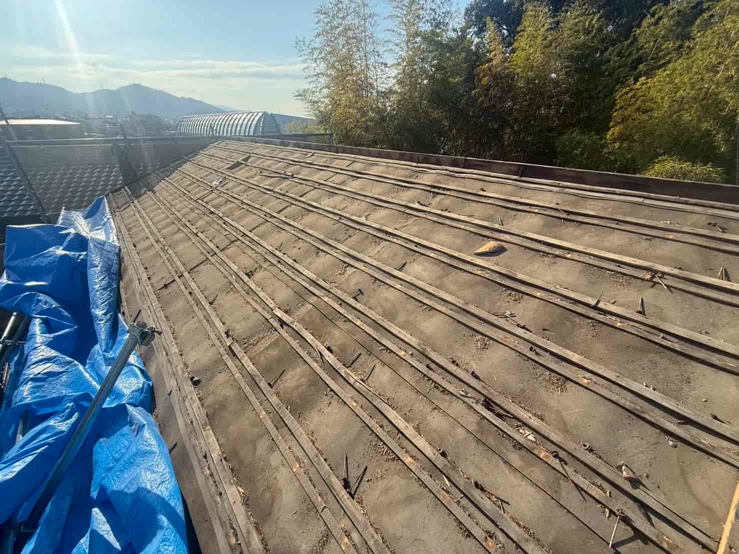まず、既存のセメント瓦をすべて撤去し、下地の状態を確認しました。瓦撤去後には、長年の雨水侵入による下地の劣化が確認され、部分的に補修を行っています。