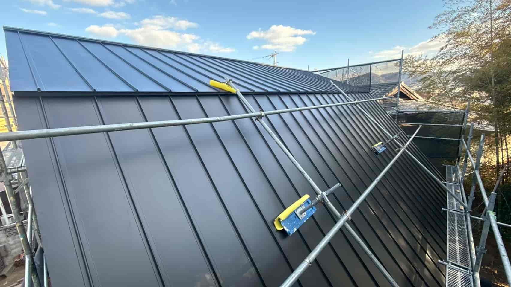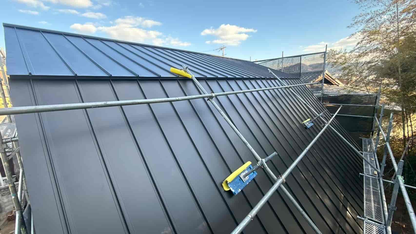 新たに採用した立平屋根は、金属屋根の一種であり、継ぎ目が少なく、雨水の侵入リスクを大幅に低減できる構造です。特に今回のような腰折れ屋根との相性が良く、段差部分でも雨仕舞いを確実に行うことが可能です。