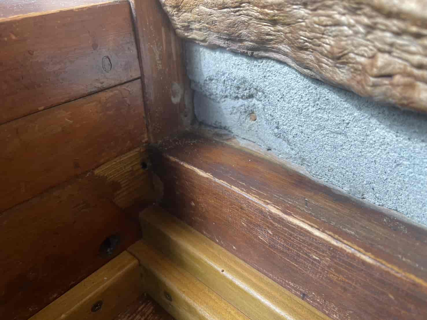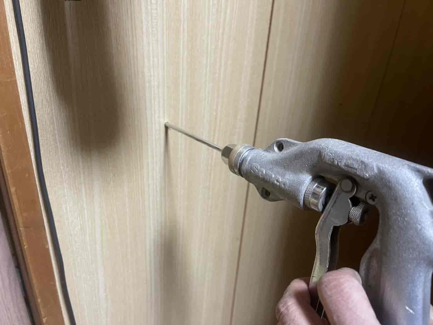 蟻道周辺の木部を詳細に点検すると、表面上は大きな破損が見られない部分でも内部が空洞化している箇所が複数確認され、被害は見えない部分で確実に進行していました。特に壁内部へ侵入している経路が確認されたため、構造材を守る目的で壁内部への薬剤処理が必須と判断しました。