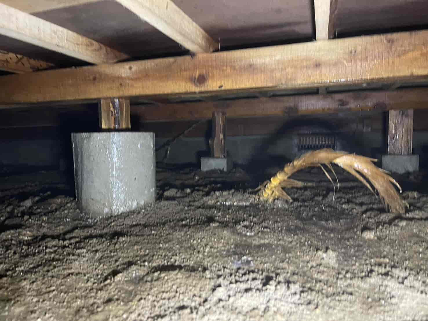 被害の進行状況を正確に把握するため床下点検を実施したところ、基礎立ち上がり部分から木部へ伸びる明確な蟻道を確認。床下湿度もやや高く、白蟻が生息しやすい環境が形成されていました。
