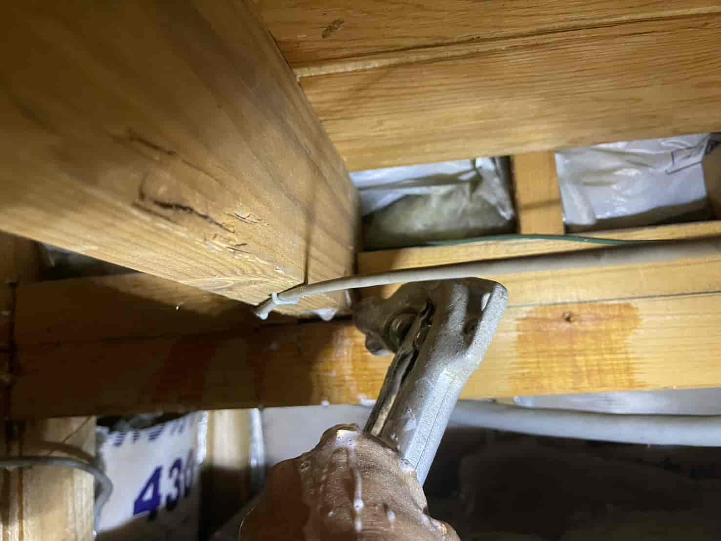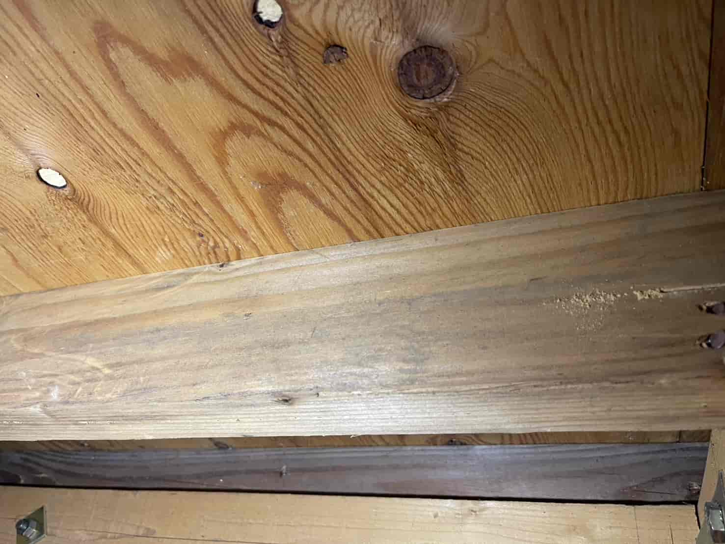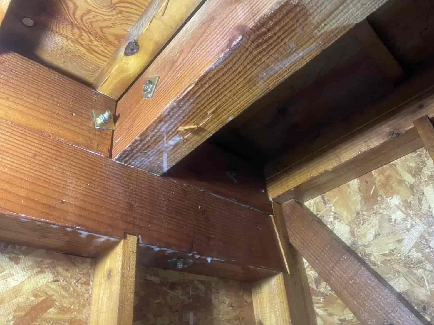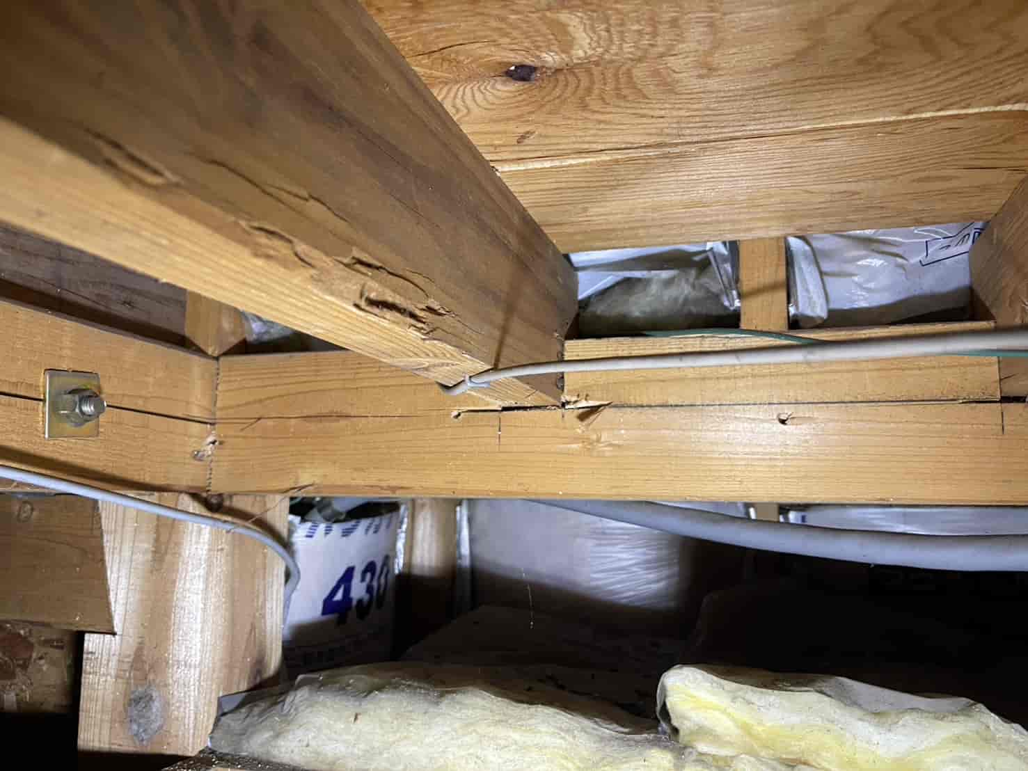 まずは詳細な点検を行うため、中天井に点検口を新たに設置しました。既存住宅では点検口がないケースも多く、限られた隙間からの調査では十分な確認ができません。そのため安全な位置に開口し、床下全体の状況を把握。被害箇所として、大引き・根太の内部に蟻道状の穴や木粉の排出跡を確認しました。木材の内部が空洞化しており、叩くと軽い音がする部分もありました。
