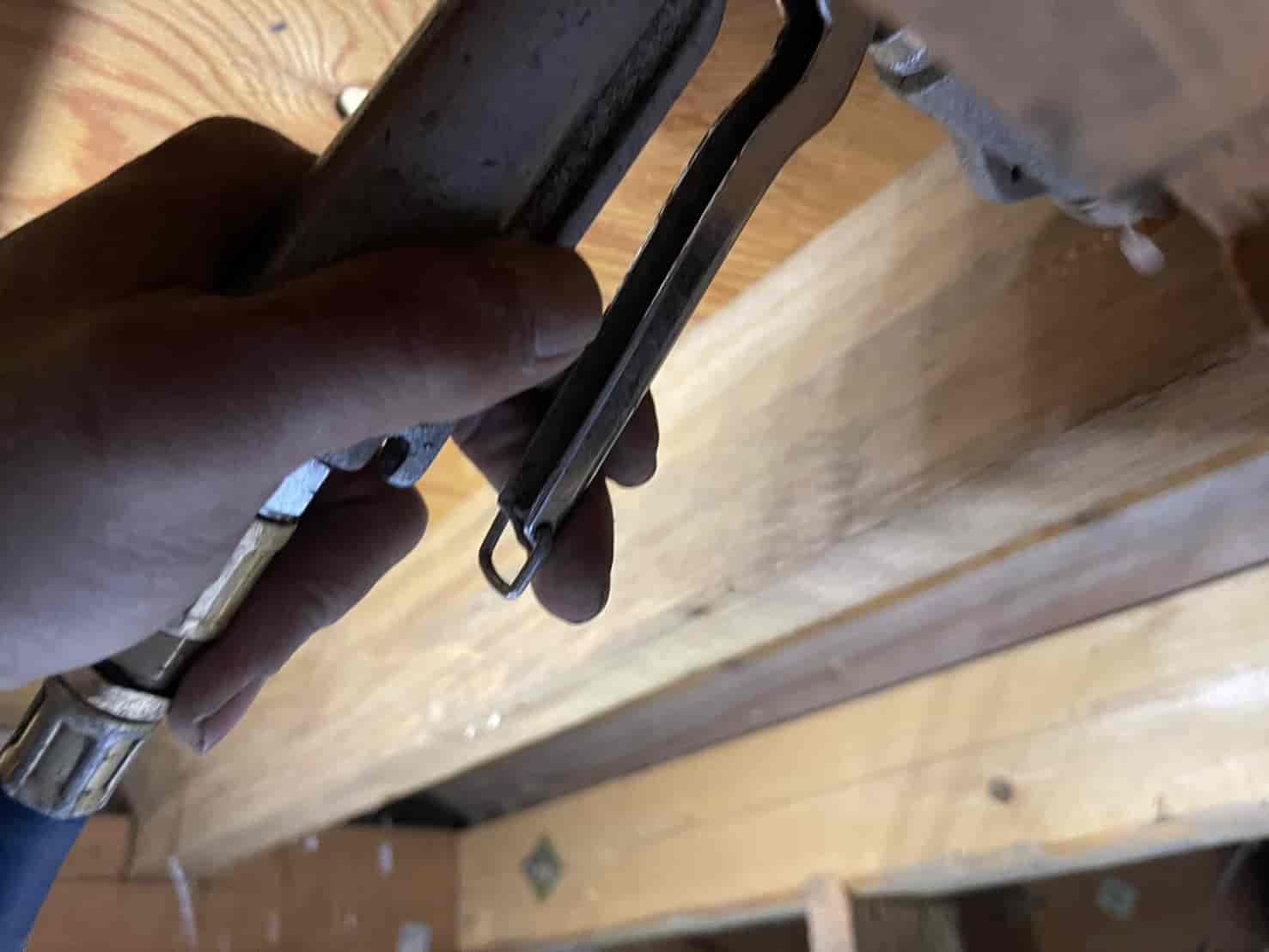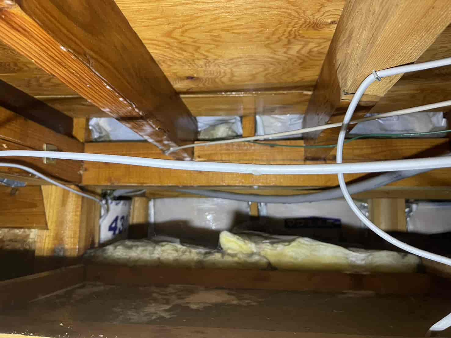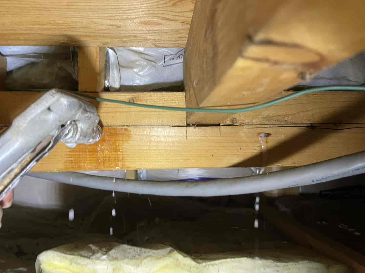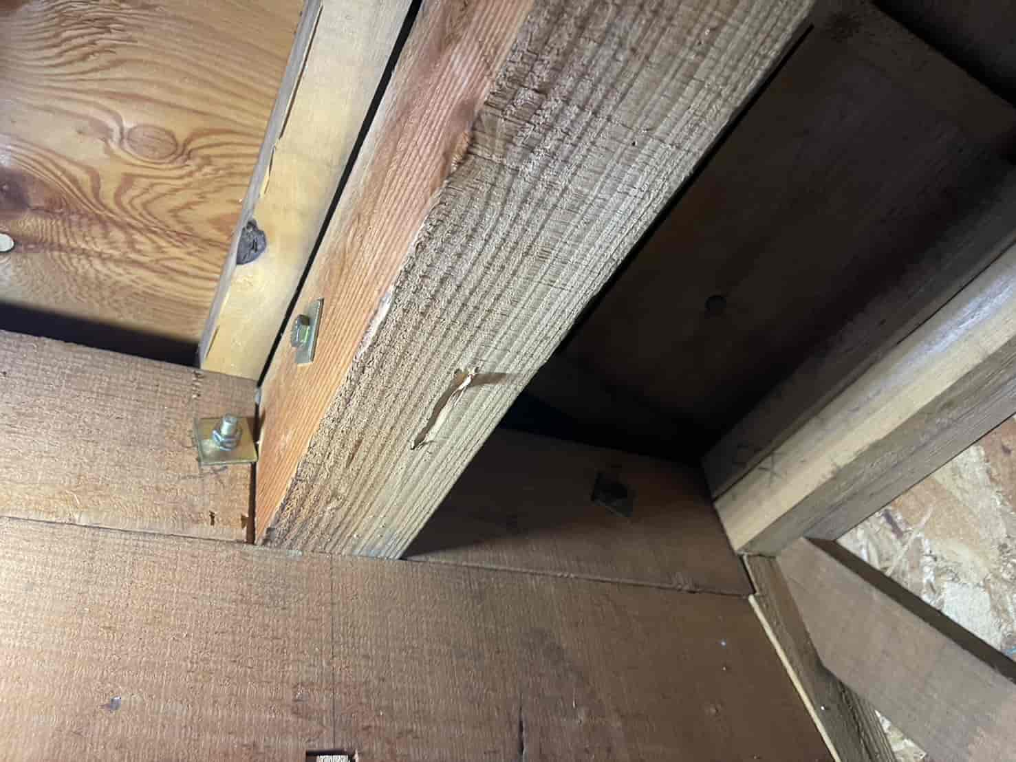 まずは詳細な点検を行うため、中天井に点検口を新たに設置しました。既存住宅では点検口がないケースも多く、限られた隙間からの調査では十分な確認ができません。そのため安全な位置に開口し、床下全体の状況を把握。被害箇所として、大引き・根太の内部に蟻道状の穴や木粉の排出跡を確認しました。木材の内部が空洞化しており、叩くと軽い音がする部分もありました。