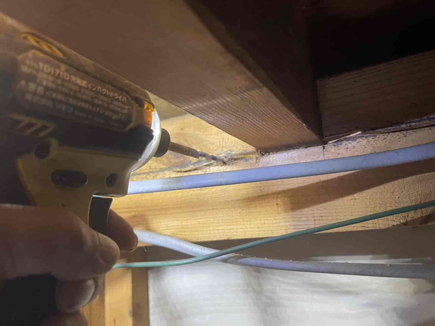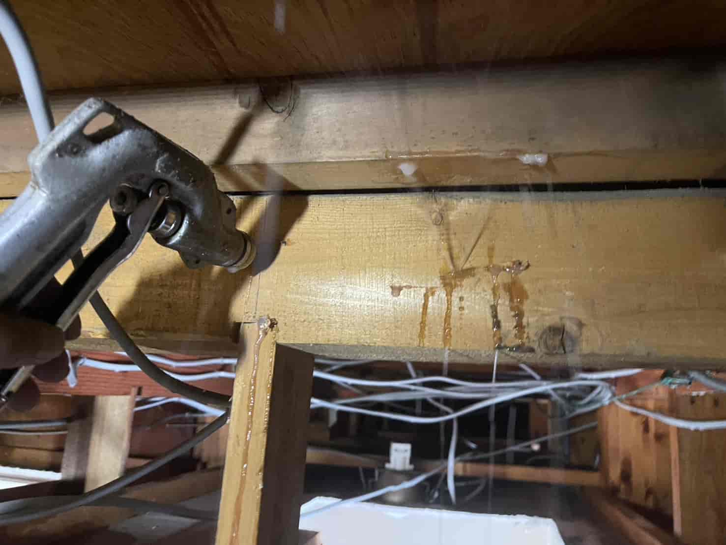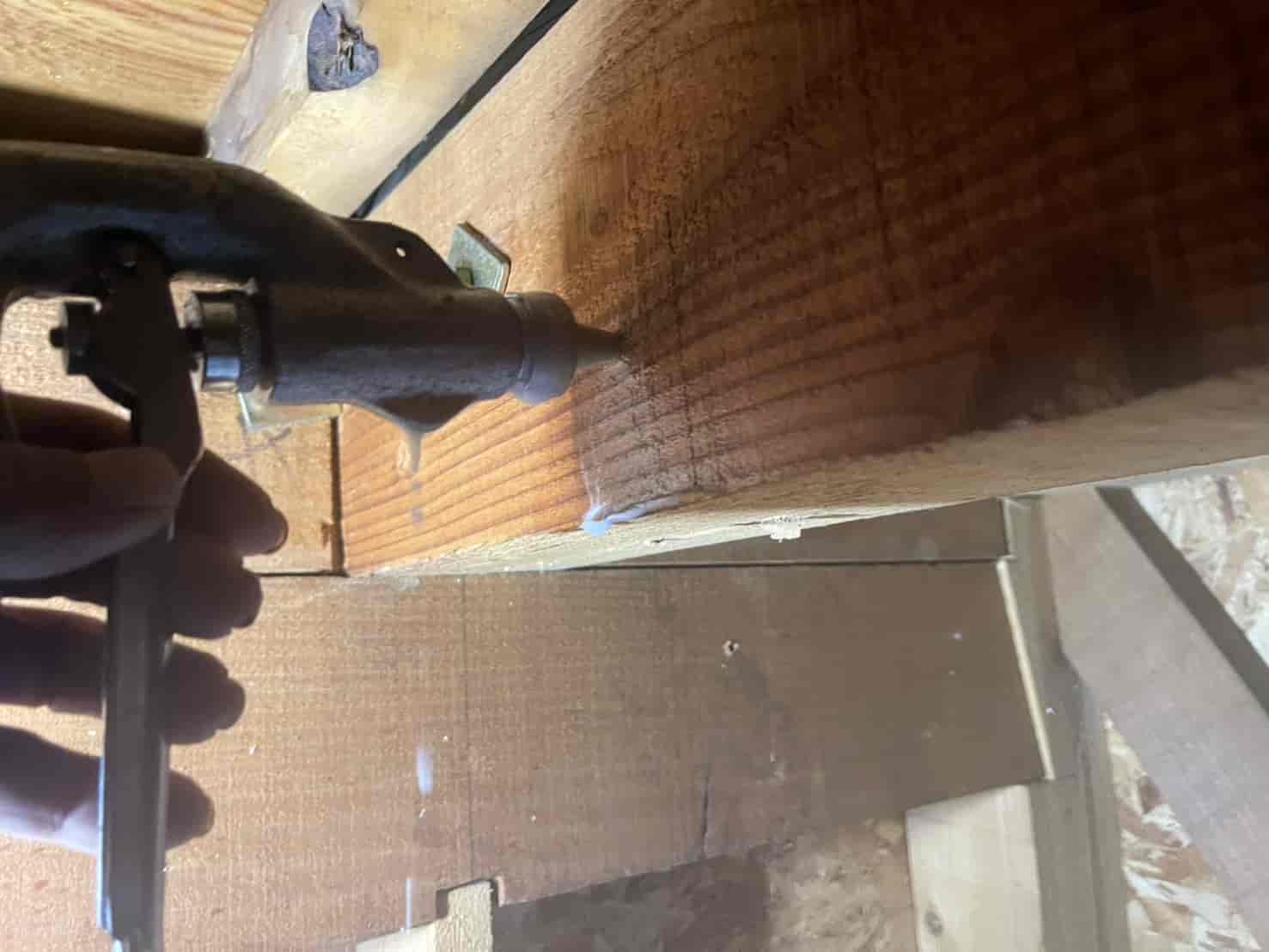 被害箇所が特定できたため、大引きに穿孔注入処理を行いました。乾材シロアリは木材内部に巣を形成しているため、表面処理では効果がありません。そこで、専用ドリルで数ミリ単位の小孔を開け、木材内部へ薬剤を直接注入。薬剤には持続性の高い有機リン系薬剤を使用し、巣全体に薬剤が行き渡るよう慎重に圧入しました。注入後は木栓で孔を丁寧に塞ぎ、見た目を損なわないよう仕上げます。