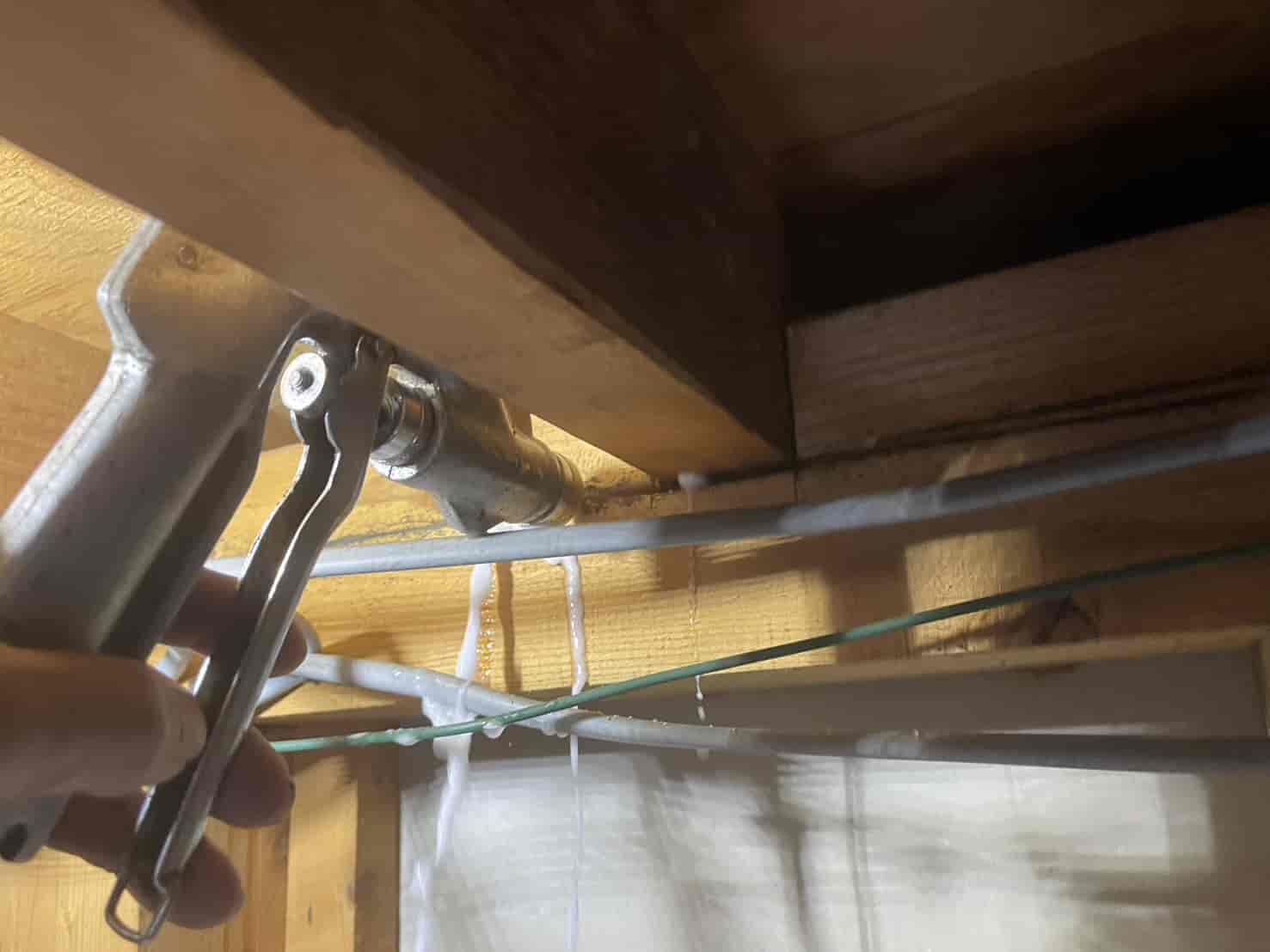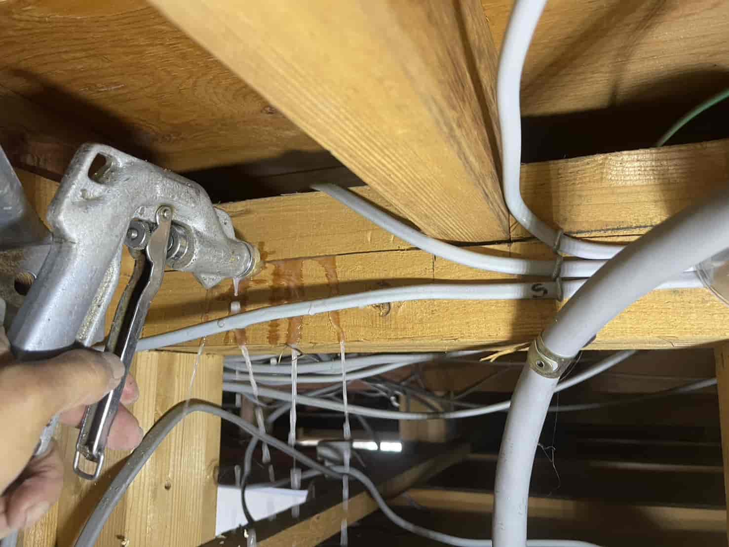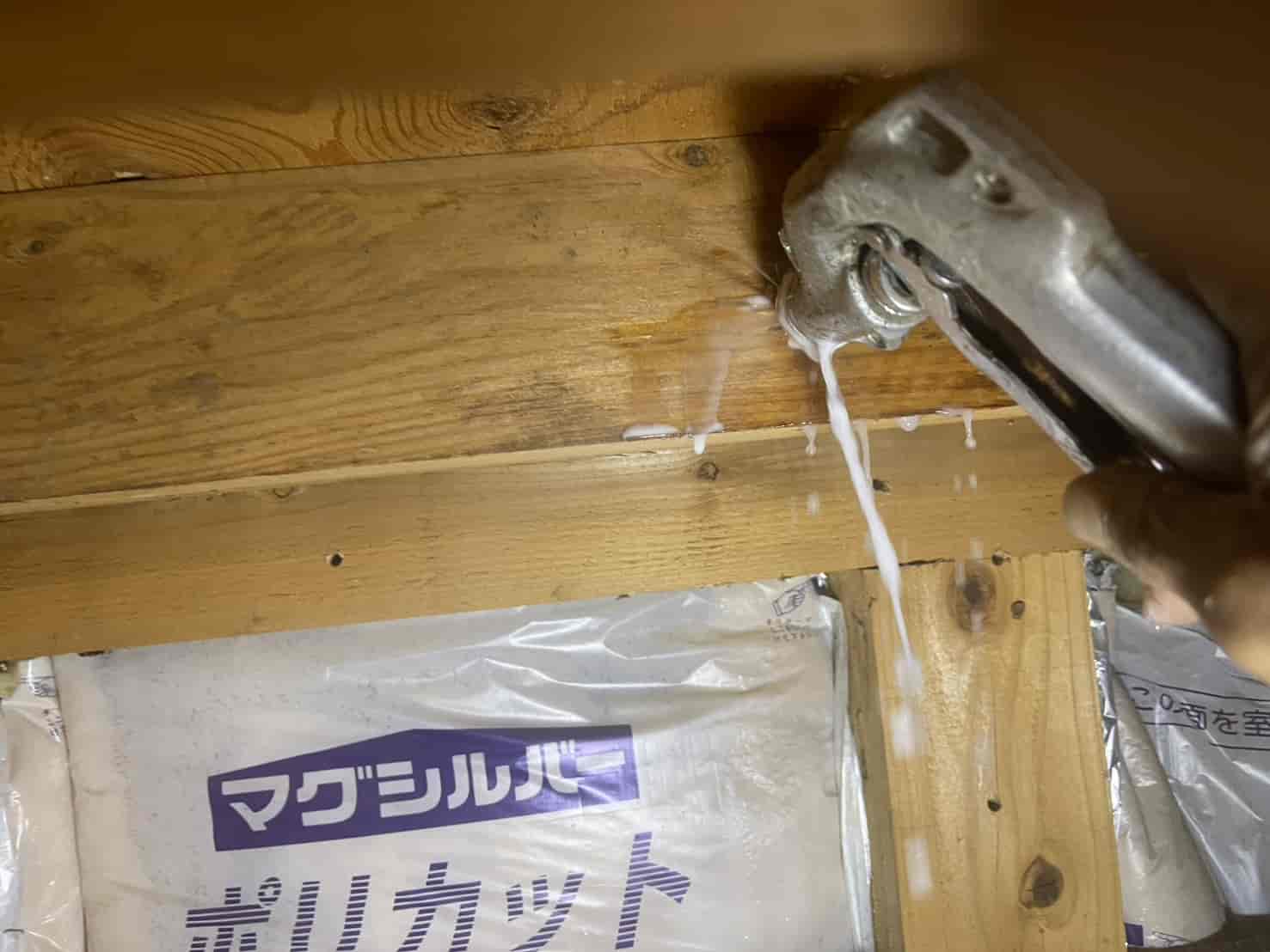 壁内部は空間が狭く、薬剤の拡散が偏りやすいため、特殊ノズルを使用し、霧状に噴霧して木材内部まで確実に届くよう施工しています。