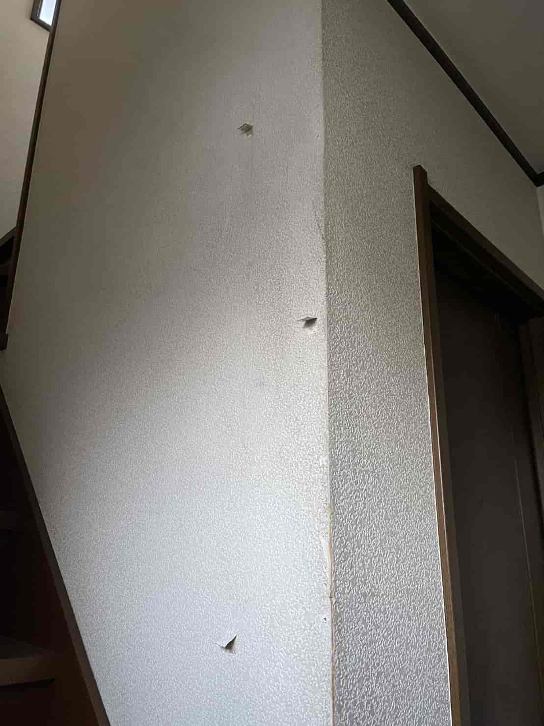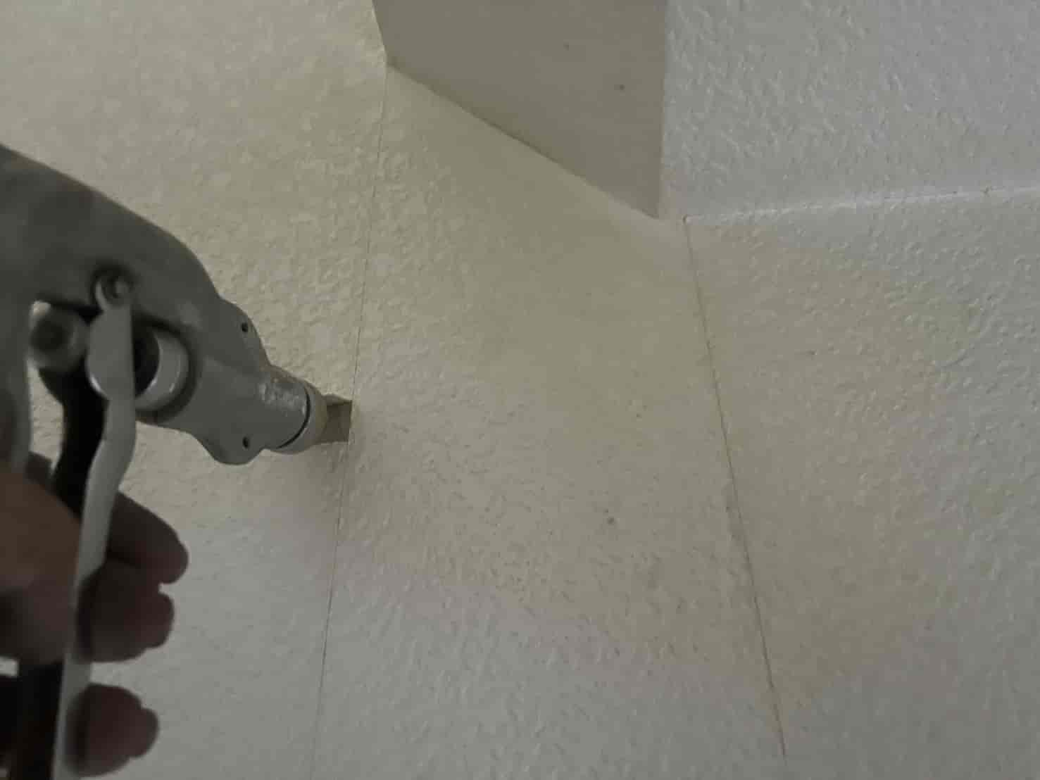 また、壁内にも乾材シロアリの糞や食害跡が確認されたため、壁面にもピンポイントで穿孔注入処理を実施しました。外壁からの施工が難しい箇所では、室内側の巾木付近に小さな孔を開け、壁内へ薬剤を注入。乾材シロアリは壁内部の木下地にも被害を及ぼすため、構造を傷めない範囲で複数箇所に処理を行いました。