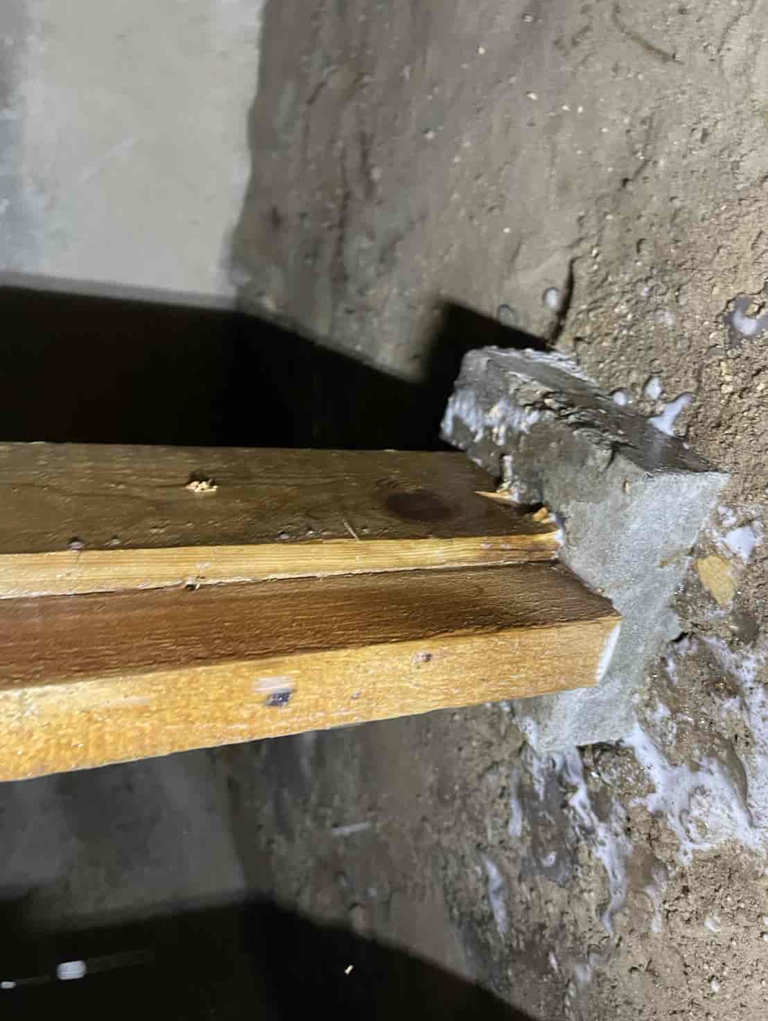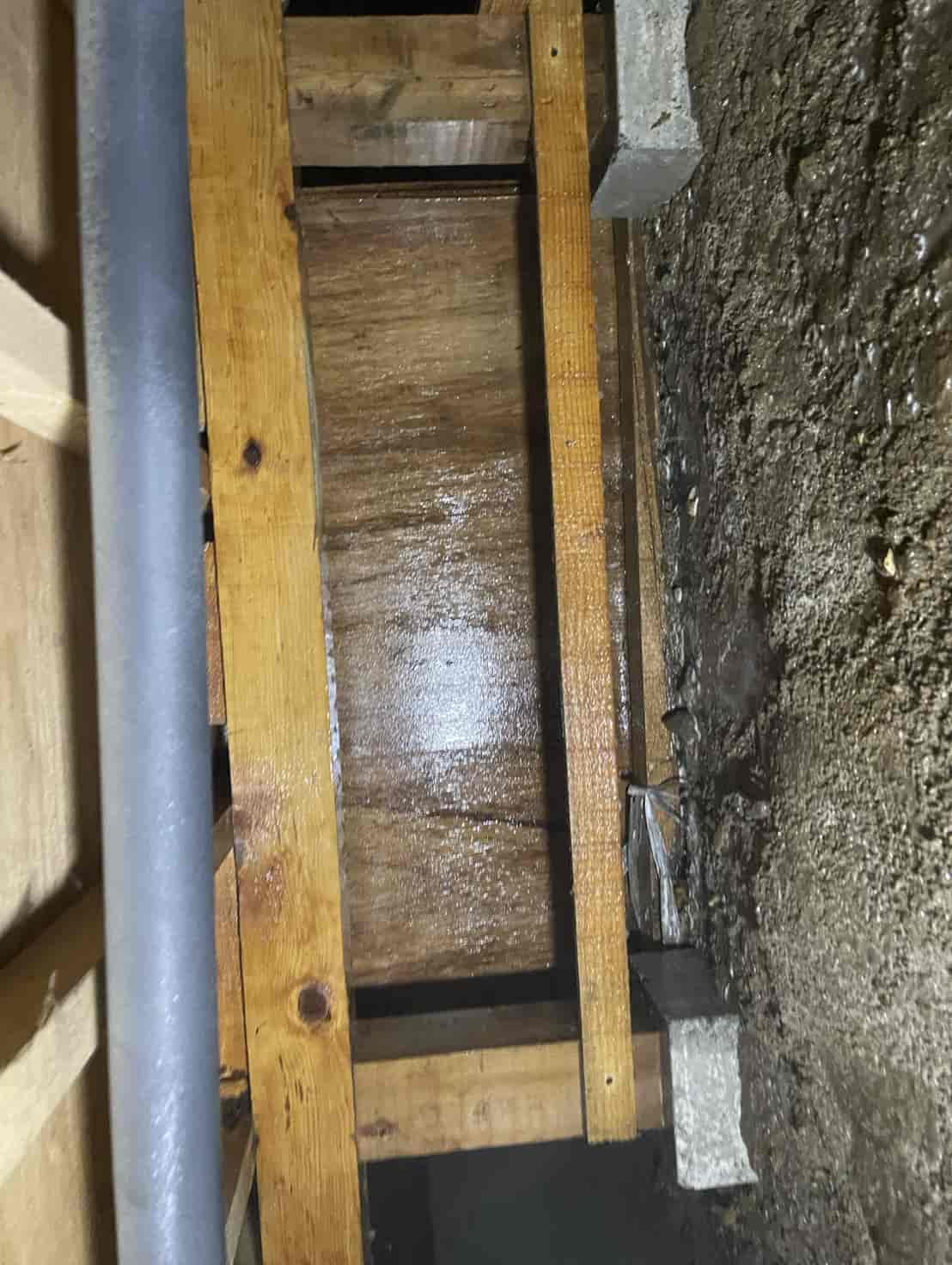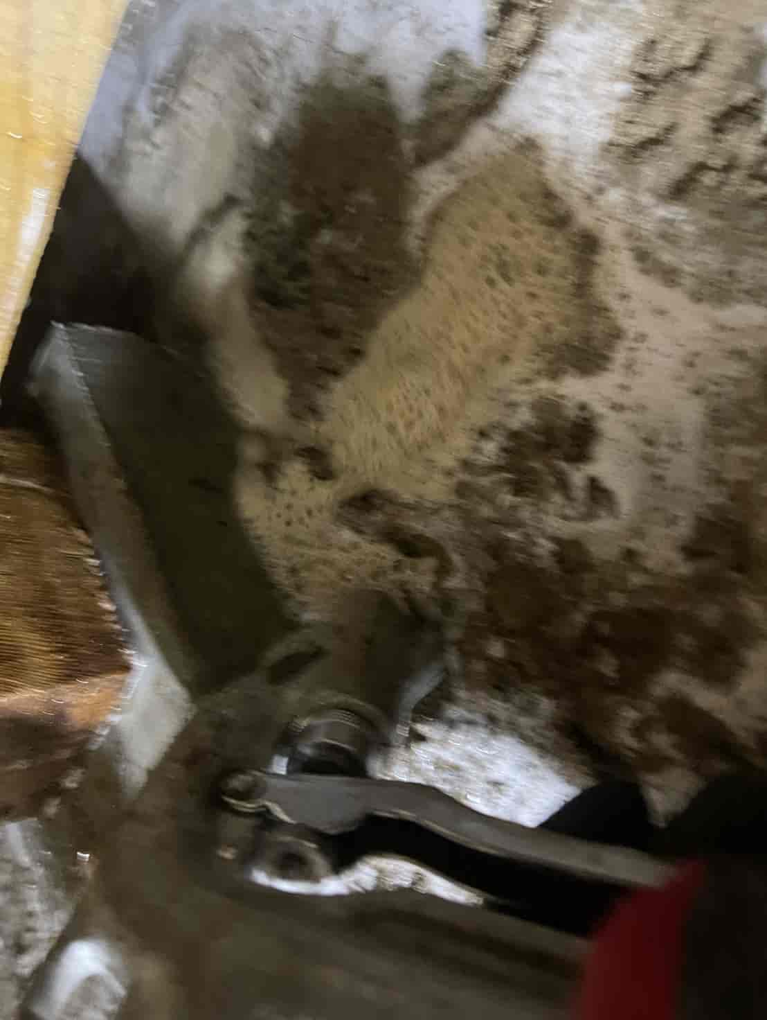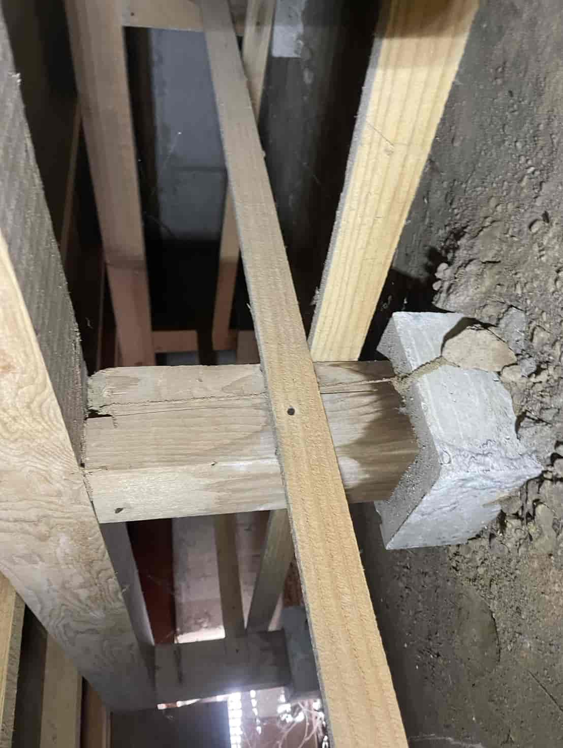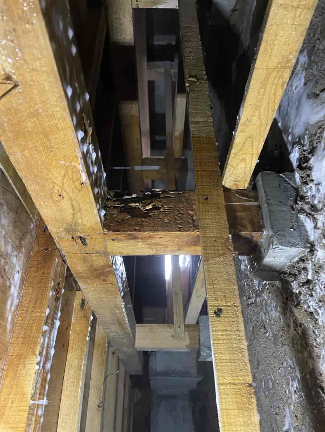 押し入れ内部を確認したところ、段ボールが指で触れただけで崩れるほど脆くなっており、内部には白蟻の生体が複数確認されました。被害が押し入れ周辺のみに留まっているのか、構造材へ広がっているのかを判断するため、床下に潜って詳細な調査を実施しました。床下点検では、押し入れ直下の土台周辺に複数の蟻道(白蟻が通るためのトンネル状の通路)が形成されており、さらに周辺の根太部分にも白蟻の移動痕跡が見られました。押し入れ内部の被害は段ボールの食害が顕著でしたが、白蟻は必ず周囲の木材にも食害を広げるため、早期の駆除が不可欠な状態でした。また、玄関周辺の基礎コンクリートにも一部土の付着が見られ、侵入経路になっている可能性があったため、こちらも重点的に確認を行いました。
