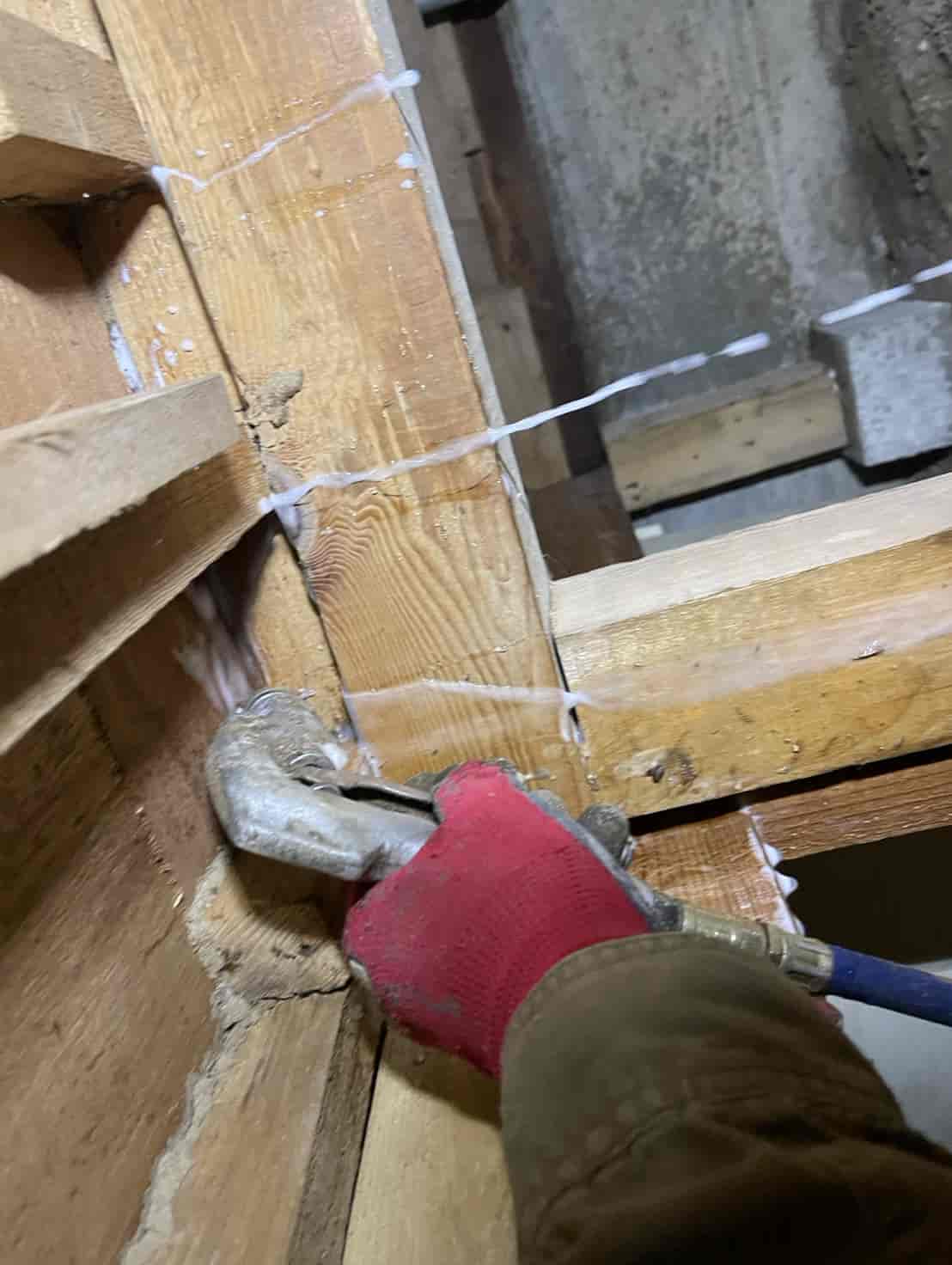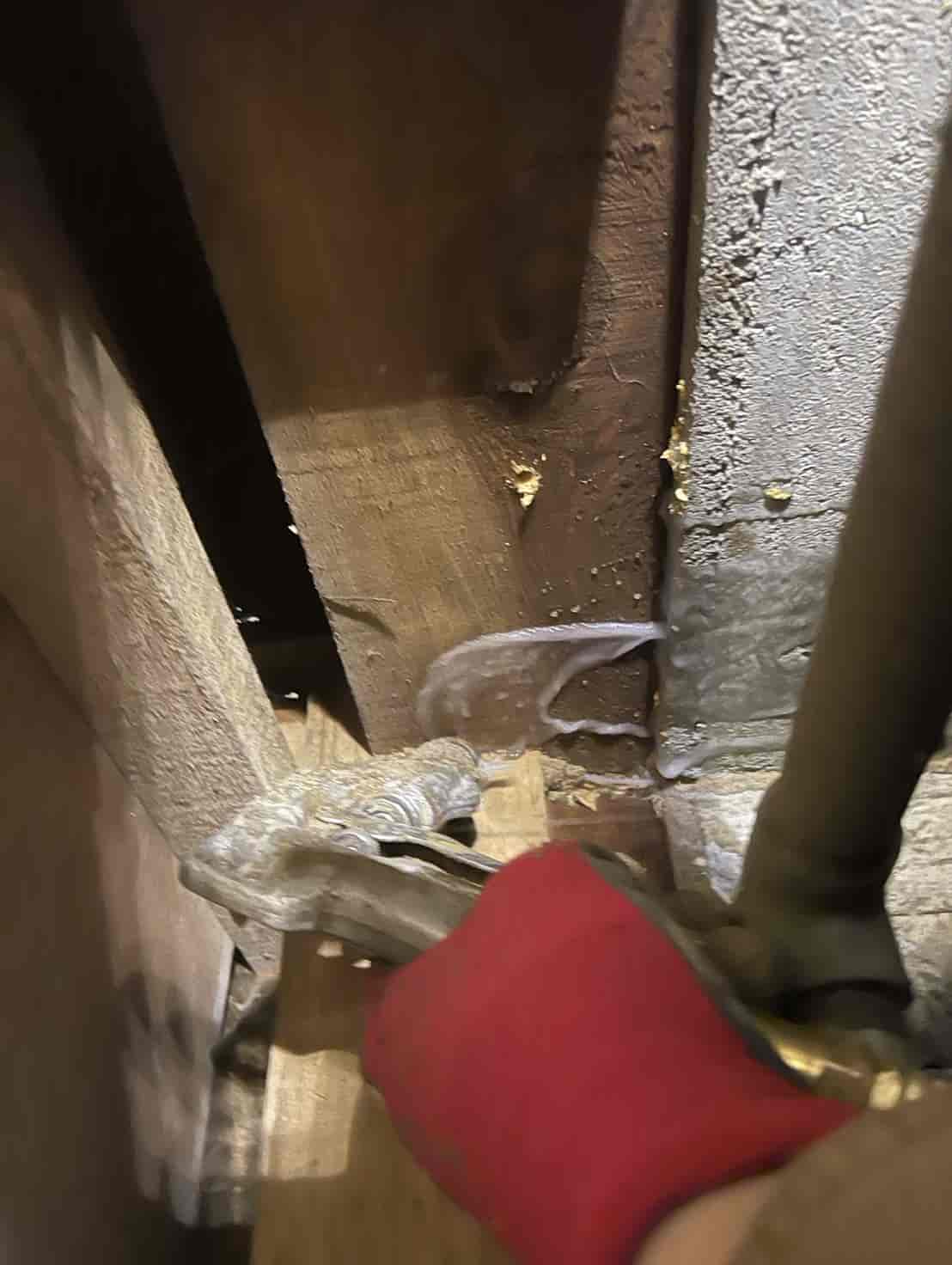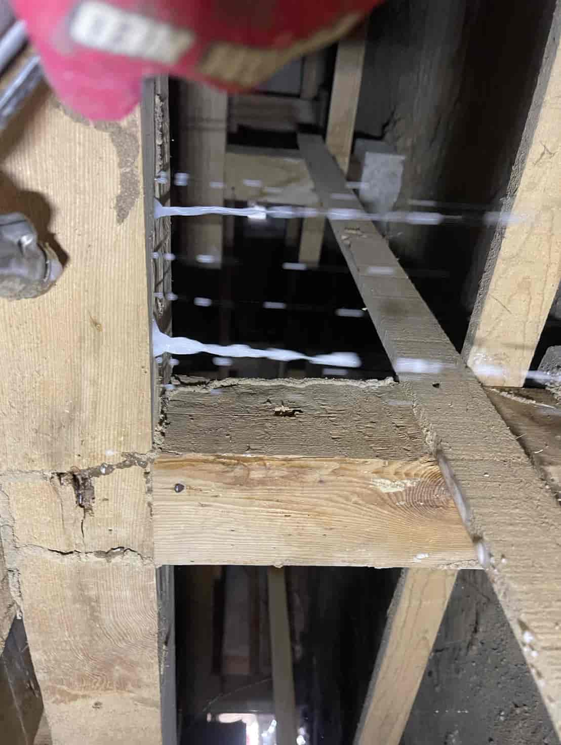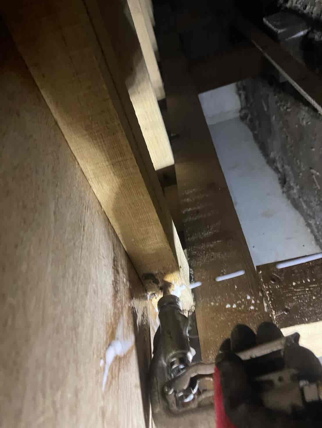 床下に潜り、土台・大引き・根太など白蟻の通り道や被害の疑いがある部分へ穿孔を行います。専用のドリルで一定間隔に小さな穴を開け、内部に白蟻用薬剤を加圧注入することで、目に見えない内部の白蟻にも確実に効果が行き渡るよう処理しました。穿孔後は木栓で穴を綺麗に塞ぎ、構造材の強度に影響が出ないよう仕上げます。押し入れ直下の土台周辺は特に蟻道が多く寄っていたため、重点的に薬剤を浸透させ、既に侵入していた白蟻の駆除と今後の再侵入防止を徹底しました。