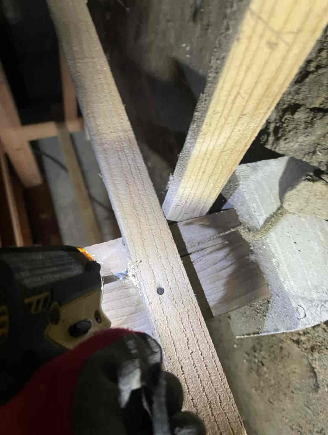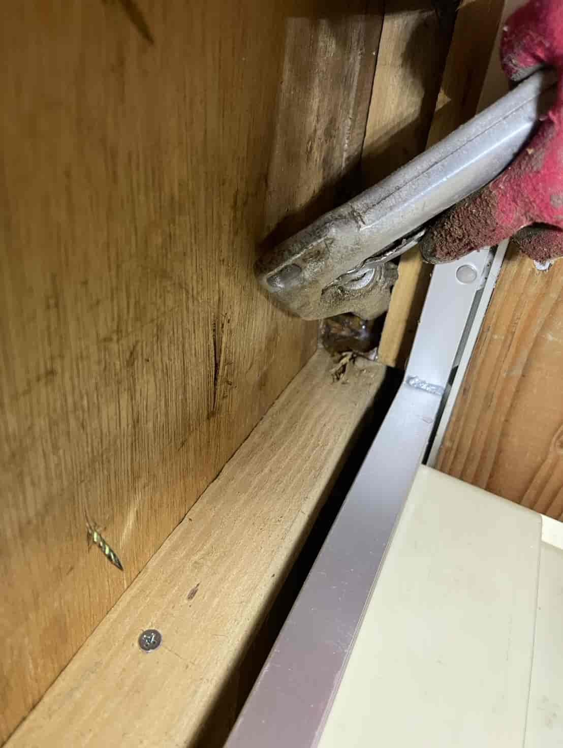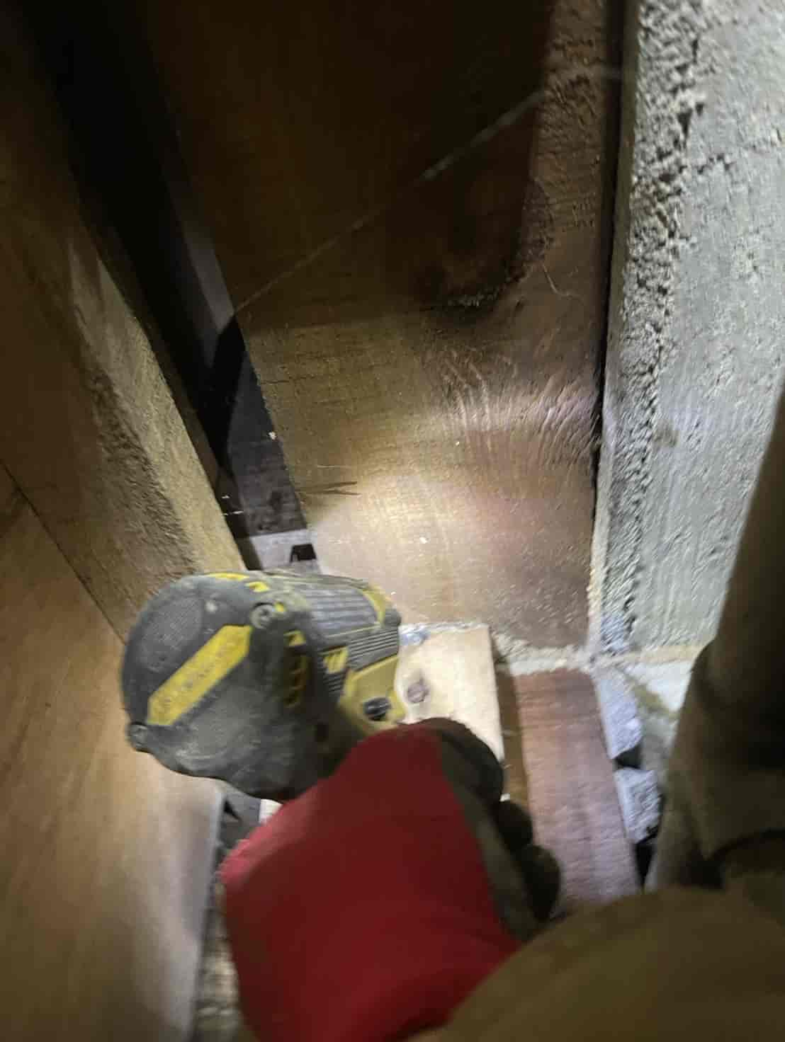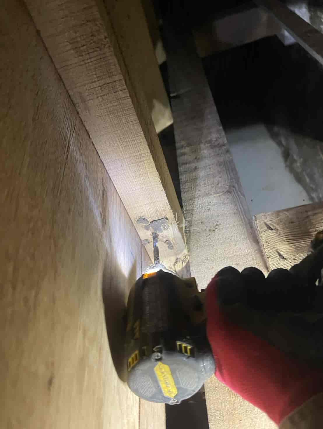 床下に潜り、土台・大引き・根太など白蟻の通り道や被害の疑いがある部分へ穿孔を行います。専用のドリルで一定間隔に小さな穴を開け、内部に白蟻用薬剤を加圧注入することで、目に見えない内部の白蟻にも確実に効果が行き渡るよう処理しました。穿孔後は木栓で穴を綺麗に塞ぎ、構造材の強度に影響が出ないよう仕上げます。押し入れ直下の土台周辺は特に蟻道が多く寄っていたため、重点的に薬剤を浸透させ、既に侵入していた白蟻の駆除と今後の再侵入防止を徹底しました。