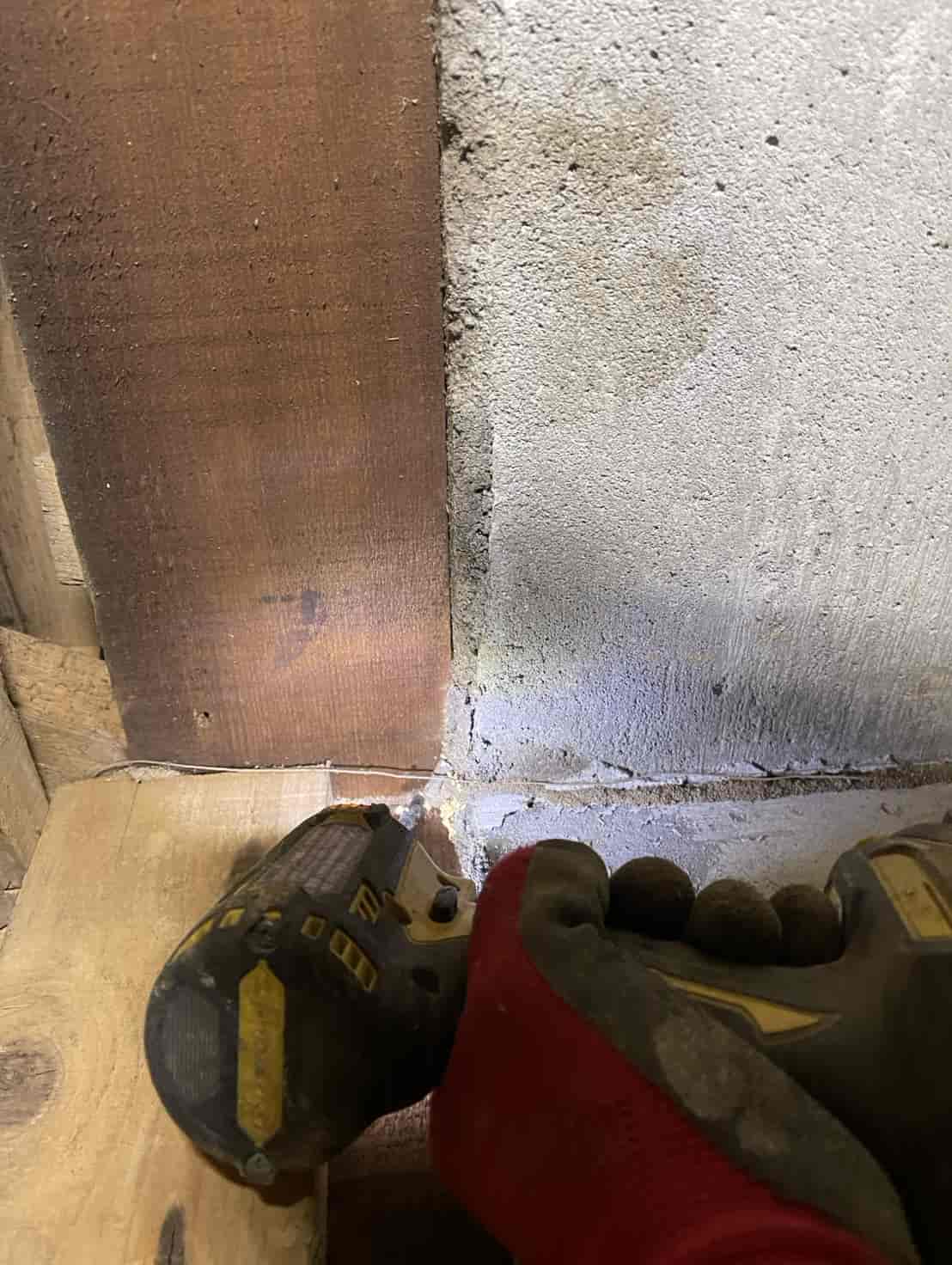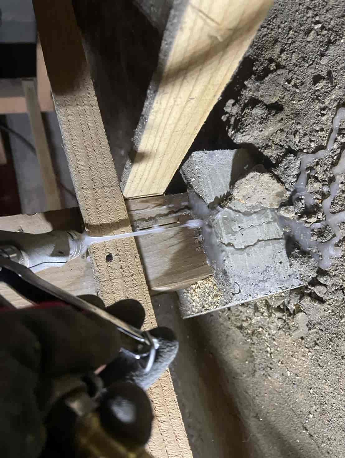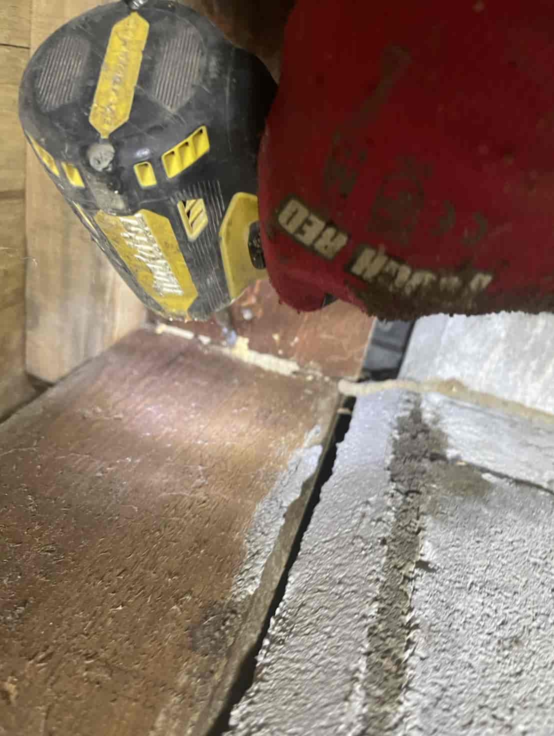 構造材内部まで白蟻が入り込んでいる可能性が高いため、木材の内部に薬剤を確実に浸透させる「穿孔注入工法」を採用。さらに玄関のコンクリート下から上がってきた可能性があるため、基礎内部へ薬剤を送り込むための穿孔注入を実施します。
