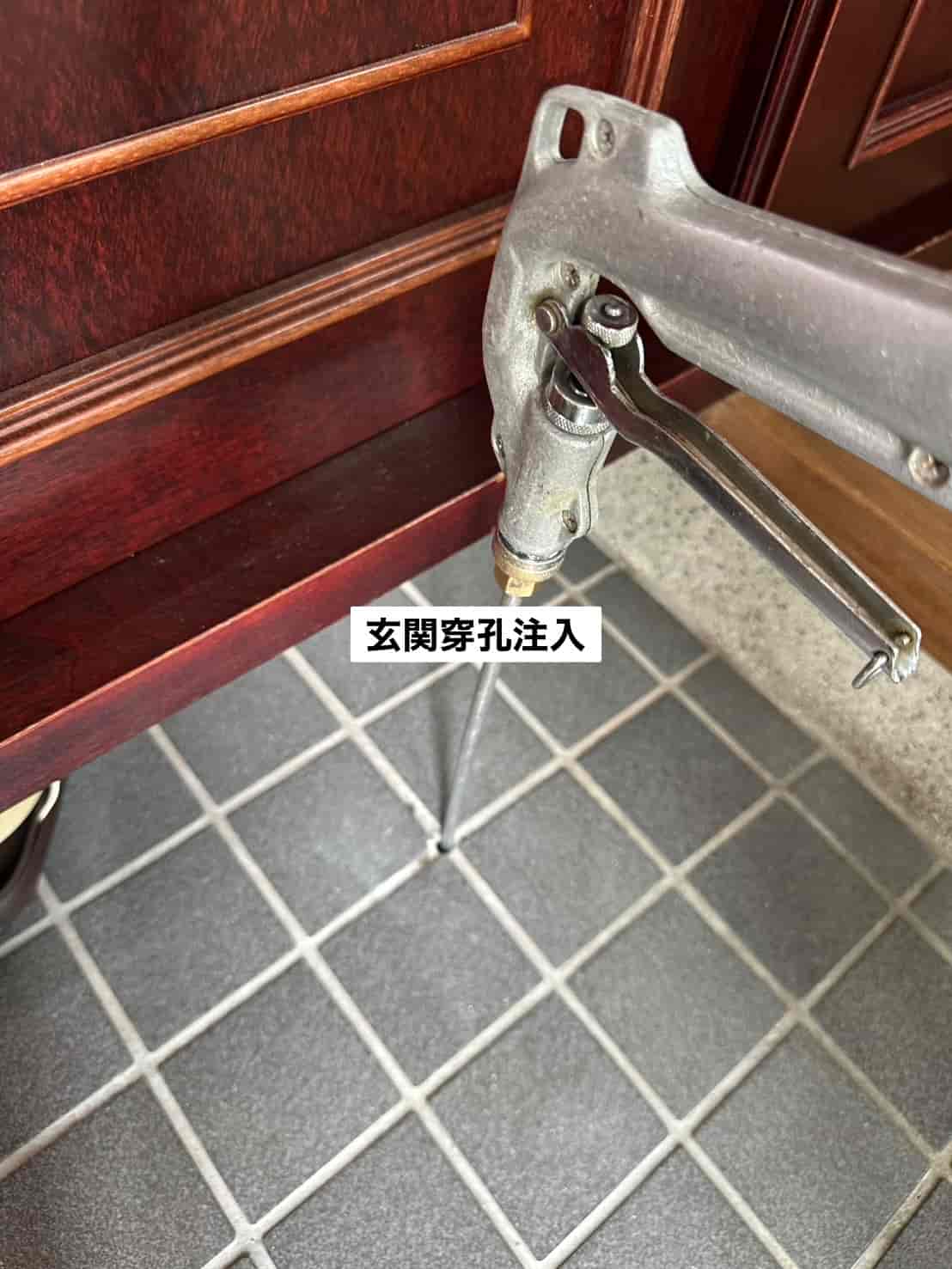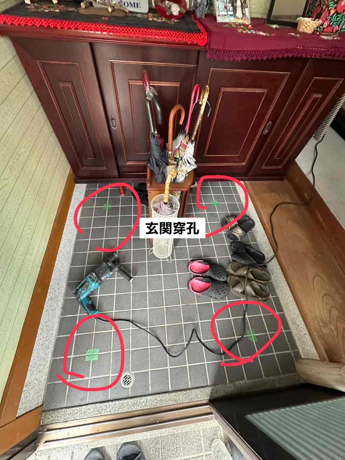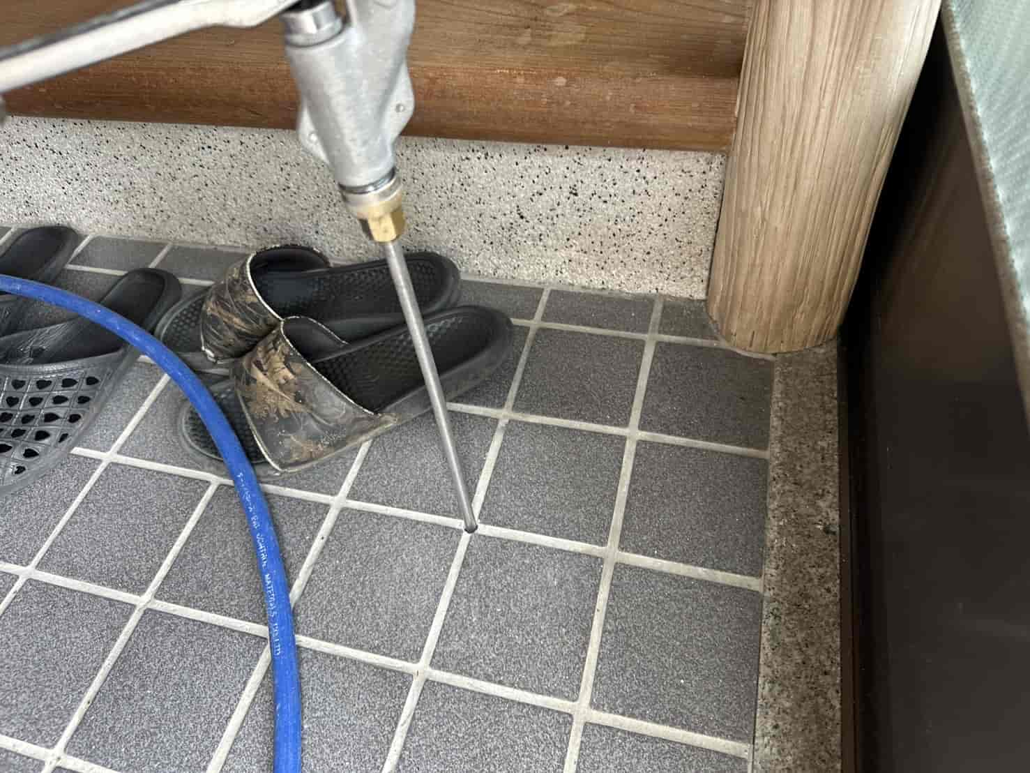 このようなコンクリートスラブの下は湿気が溜まりやすく、白アリが侵入経路として好む場所です。そのため、ここではスラブ穿孔注入を行いました。スラブに専用ドリルで小さな穴を開け、そこから薬剤を注入してスラブ下の土壌に薬剤を届ける工法です。処理後はモルタルで穴を補修し、見た目と強度を保ちます。この処理により、玄関や勝手口からの白アリ侵入リスクを大きく低減できました。