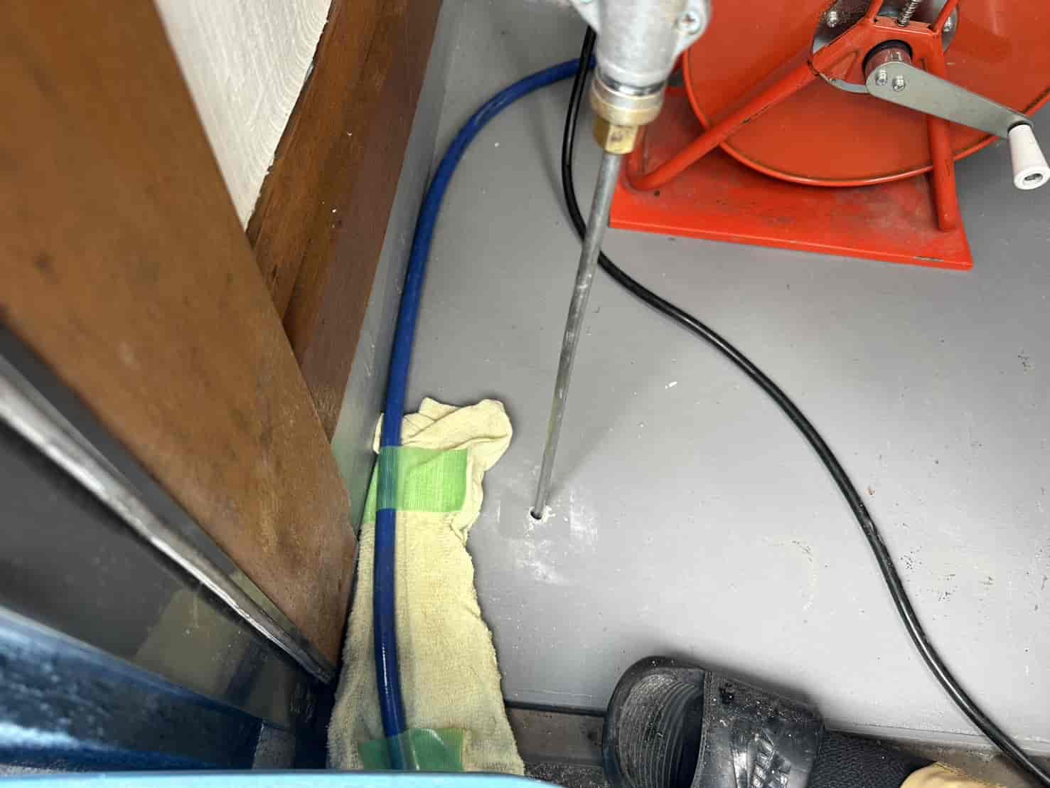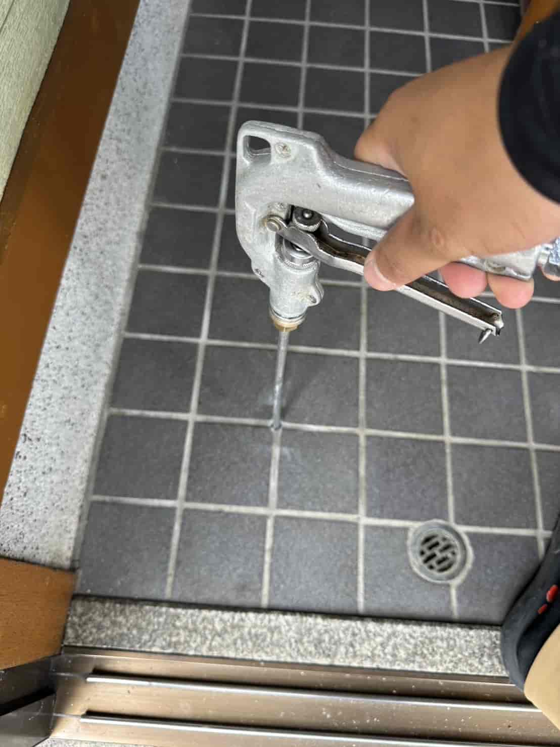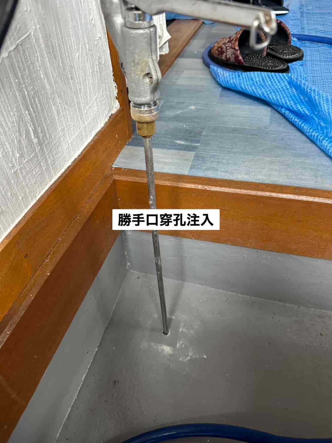 このようなコンクリートスラブの下は湿気が溜まりやすく、白アリが侵入経路として好む場所です。そのため、ここではスラブ穿孔注入を行いました。スラブに専用ドリルで小さな穴を開け、そこから薬剤を注入してスラブ下の土壌に薬剤を届ける工法です。処理後はモルタルで穴を補修し、見た目と強度を保ちます。この処理により、玄関や勝手口からの白アリ侵入リスクを大きく低減できました。