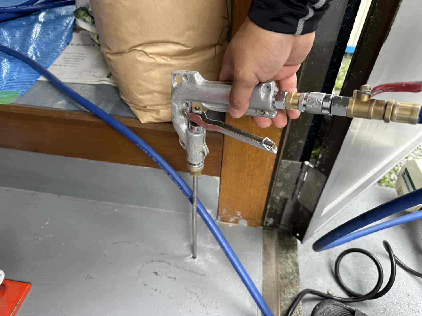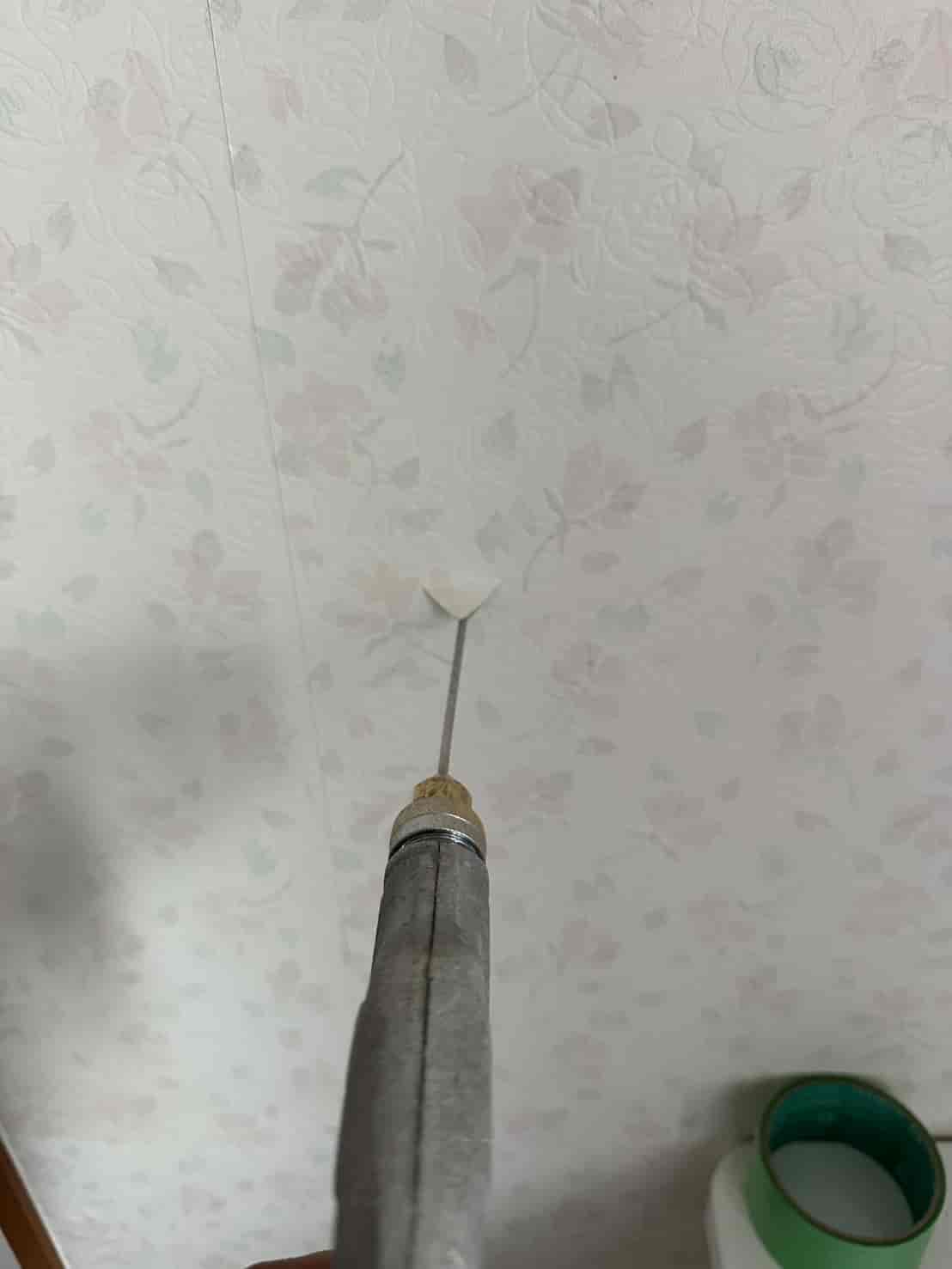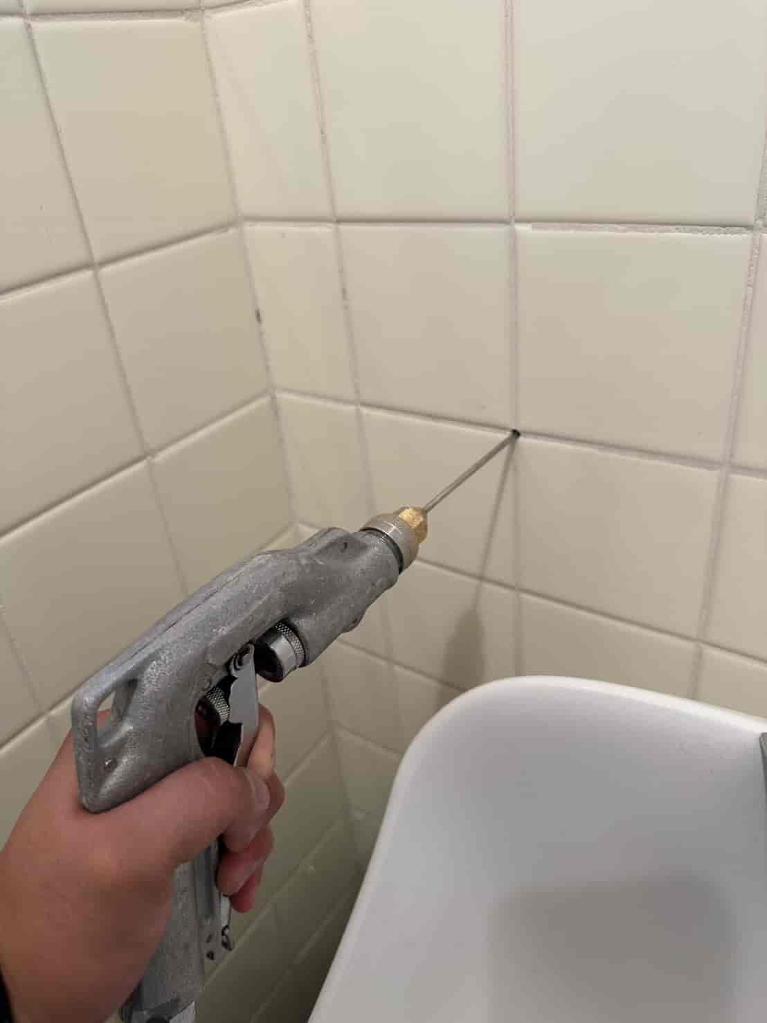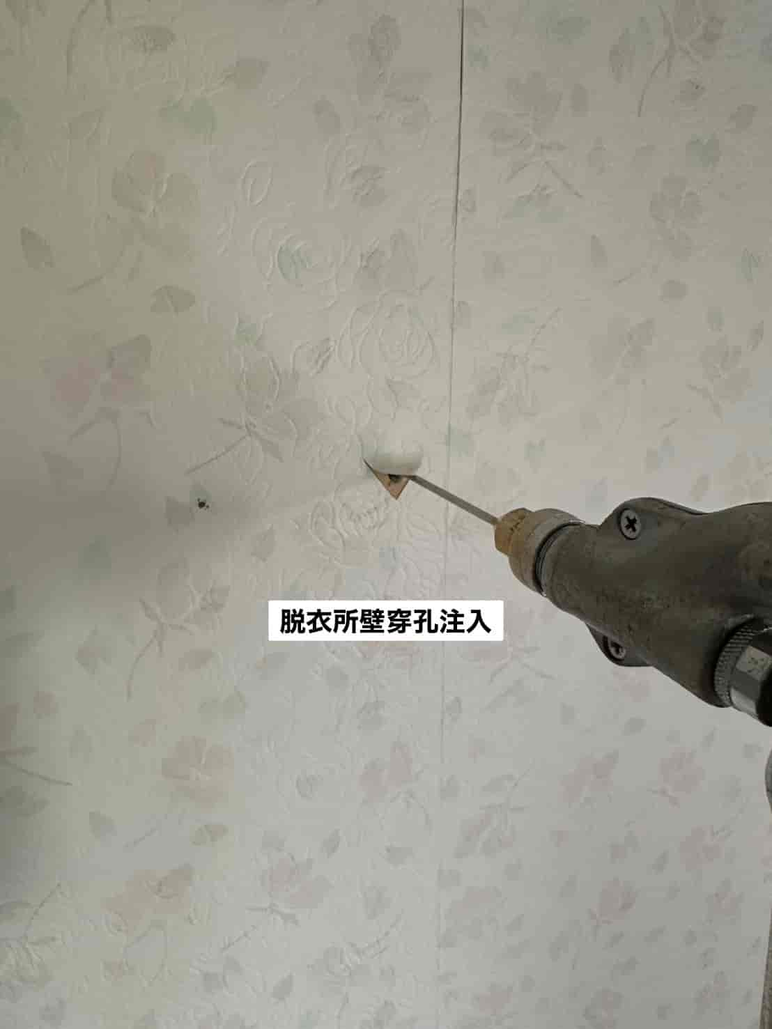 壁内部は外から見えないため、被害が進行していても気づきにくい場所です。そこで、壁穿孔注入を実施しました。壁面に最小限の穴を開け、専用ノズルを使って内部の木部や断熱材付近に薬剤を均一に注入します。壁内に潜む白アリを駆除すると同時に、壁全体を防蟻処理することで再発を防ぐことができます。穿孔した穴は最終的に目立たないように補修を行い、美観を保ちながら施工を終えました。